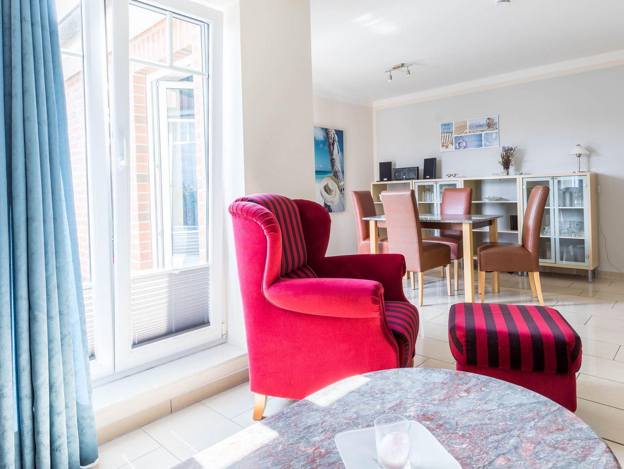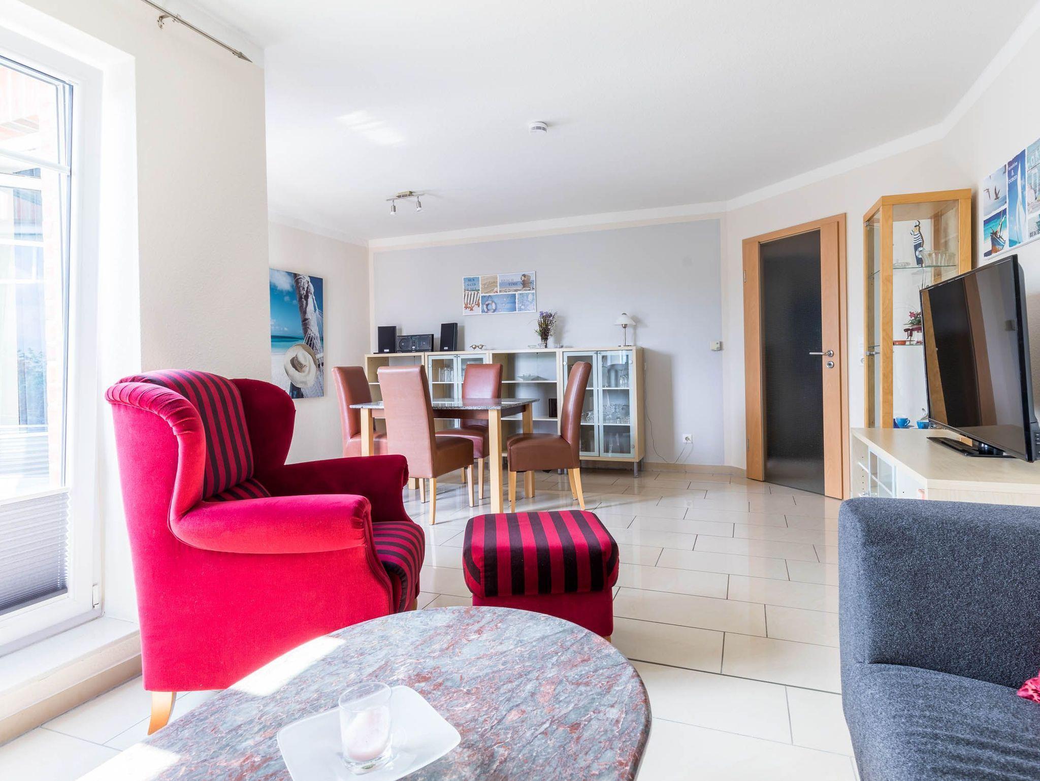 Das Wohnzimmer bietet eine gemütliche Möblierung und einen separaten Essbereich. SAT-TV und Musikanlage sorgen hier für Unterhaltung.