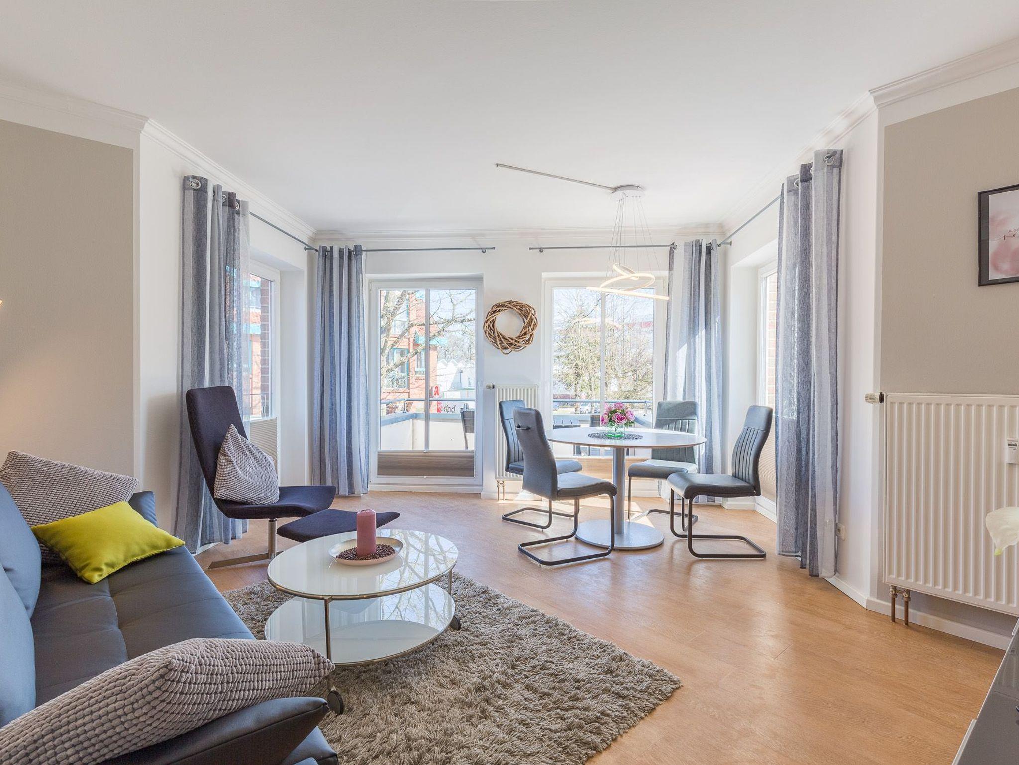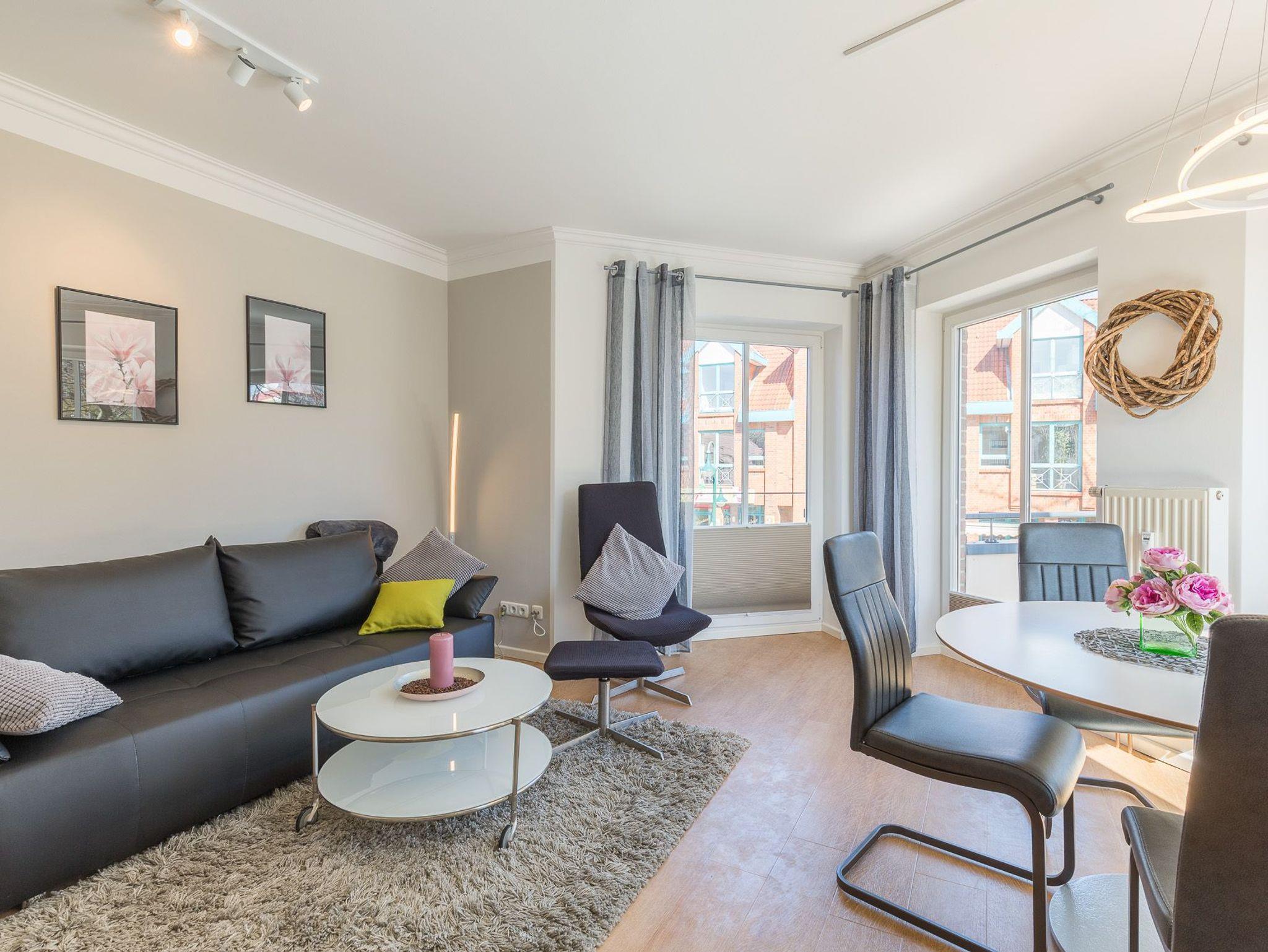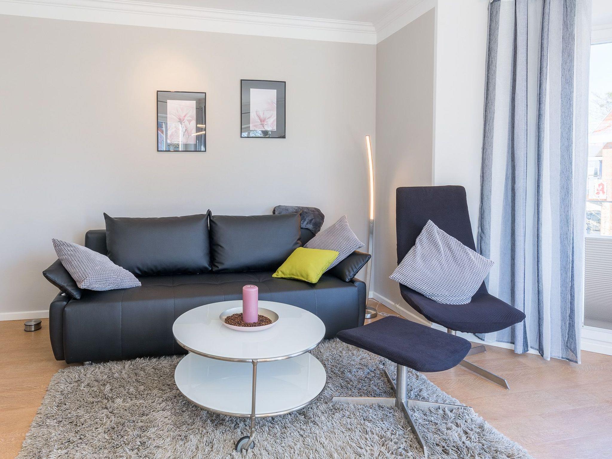 Vom großzügig geschnittenen, hell möblierten Eingangsbereich führt Sie der Weg direkt ins moderne Wohnzimmer mit Essbereich. Der große Flatscreen-TV, ein DVD-Player und ein CD-Player sorgen für Ihre Unterhaltung. Die Wohnung hat einen Internetzugang über WLAN. Bodentiefe Fenster bringen viel Licht in den Wohnraum. Sie lassen sich mit den vorhandenen Plissees verdunkeln. Vom Wohnbereich aus erreichen Sie den östlich ausgerichteten Balkon mit modernen Balkonmöbeln. Die Doppelschlafcouch im Wohnbereich nutzen Sie mit ihrer Liegefläche von 1,40 m Breite als Doppelbett.