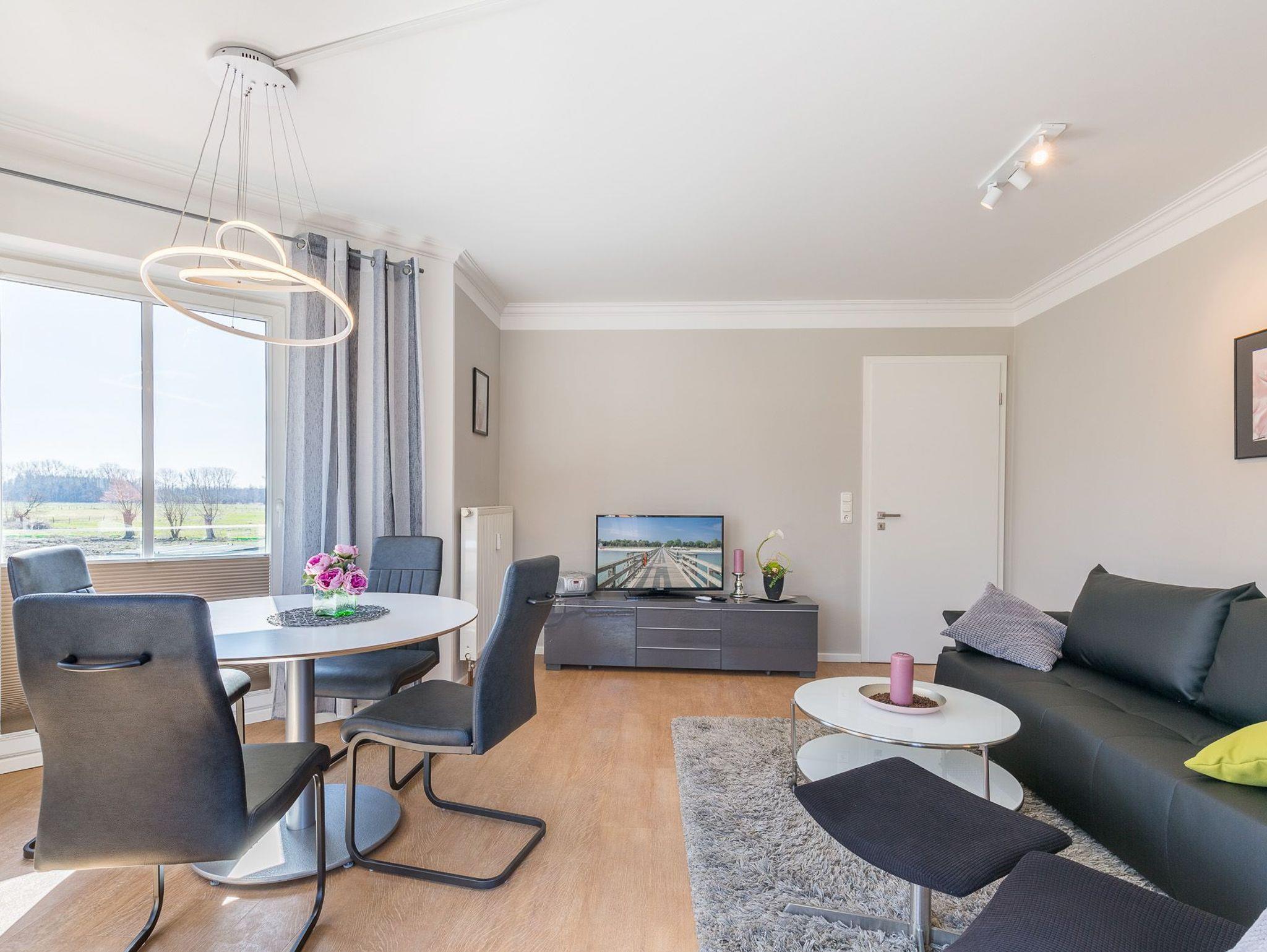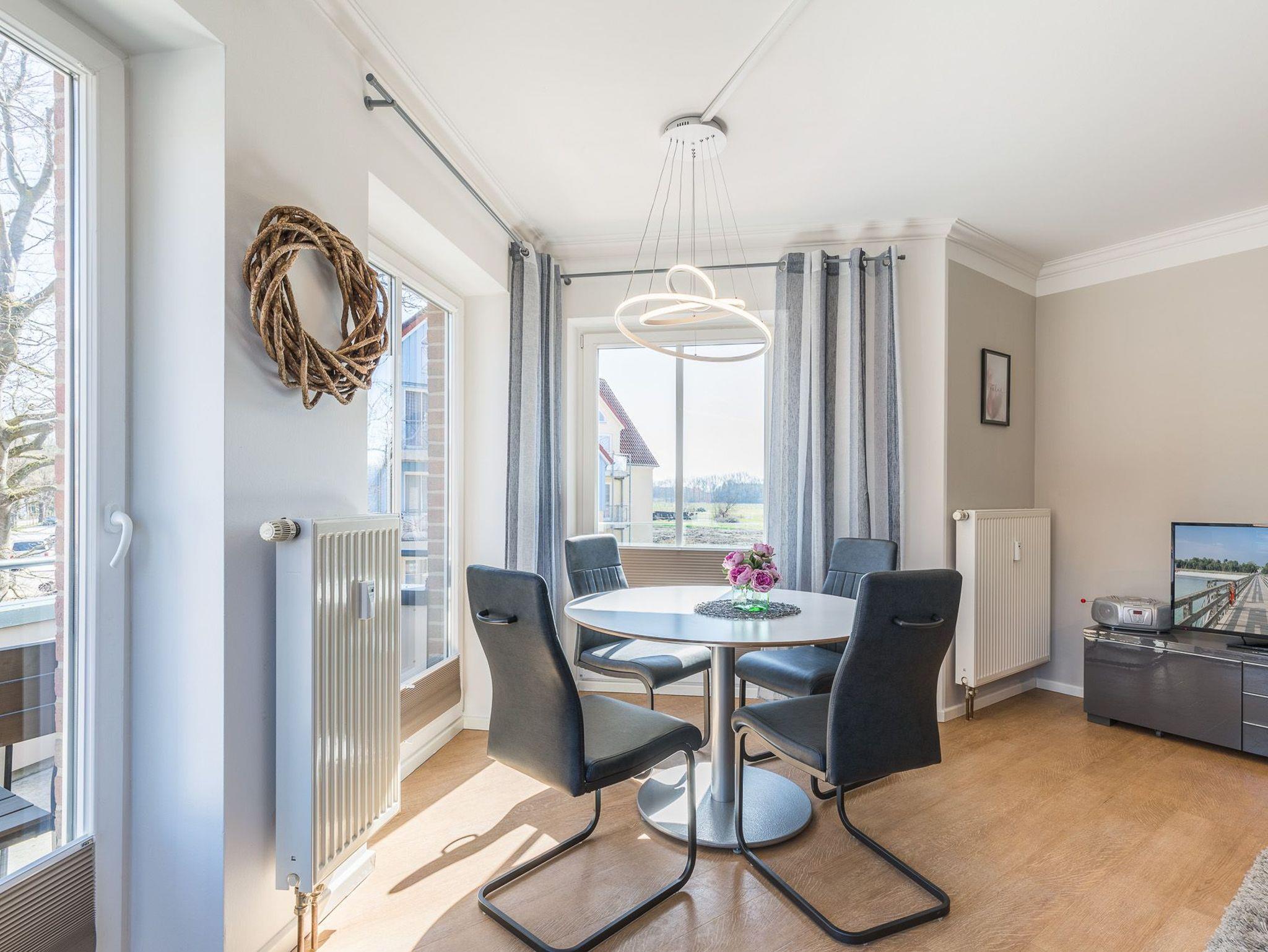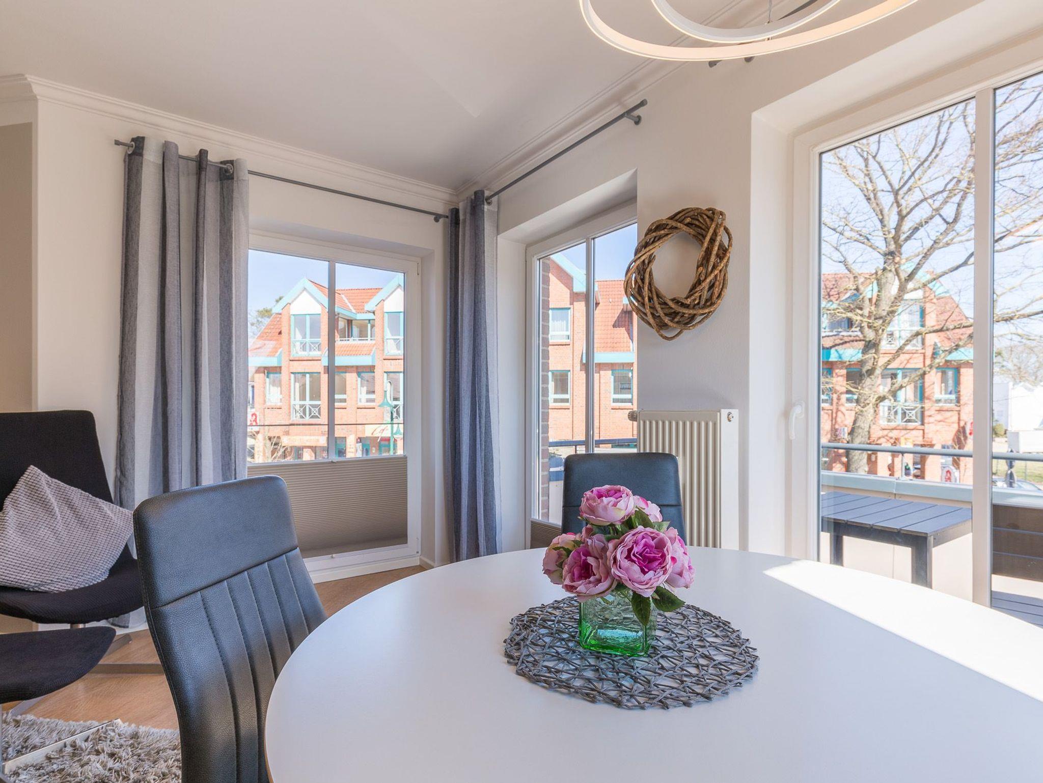 Vom großzügig geschnittenen, hell möblierten Eingangsbereich führt Sie der Weg direkt ins moderne Wohnzimmer mit Essbereich. Der große Flatscreen-TV, ein DVD-Player und ein CD-Player sorgen für Ihre Unterhaltung. Die Wohnung hat einen Internetzugang über WLAN. Bodentiefe Fenster bringen viel Licht in den Wohnraum. Sie lassen sich mit den vorhandenen Plissees verdunkeln. Vom Wohnbereich aus erreichen Sie den östlich ausgerichteten Balkon mit modernen Balkonmöbeln. Die Doppelschlafcouch im Wohnbereich nutzen Sie mit ihrer Liegefläche von 1,40 m Breite als Doppelbett.