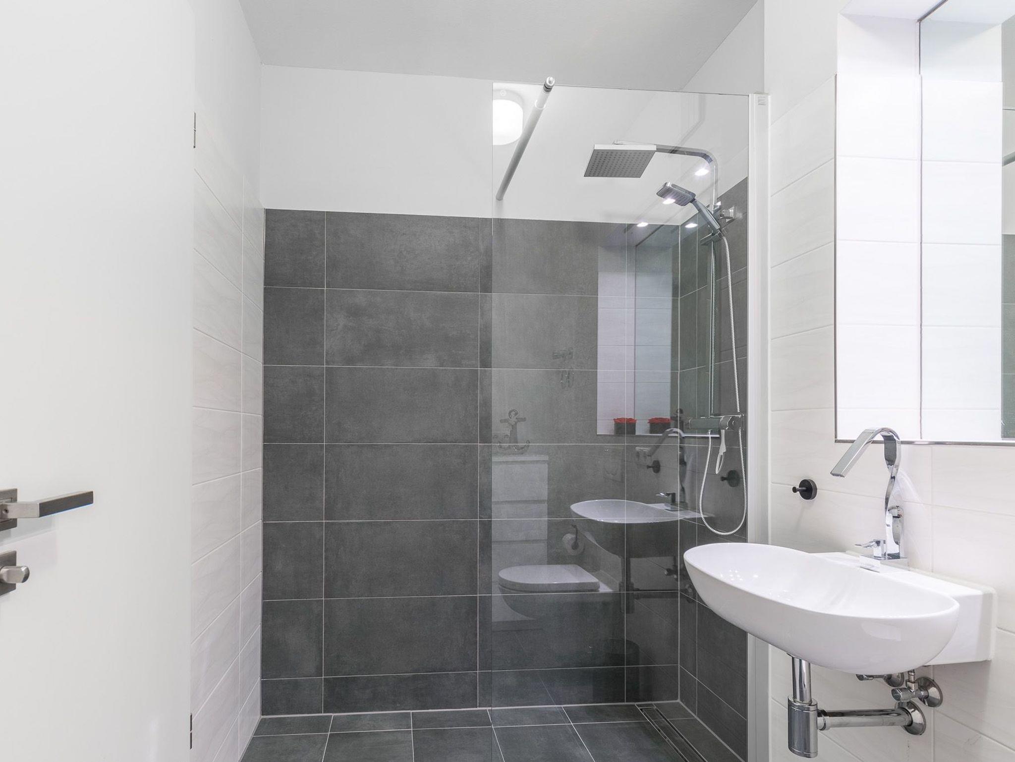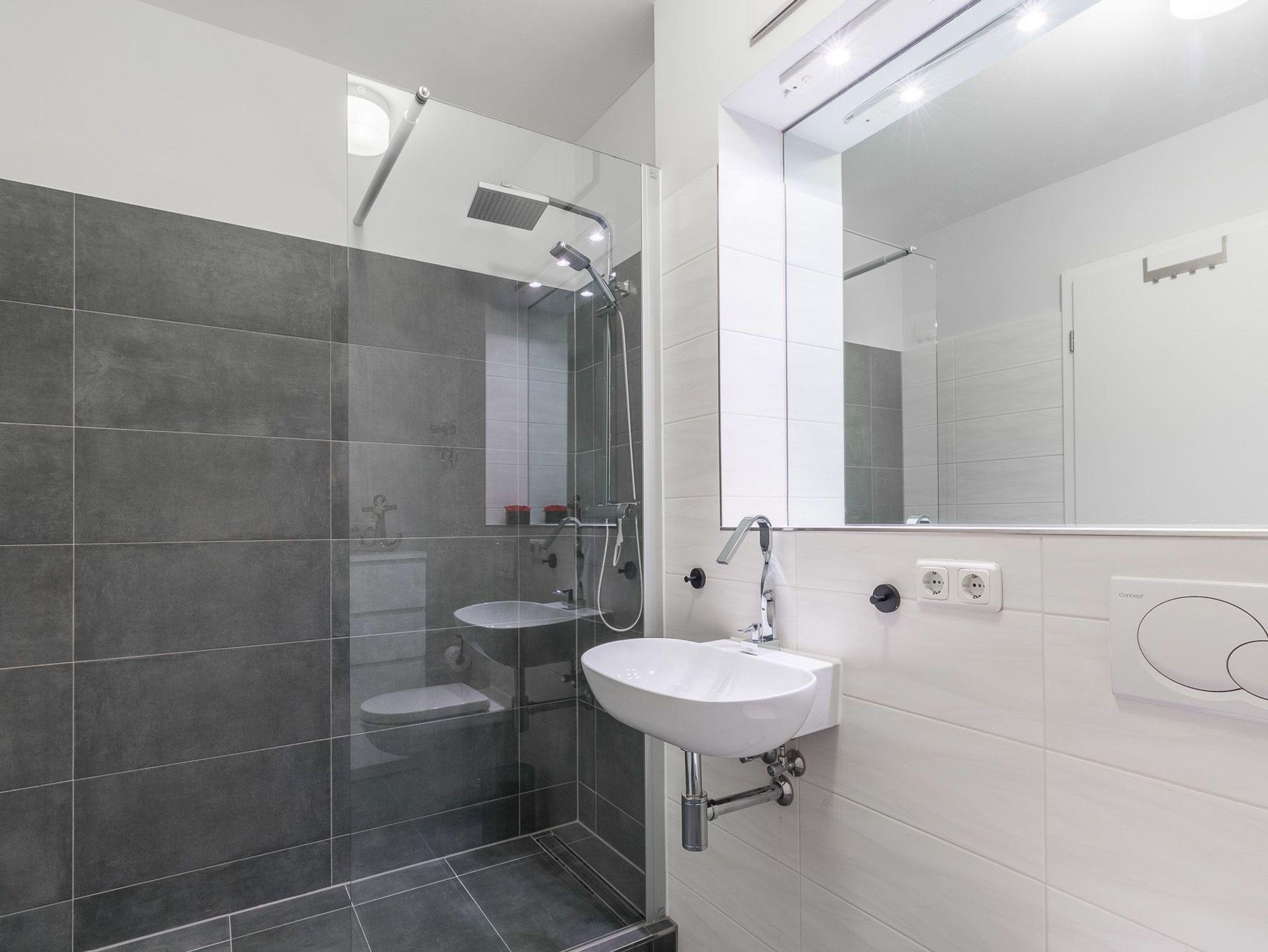 In modernen Grautönen gefliest ist die barrierefreie Walk-In Dusche ist. Sie bietet viel Platz und angenehmes Duschvergnügen nach dem Tag am Strand.