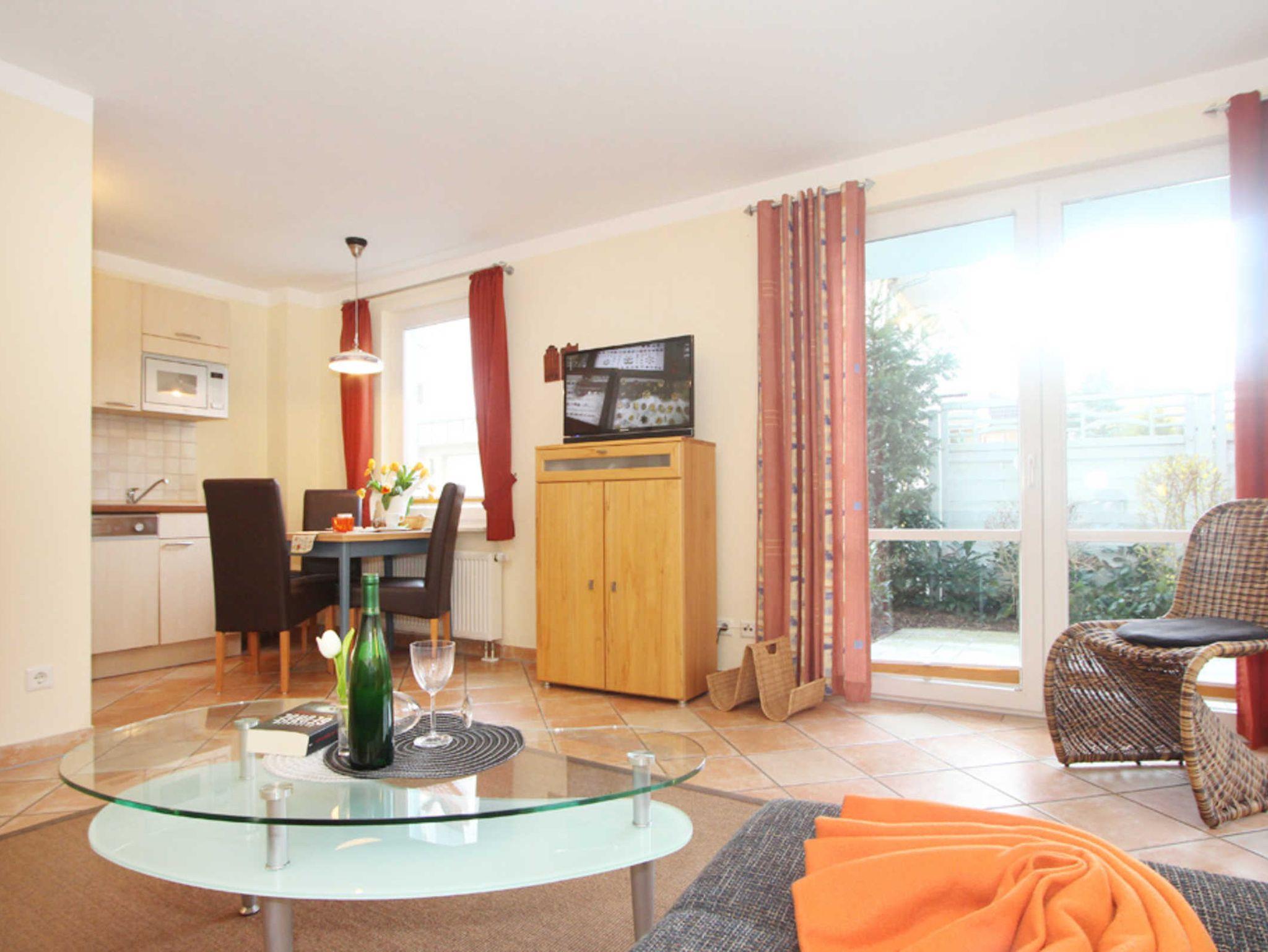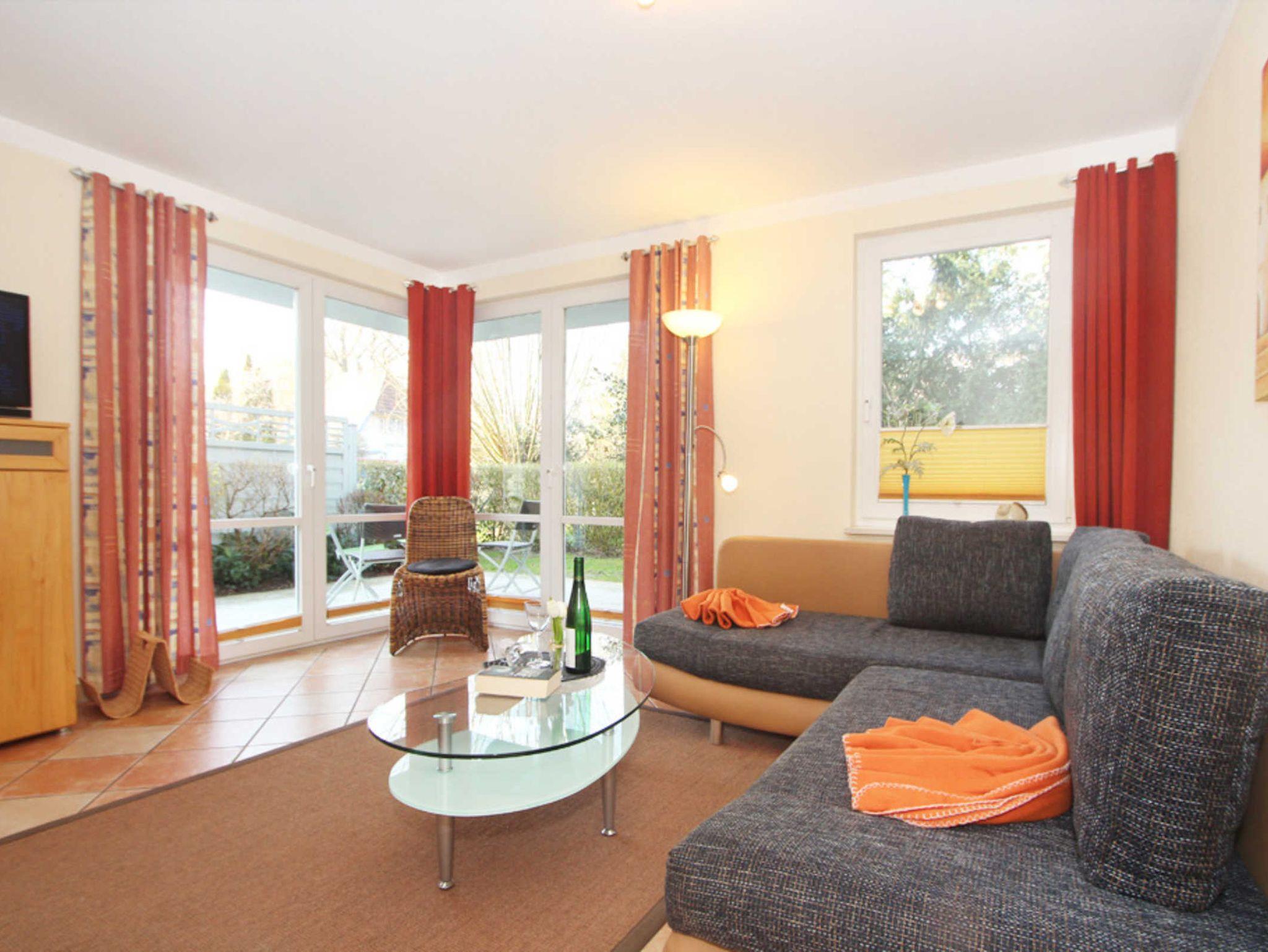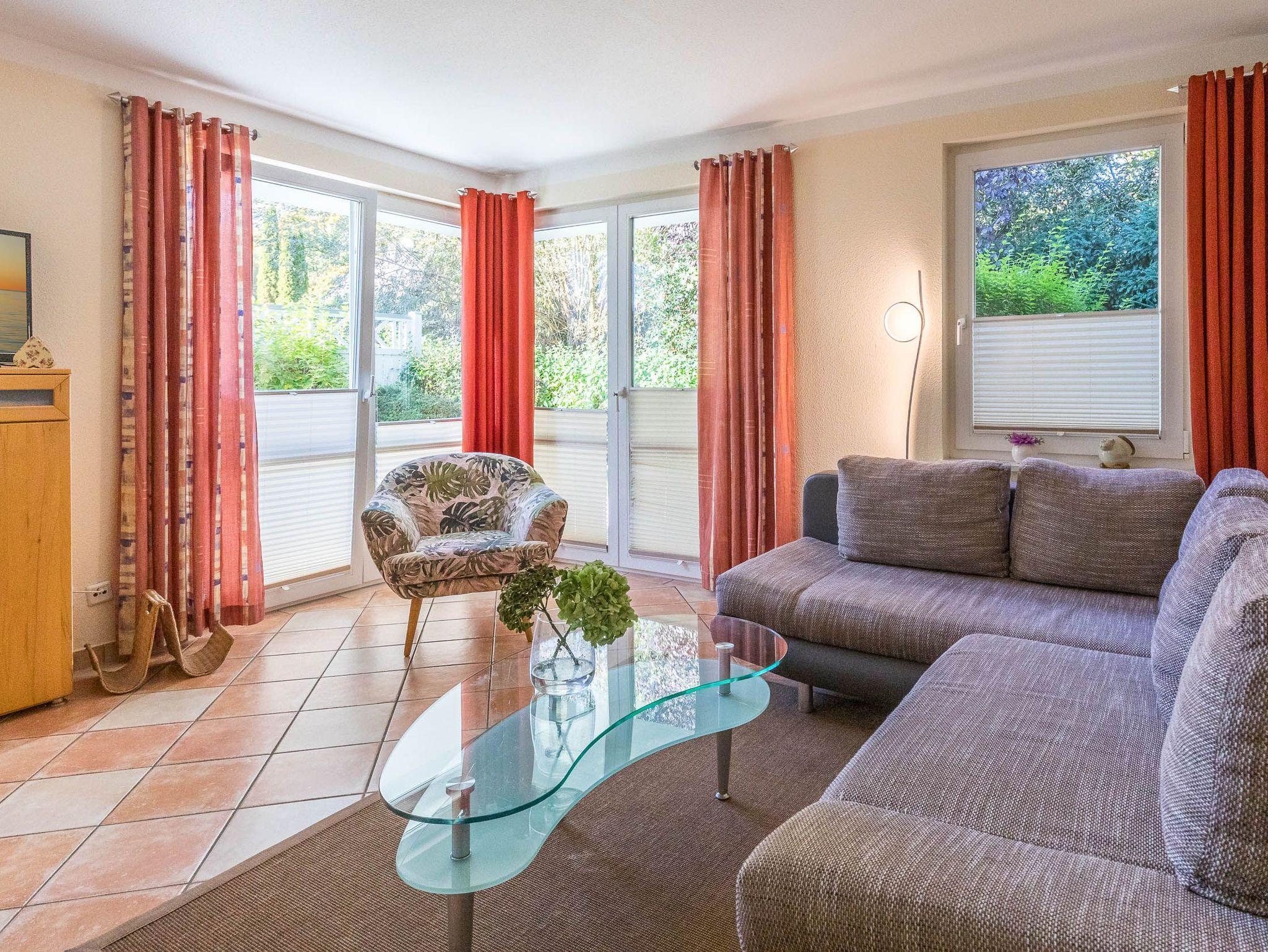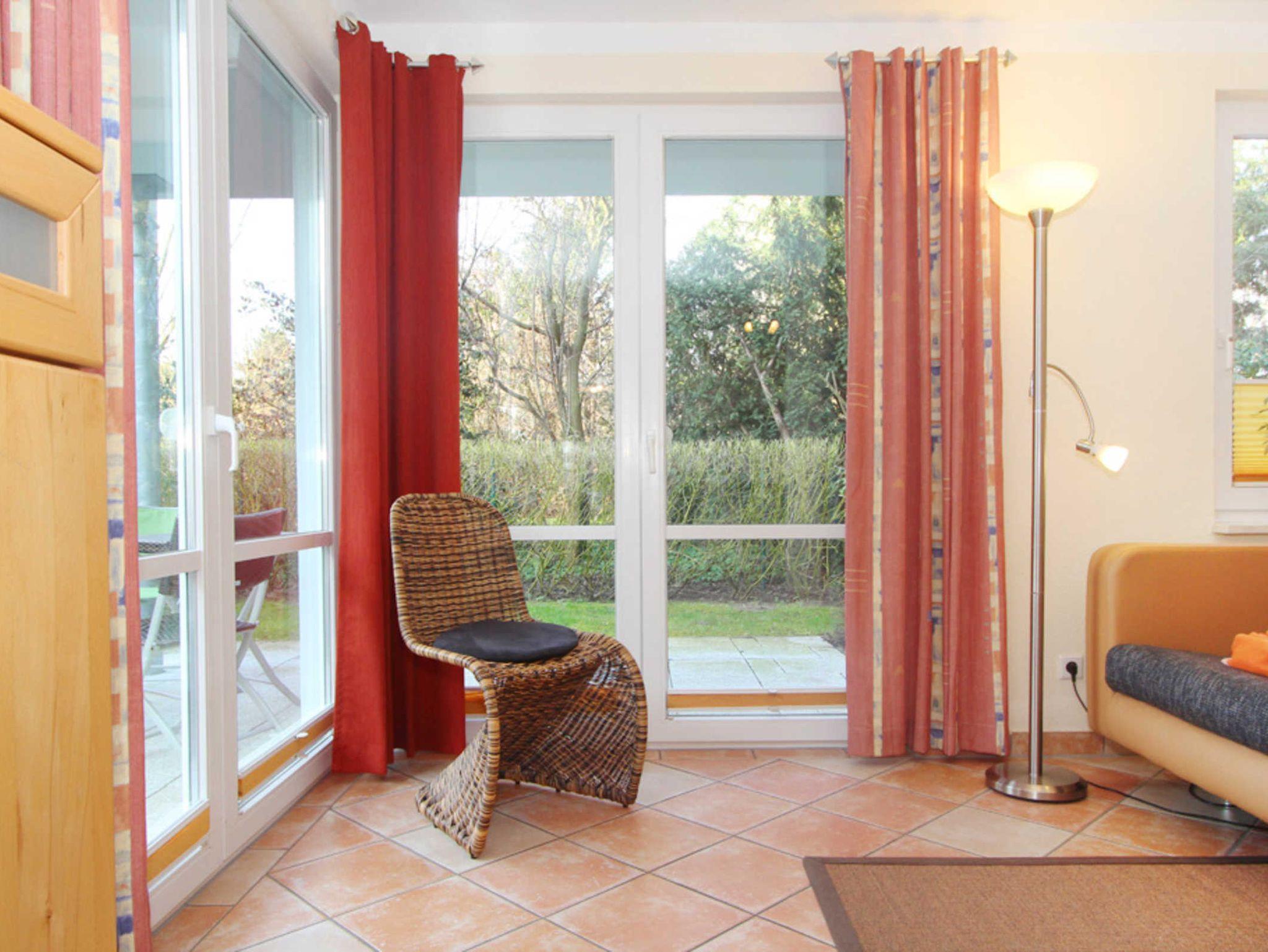 Sie verfügt über einen großzügig geschnittenen Wohnbereich mit gemütlicher Sofalandschaft und einem direkten Zugang auf die möblierte, etwas sichtgeschützte Nordwest/ Nordost-Eckterrasse. Es besteht die Möglichkeit, auf der ausziehbaren Schlafcouch im Wohnzimmer eine Person unterzubringen. SAT-TV, DVD-Player, Musikanlage sowie diverse Gesellschaftsspiele sorgen hier für Ihre Unterhaltung.