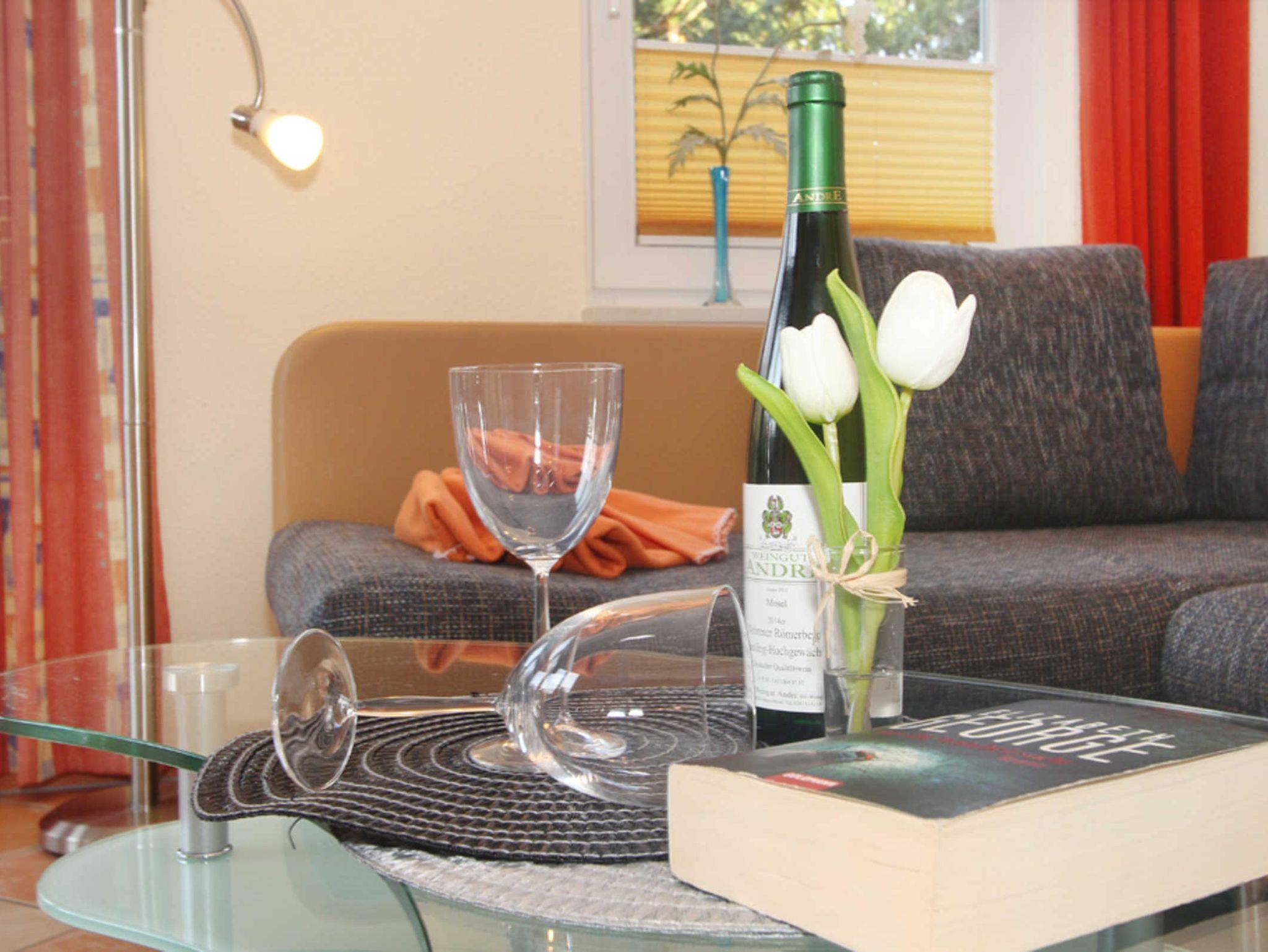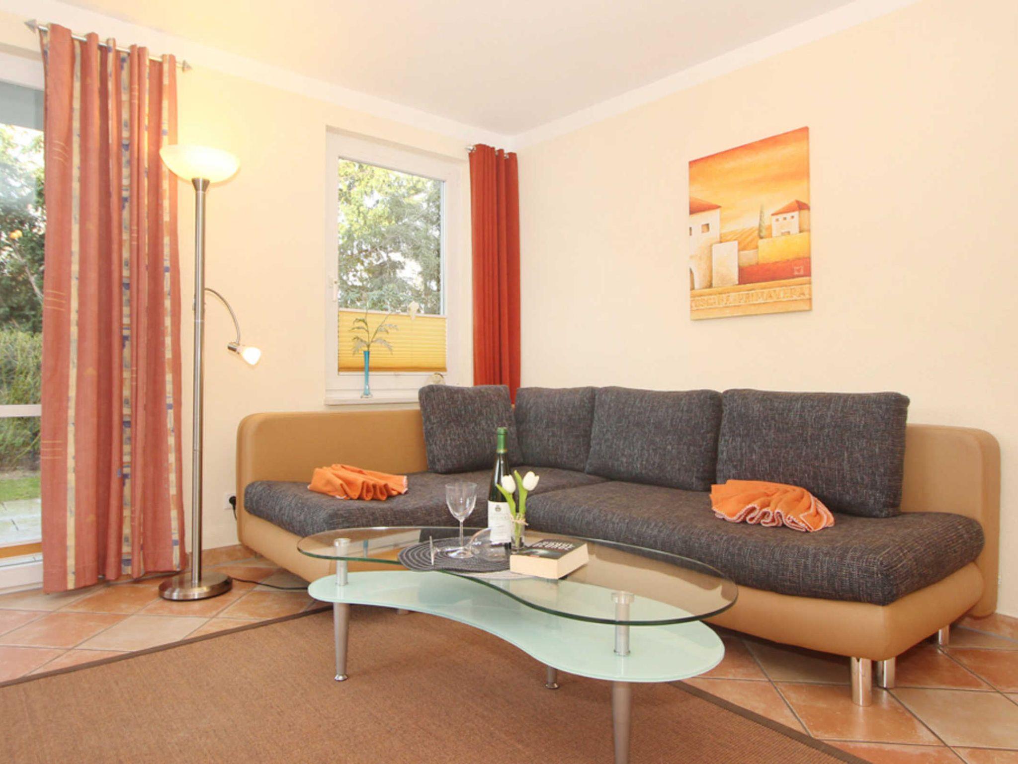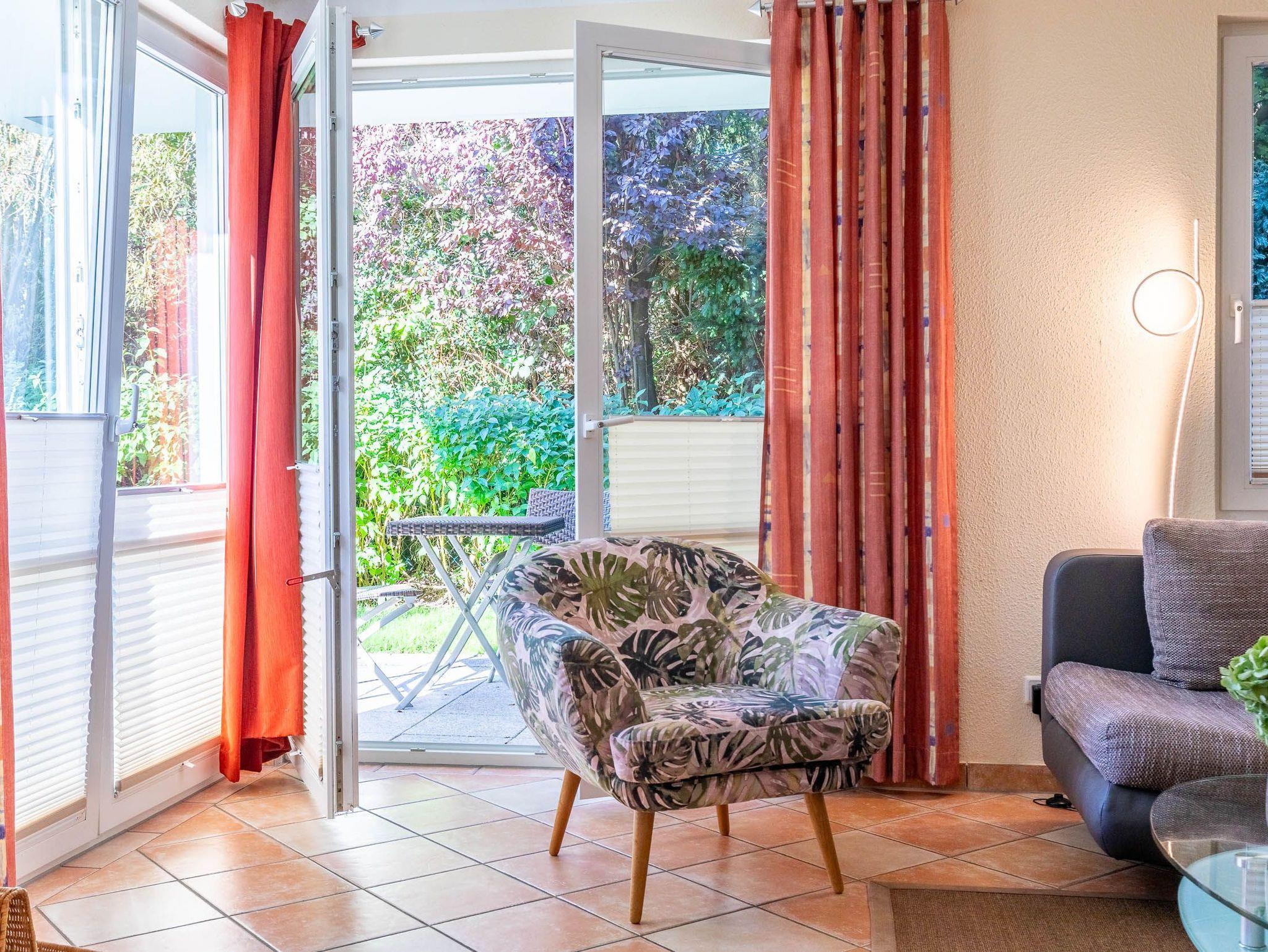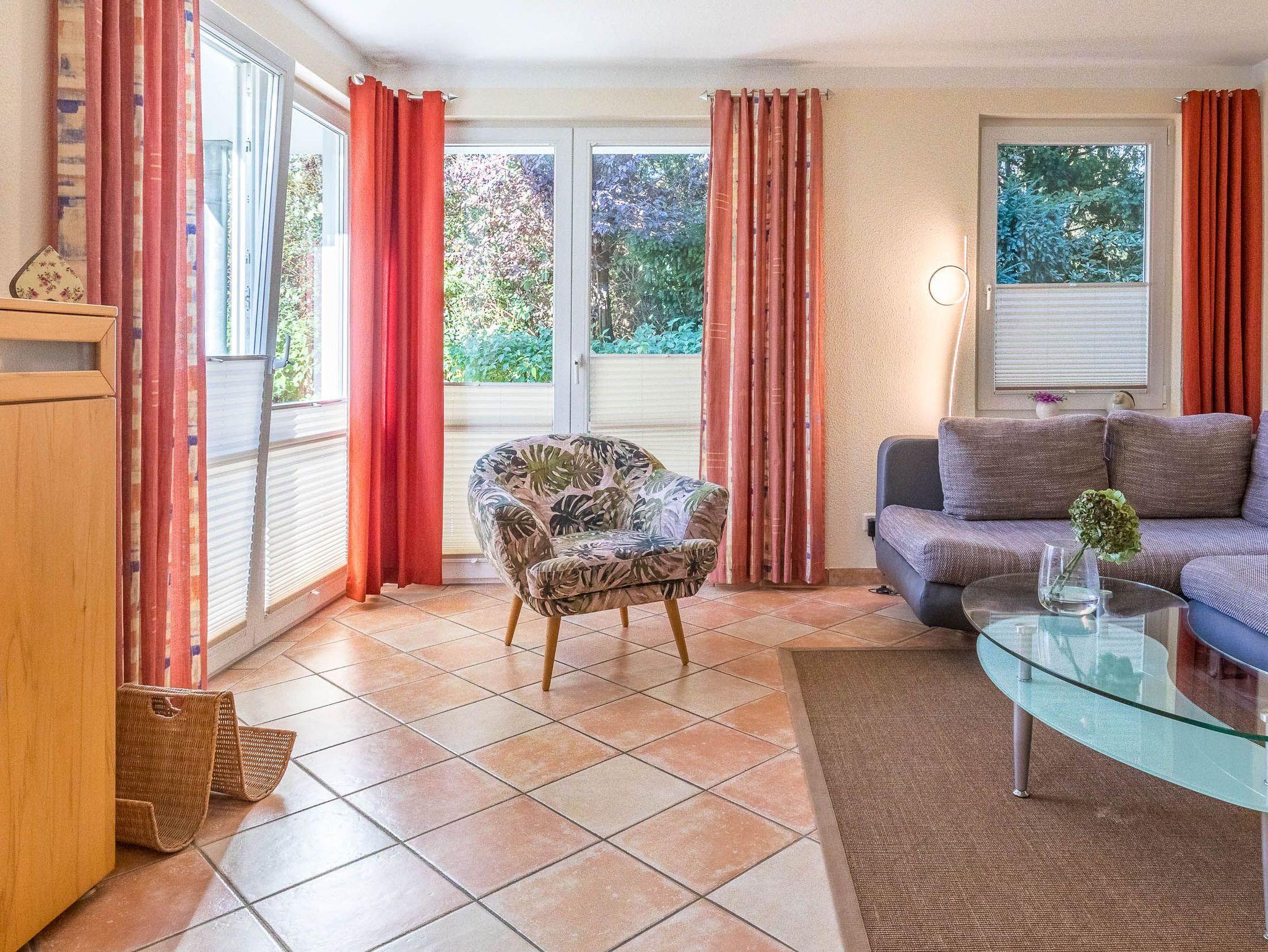 Sie verfügt über einen großzügig geschnittenen Wohnbereich mit gemütlicher Sofalandschaft und einem direkten Zugang auf die möblierte, etwas sichtgeschützte Nordwest/ Nordost-Eckterrasse. Es besteht die Möglichkeit, auf der ausziehbaren Schlafcouch im Wohnzimmer eine Person unterzubringen. SAT-TV, DVD-Player, Musikanlage sowie diverse Gesellschaftsspiele sorgen hier für Ihre Unterhaltung.