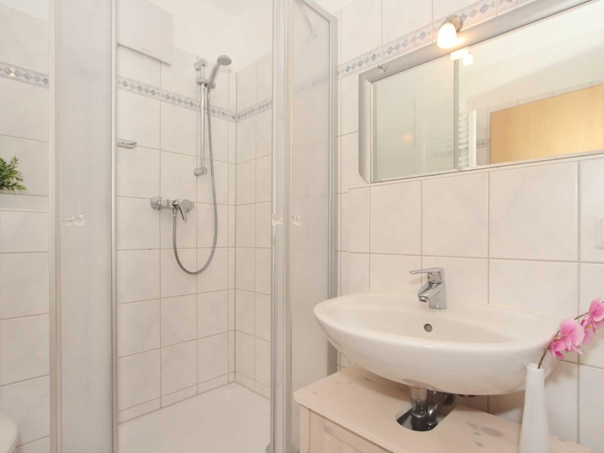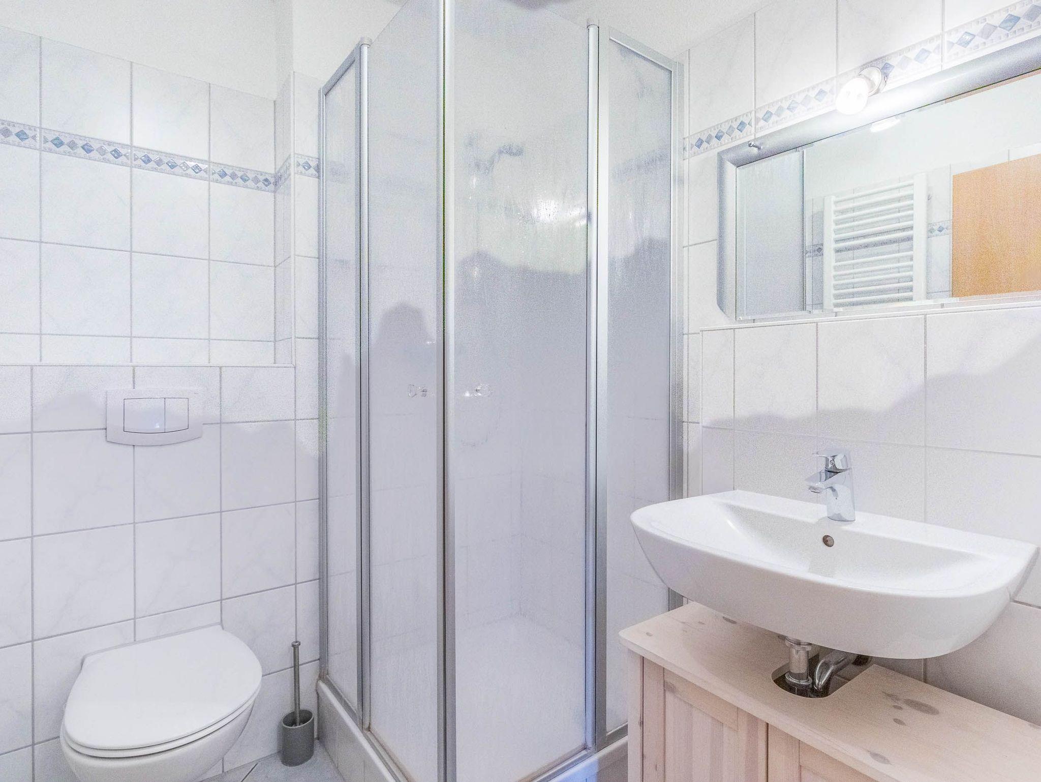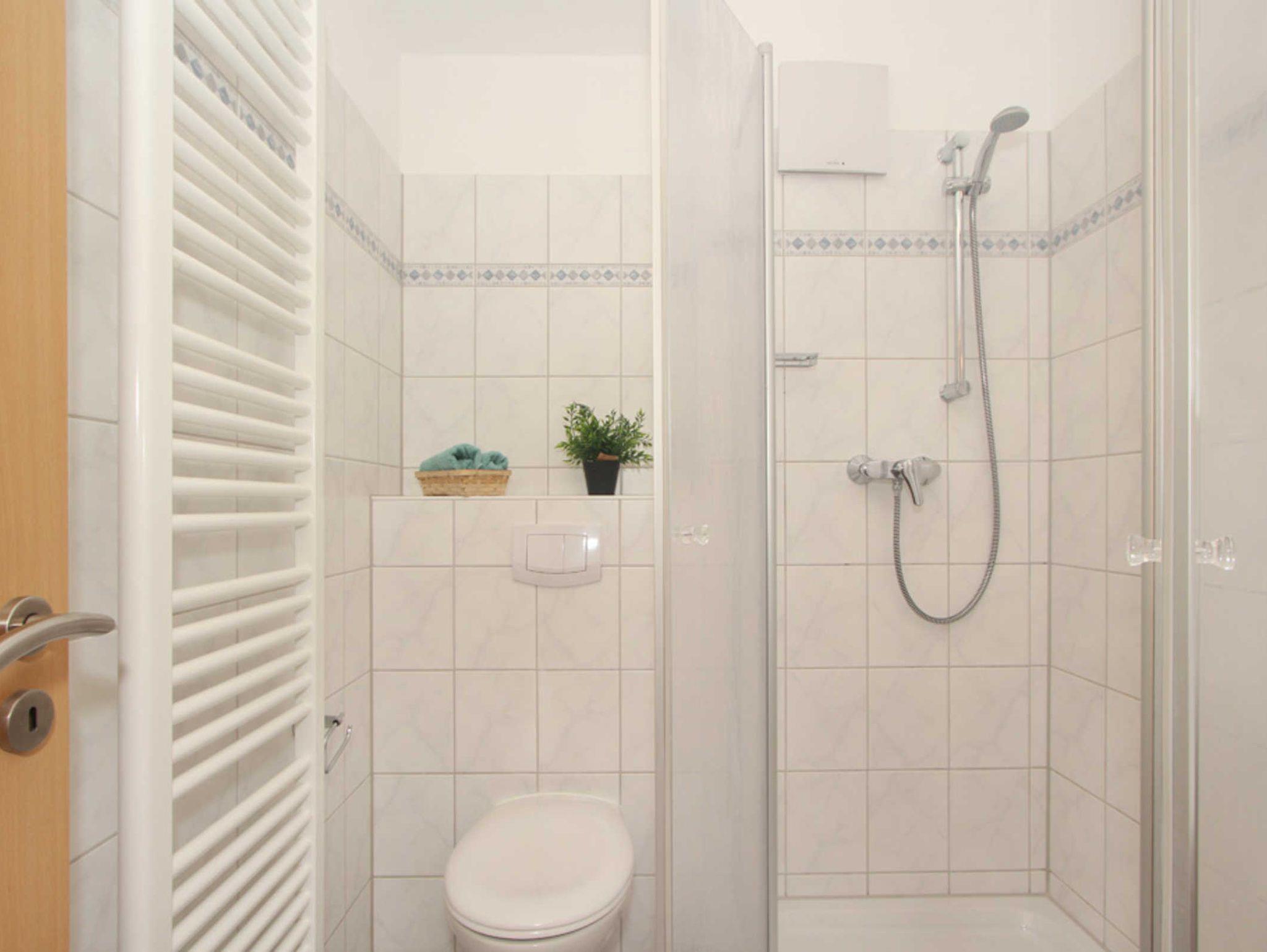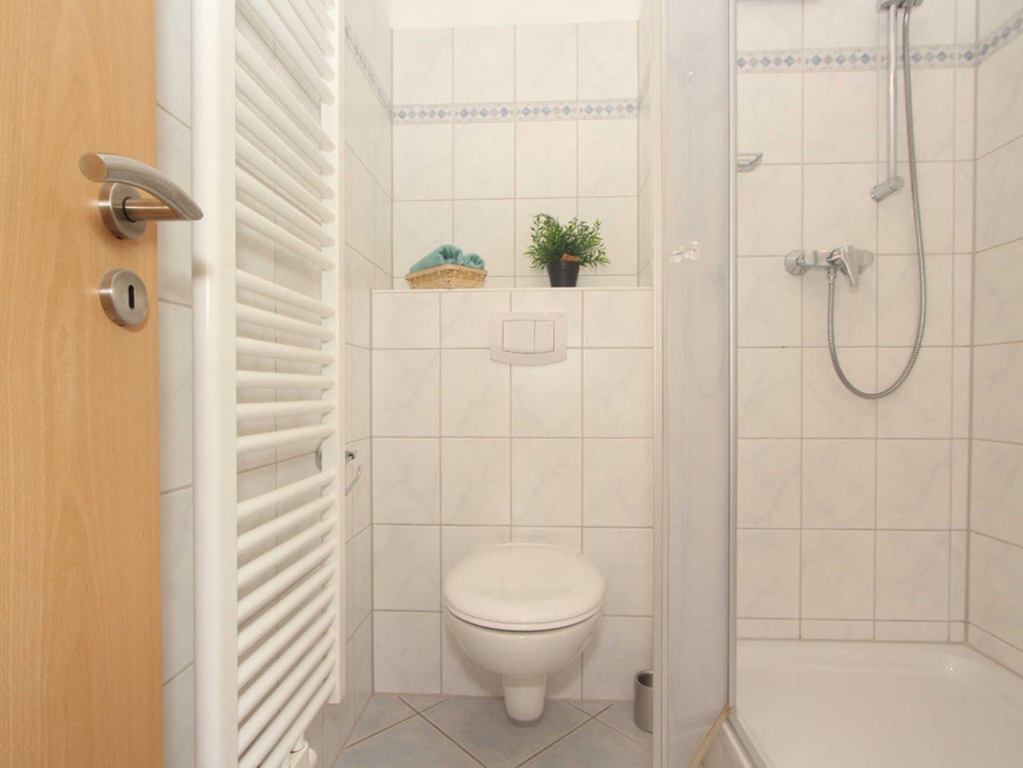 Das hell gefliestes Bad mit Dusche und WC mit Fußbodenheizung komplettiert die u.a. auch seniorenfreundliche Unterkunft. Eine Handtuchheizung sorgt hier auf Wunsch für mollig warme Frotteewäsche.