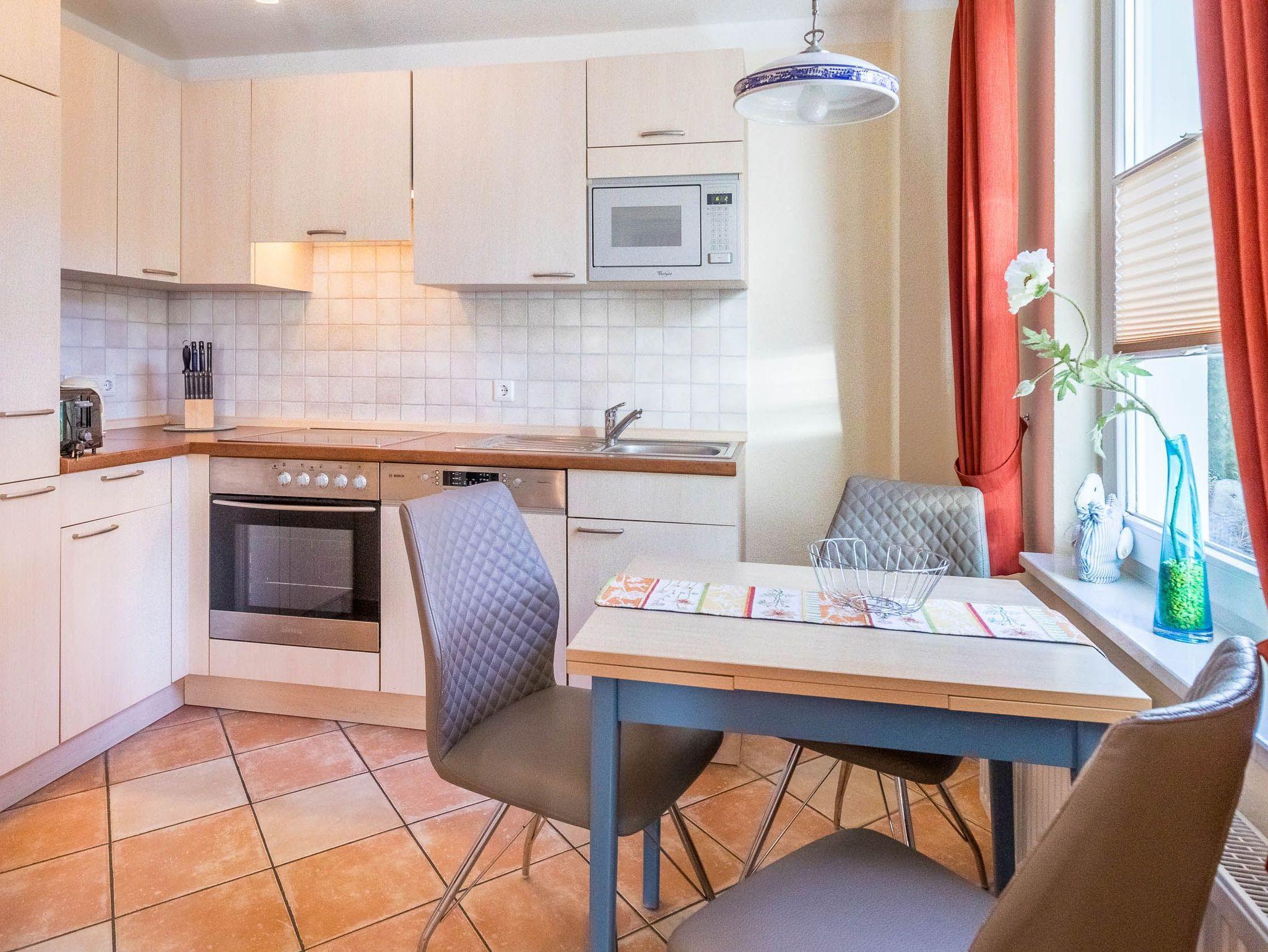 Die gut ausgestattete, offene Küche lädt zum gemeinsamen Kochen und Essen ein. Für Ihre Selbstverpflegung stehen u.a. ein Kühlschrank mit Gefrierfach, Backofen, Herd mit Ceranfeld, Geschirrspüler, Mikrowelle uvm. zur Verfügung. Ihre Mahlzeiten können Sie gemeinsam an der separaten Essecke einnehmen.