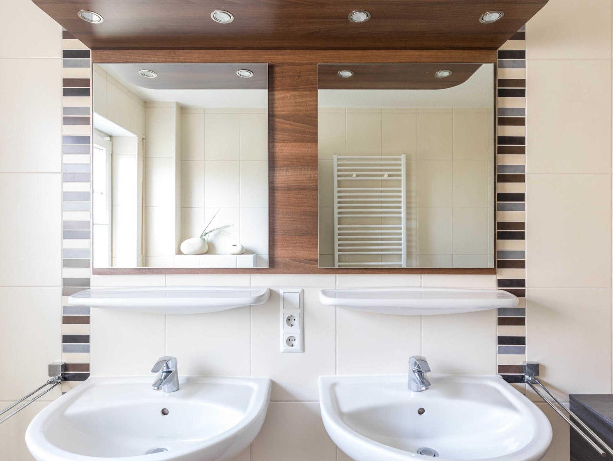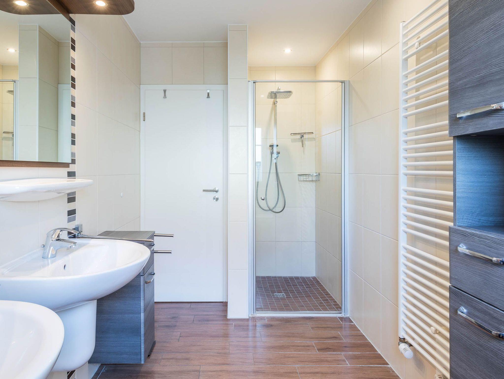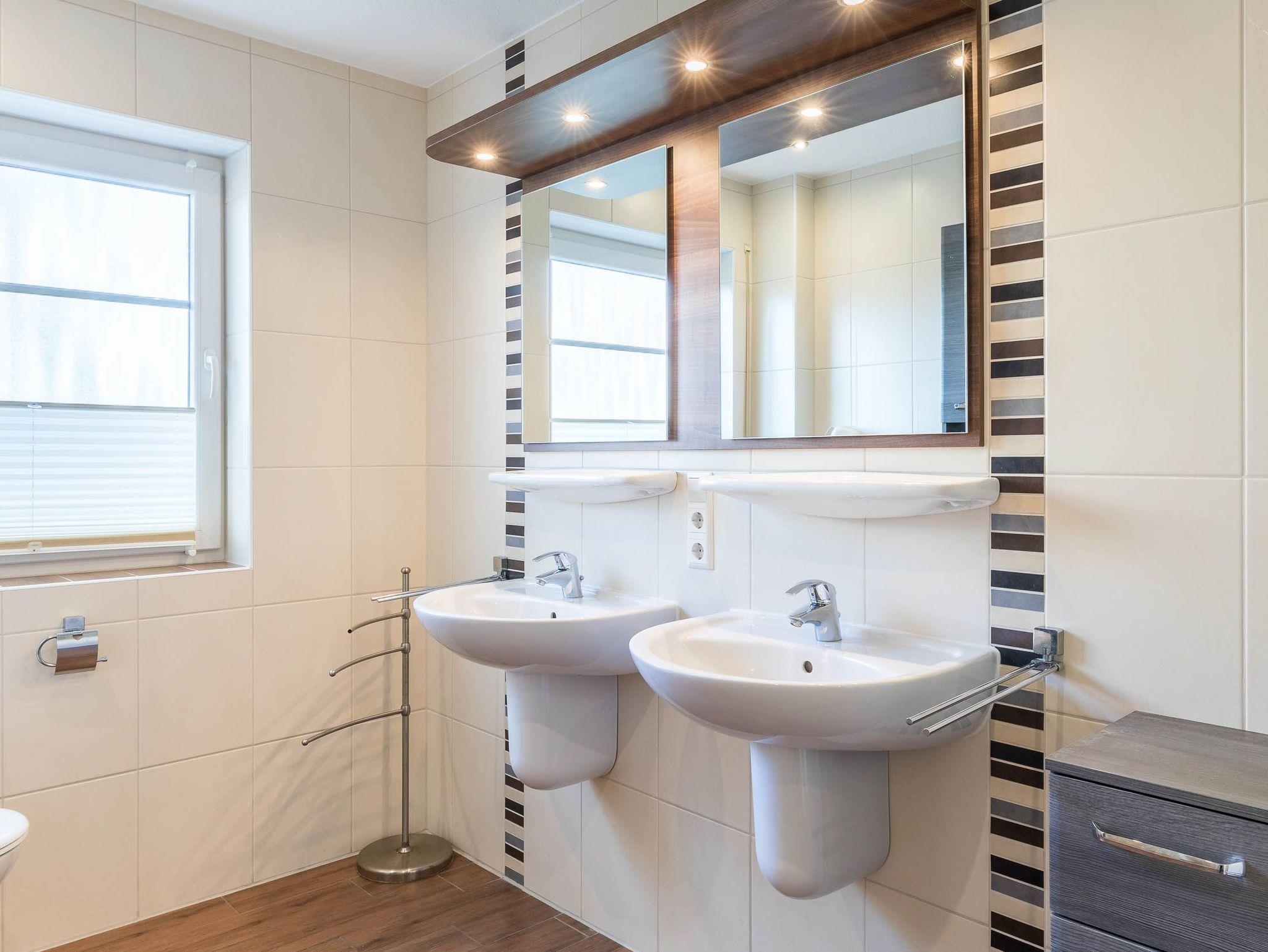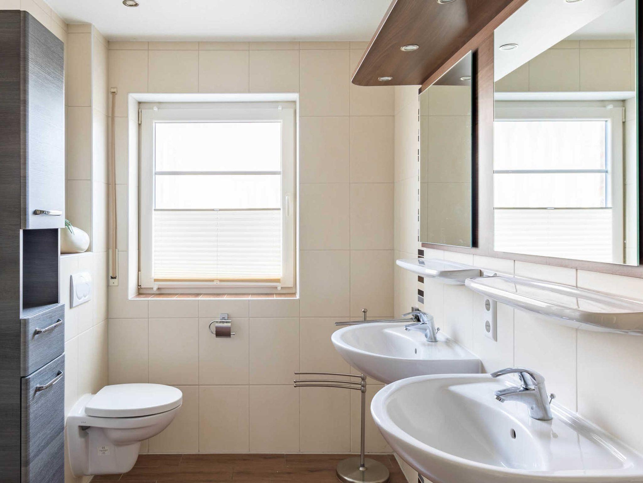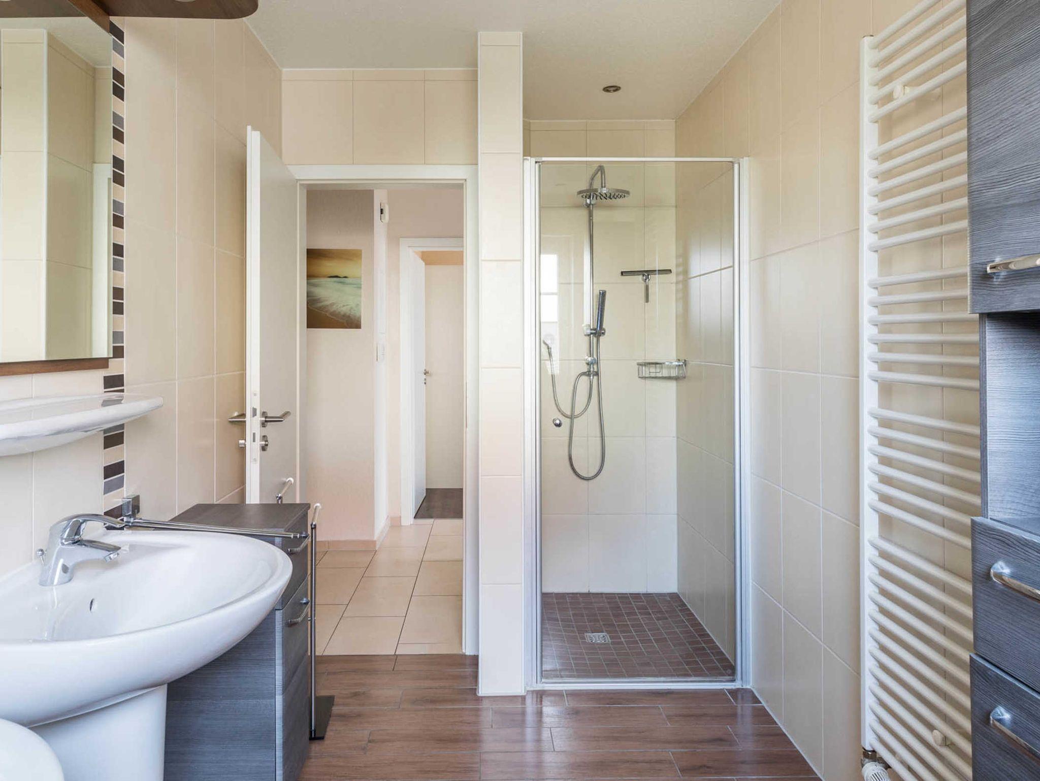 Freuen Sie sich des Weiteren auf ein großes Bad mit ebenerdiger Dusche, 2 Waschbecken und WC und ein weiteres separates Gäste-WC.