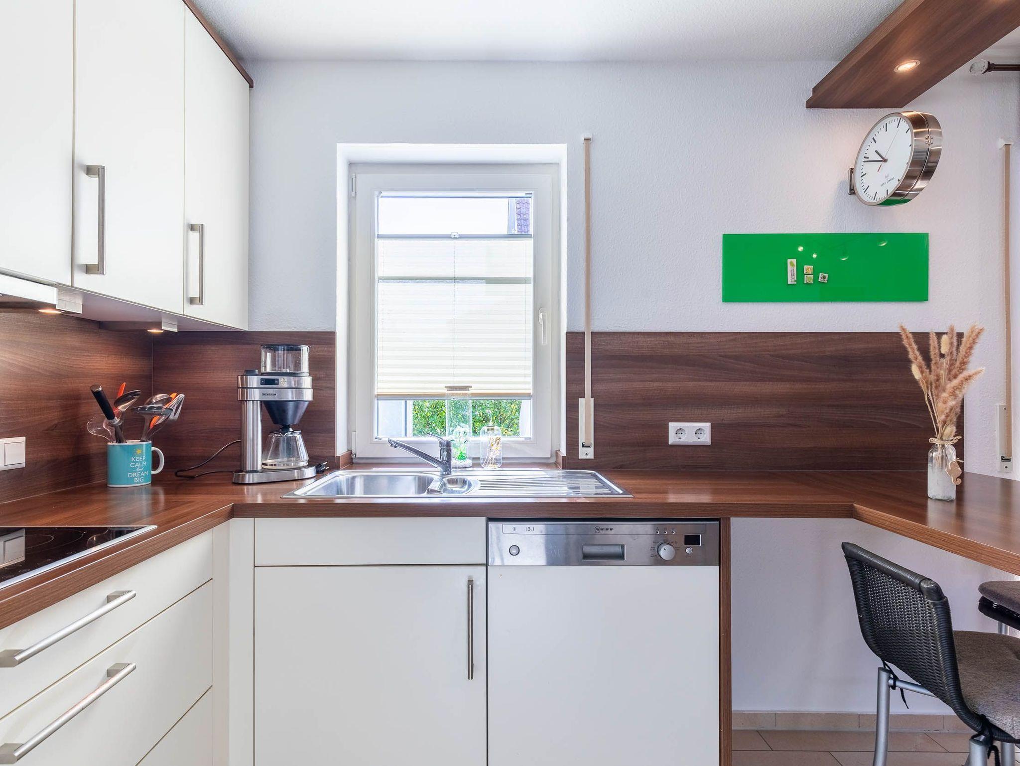 Die offene, moderne Küchenzeile mit angeschlossenem Essbereich ist voll ausgestattet. Auch eine Spülmaschine ist vorhanden.