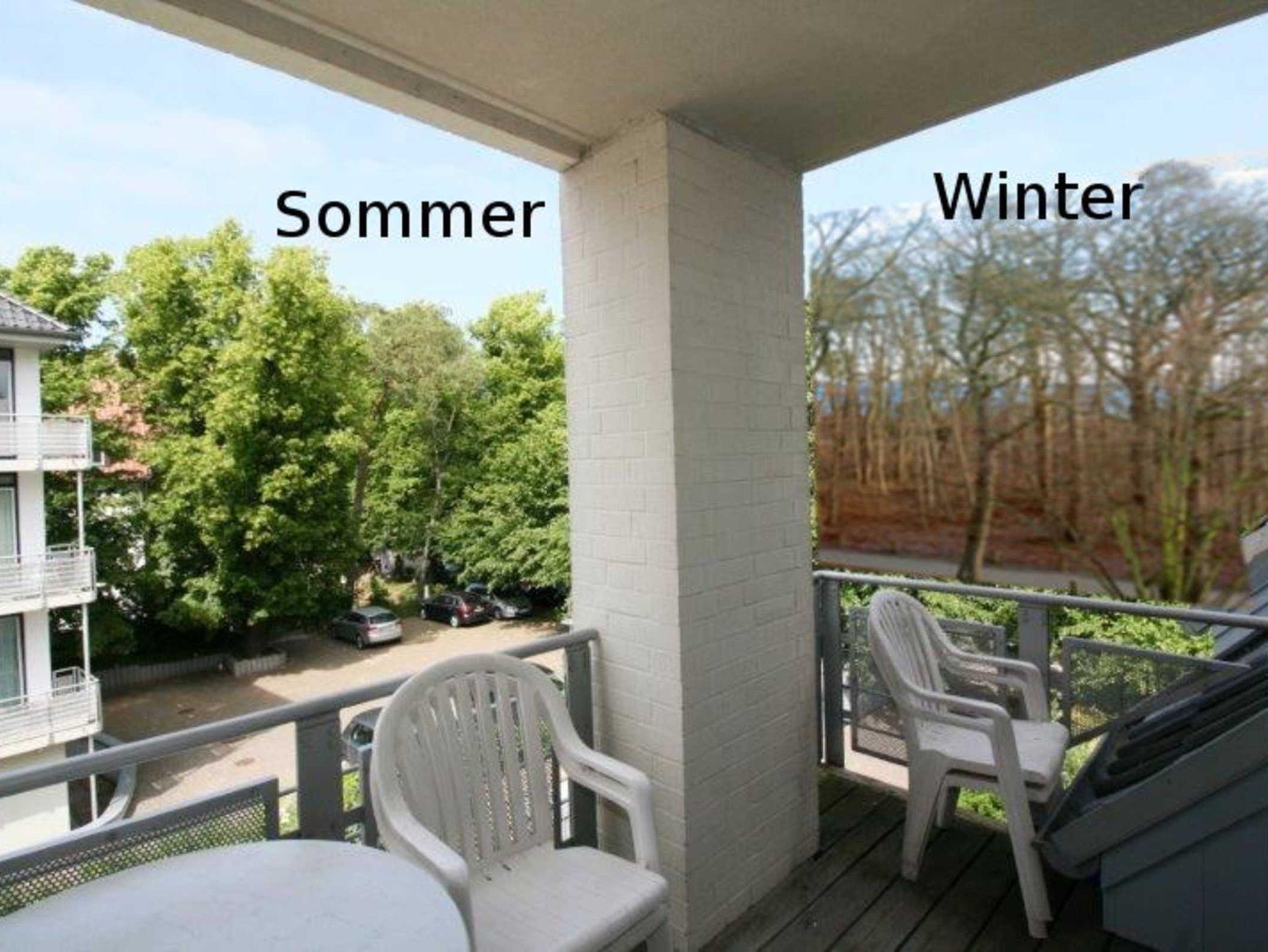Vom Wohnzimmer aus gelangen Sie auf den Balkon, der einen schönen Blick nach Westen auf den Dünenweg Richtung Redewisch und nach Norden zur Ostsee bietet. Im Sommer genießen Sie das satte Grün der Baumkronen des vorgelagerten Küstenwäldchens, und im Winter blitzt das Meer durch die kahlen Äste hindurch ? nur etwa 100 m entfernt.