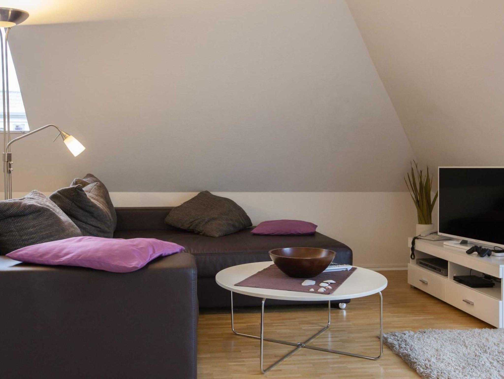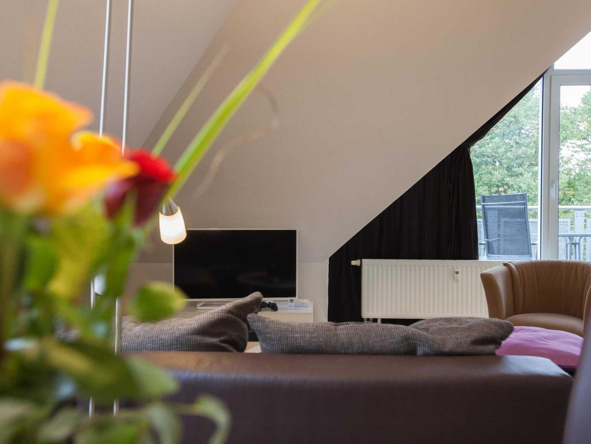 Sehr helles und großzügiges 2-Zimmer-Appartment im Dachgeschoss (Fahrstuhl vorhanden). Das geräumige Schlafzimmer mit Doppelbett und die gemütliche Schlafcouch im Wohnzimmer bieten Platz für bis zu 4 Personen. Im Schlafzimmer kann zusätzlich problemlos ein Kinderbett aufgestellt werden. Die große Dachterrasse lädt zu gemütlichen Stunden im Freien ein. Die Wohnung bietet Ihnen mit 2 x Flat TV, DVD Player, sky-Empfang, Playstation II, Stereoanlage und Telefon viel Komfort. Die Küche ist komplett ausgestattet mit Ceranfeld, Backofen, Geschirrspüler, Mikrowelle und seperatem Essplatz.