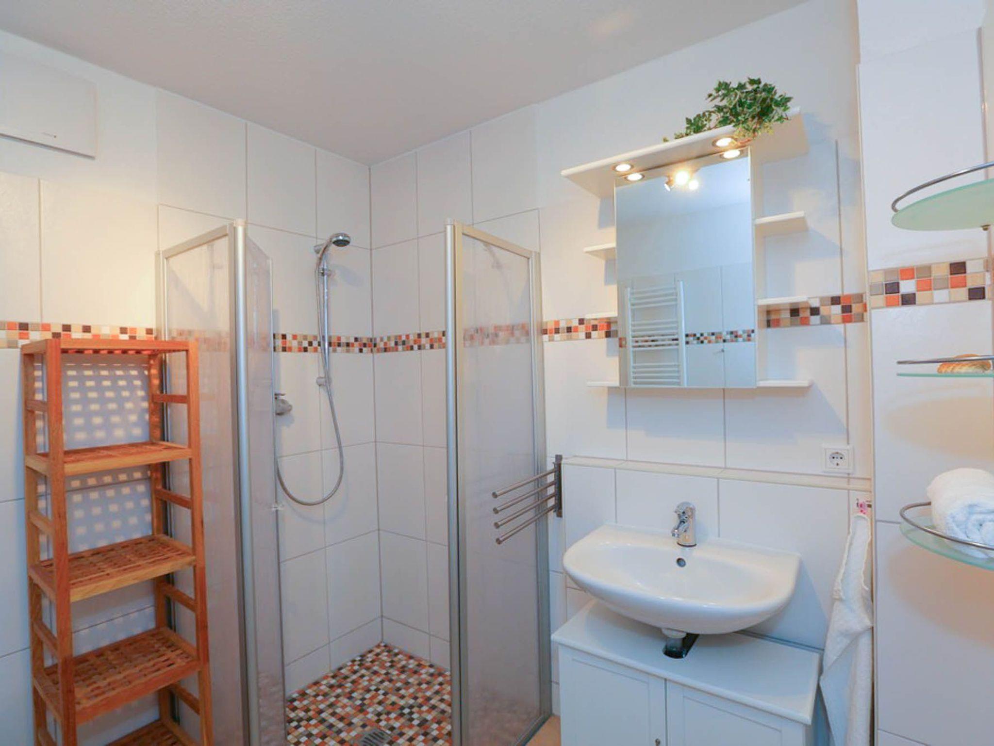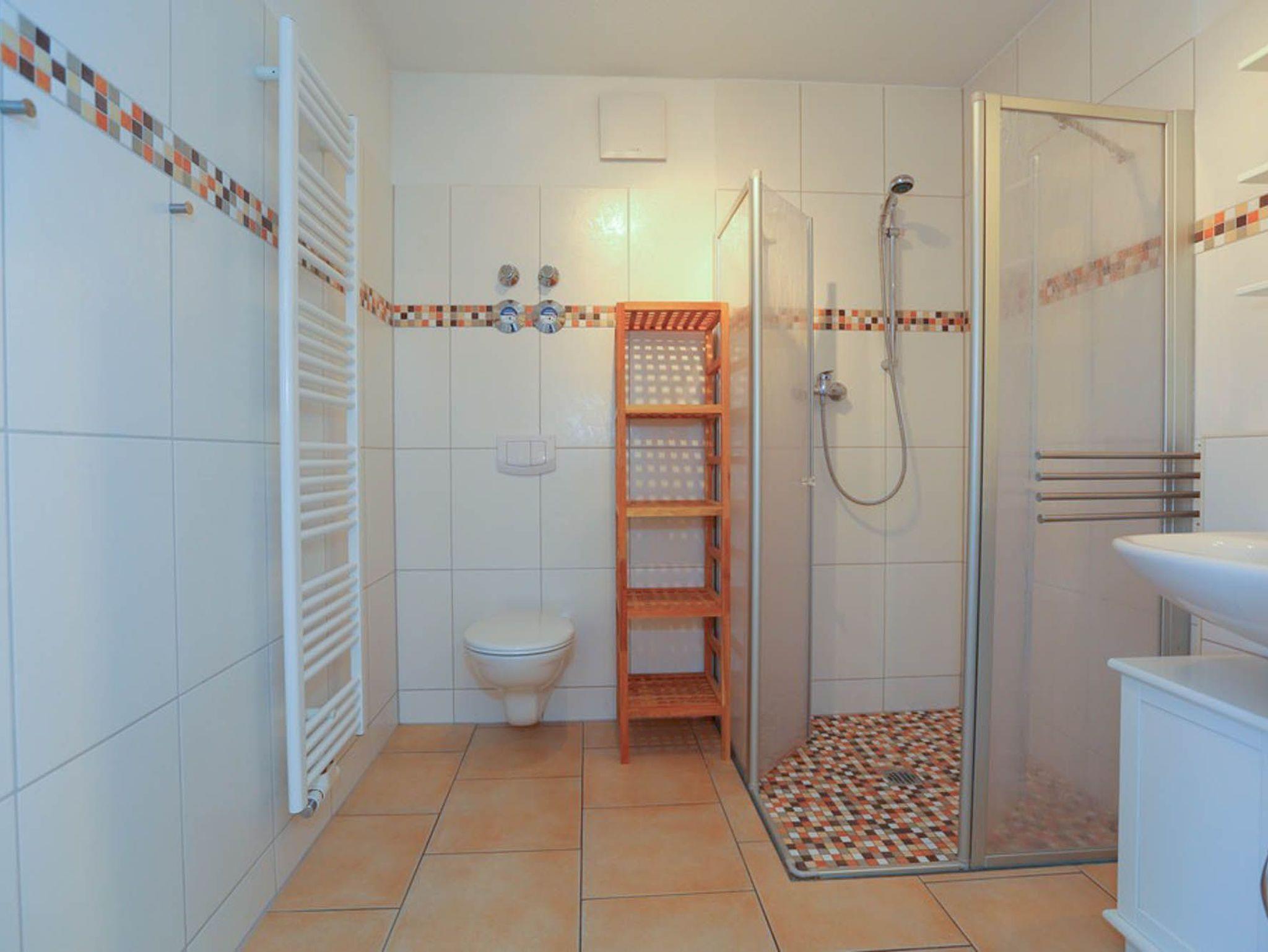Das moderne Bad mit Dusche und WC ist ebenfalls senioren- und kindgerecht gestaltet worden.
