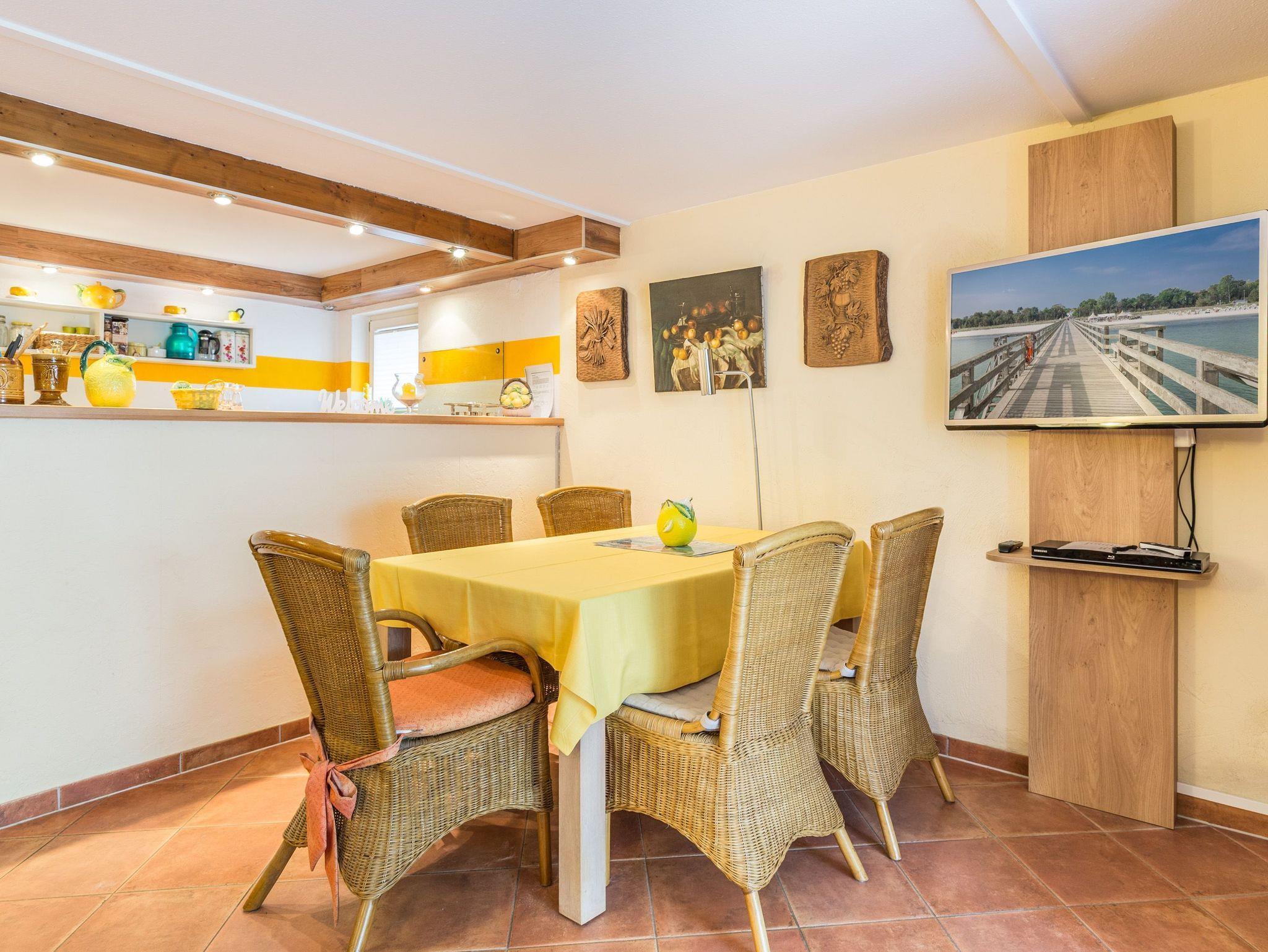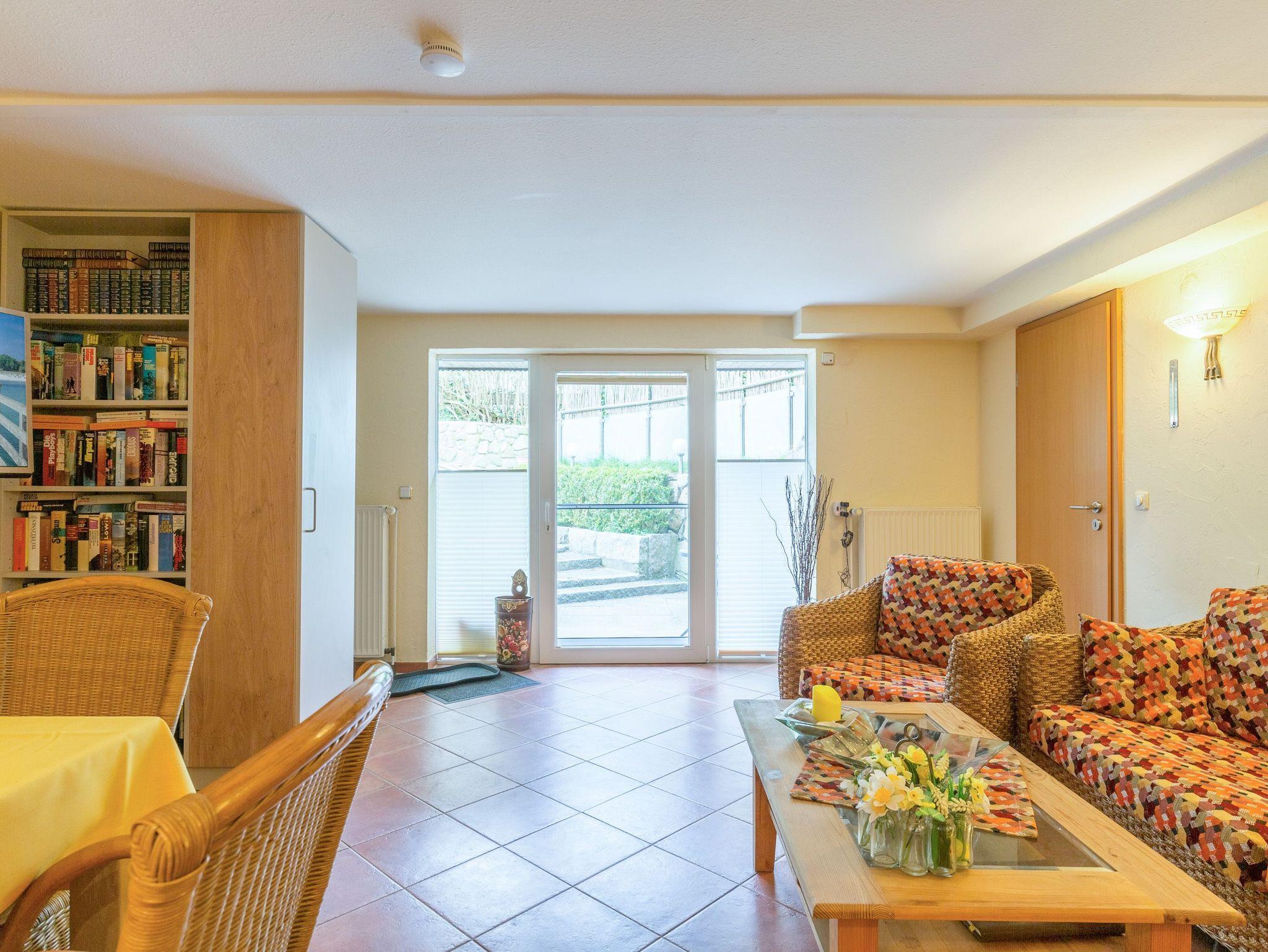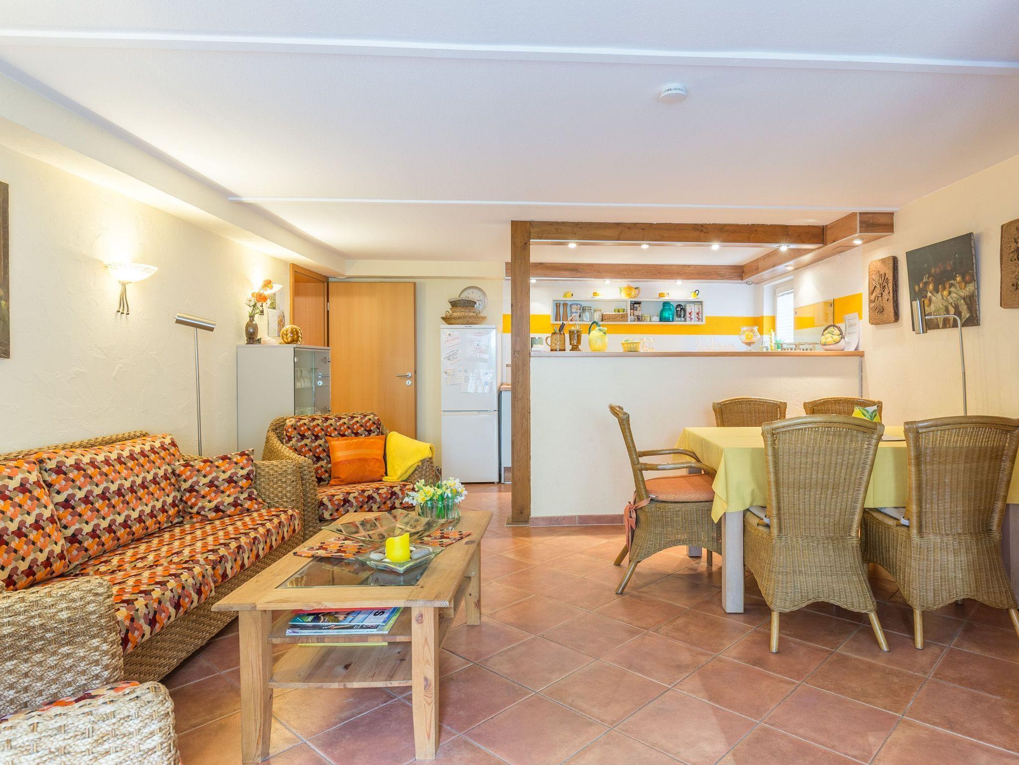 Die Ferienwohnung im Haus Sterntaucher bietet Platz im Erdgeschoss /Untergeschoss mit ein paar flachen Stufen absteigend für maximal 4 Personen. Ein großzügiger Wohn-Essbereich mit integrierter Küche lädt zum Wohlfühlen ein.