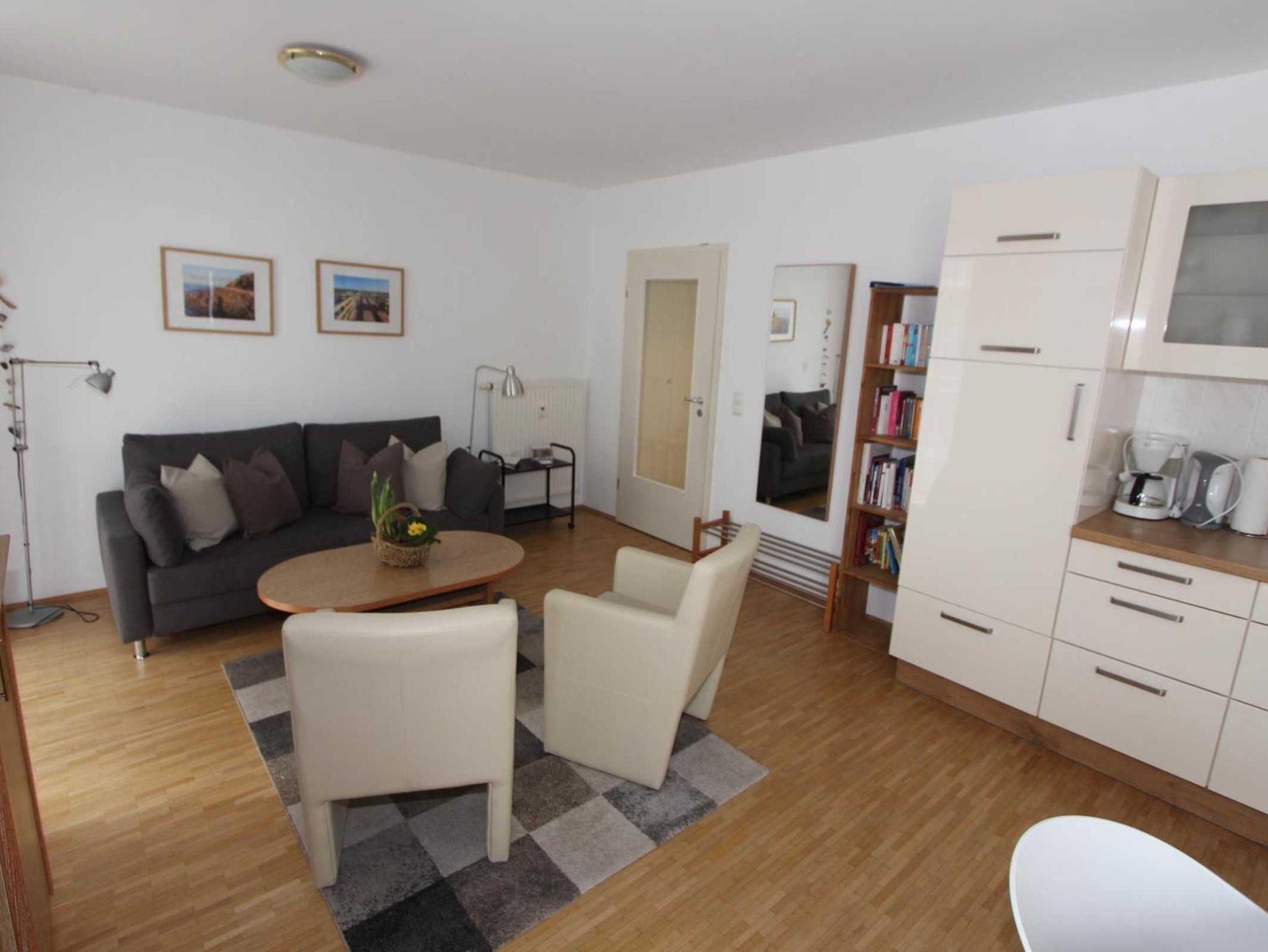 Sie wohnen im 1. OG einer 48 m² großen 2-Raum-Ferienwohnung für bis zu 4 Personen. Die Wohnung ist zum ruhigen Innenhof der Anlage ausgerichtet und verfügt über einen Balkon mit Morgensonne.