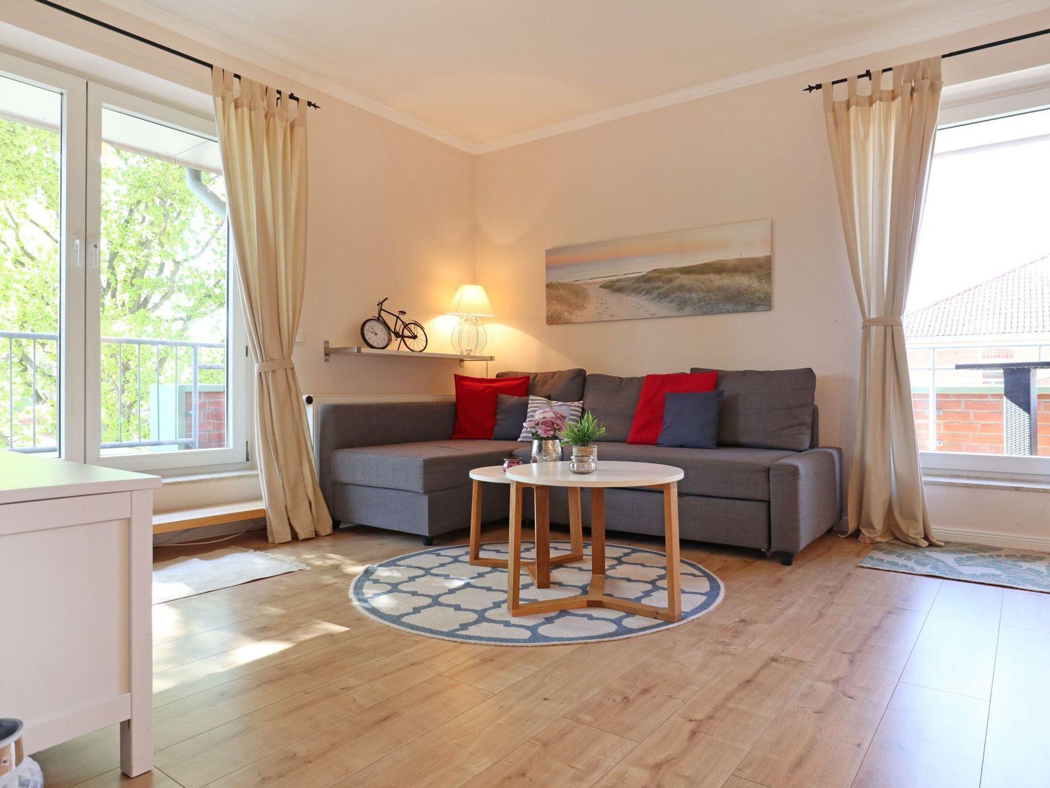 Diese hell und freundlich eingerichtete 55qm große 2-Zimmer-Wohnung liegt im Dachgeschoss des Mehrparteienhauses und bietet Ihnen genügend Platz für bis zu 4 Personen. Genießen Sie auf der umlaufenden Dachterrasse gemütliche Urlaubsstunden in den dort zur Verfügung stehenden 2 Strandkörben und lassen Sie die Seele baumeln. Im kombinierten modernen Wohn- und Essbereich verfügen Sie über ein wohnliches Schlafsofa für die entspannten Stunden, einen Flachbild-TV mit DVD-Player und einen Esstisch mit 4 Stühlen. Hier befindet sich auch der Zugang zur Dachterrasse. Das helle, großzügige Schlafzimmer ist mit einem Doppelbett und einem großen Kleiderschrank für Ihre Urlaubsgarderobe ausgestattet. Die separate Küche verfügt unter anderem über einen Herd, Backofen, Mikrowelle, Kaffeemaschine, Toaster, und Wasserkocher.