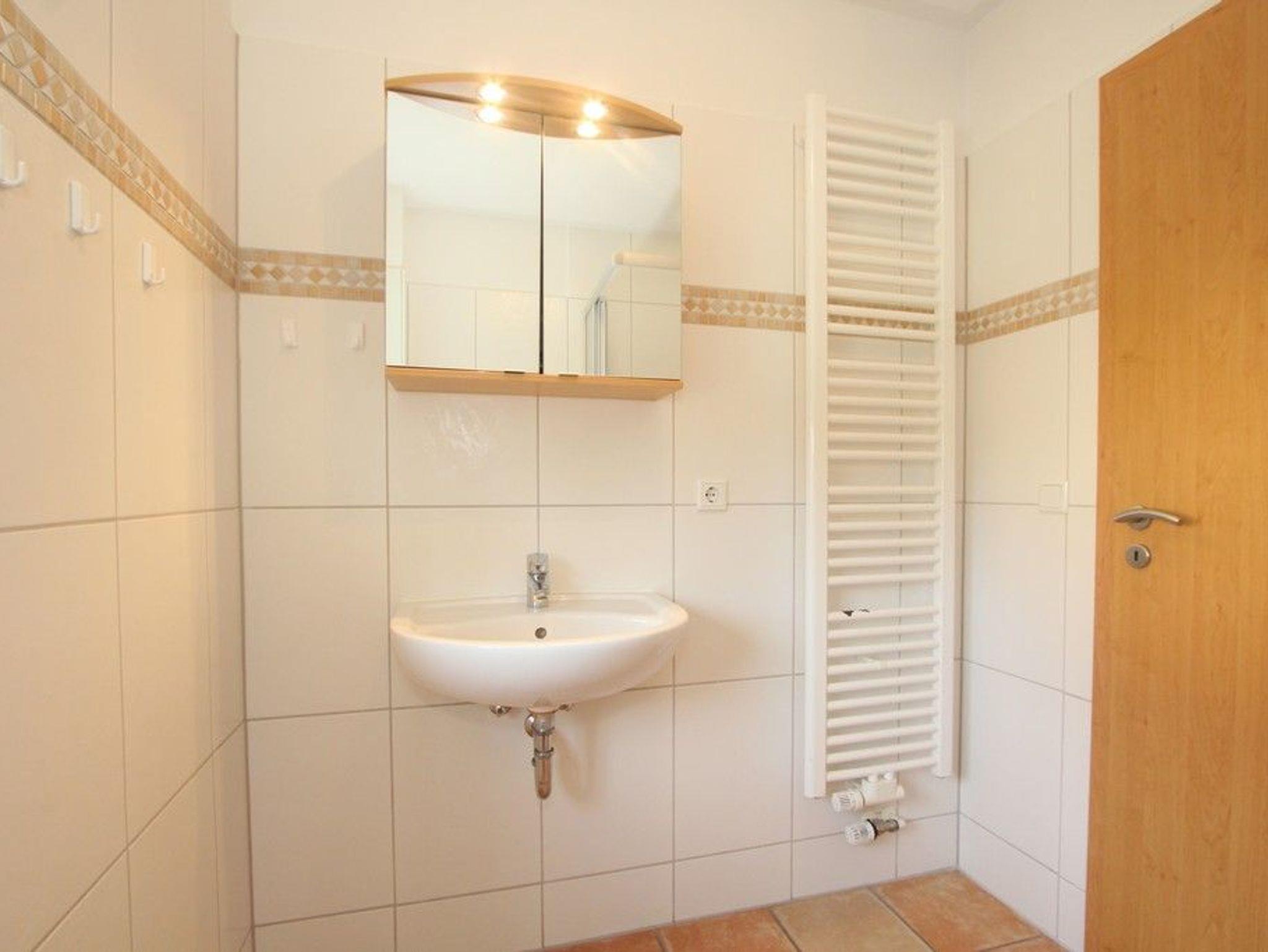 Ein helles Bad mit Tageslicht bietet Dusche, Waschbecken und WC.