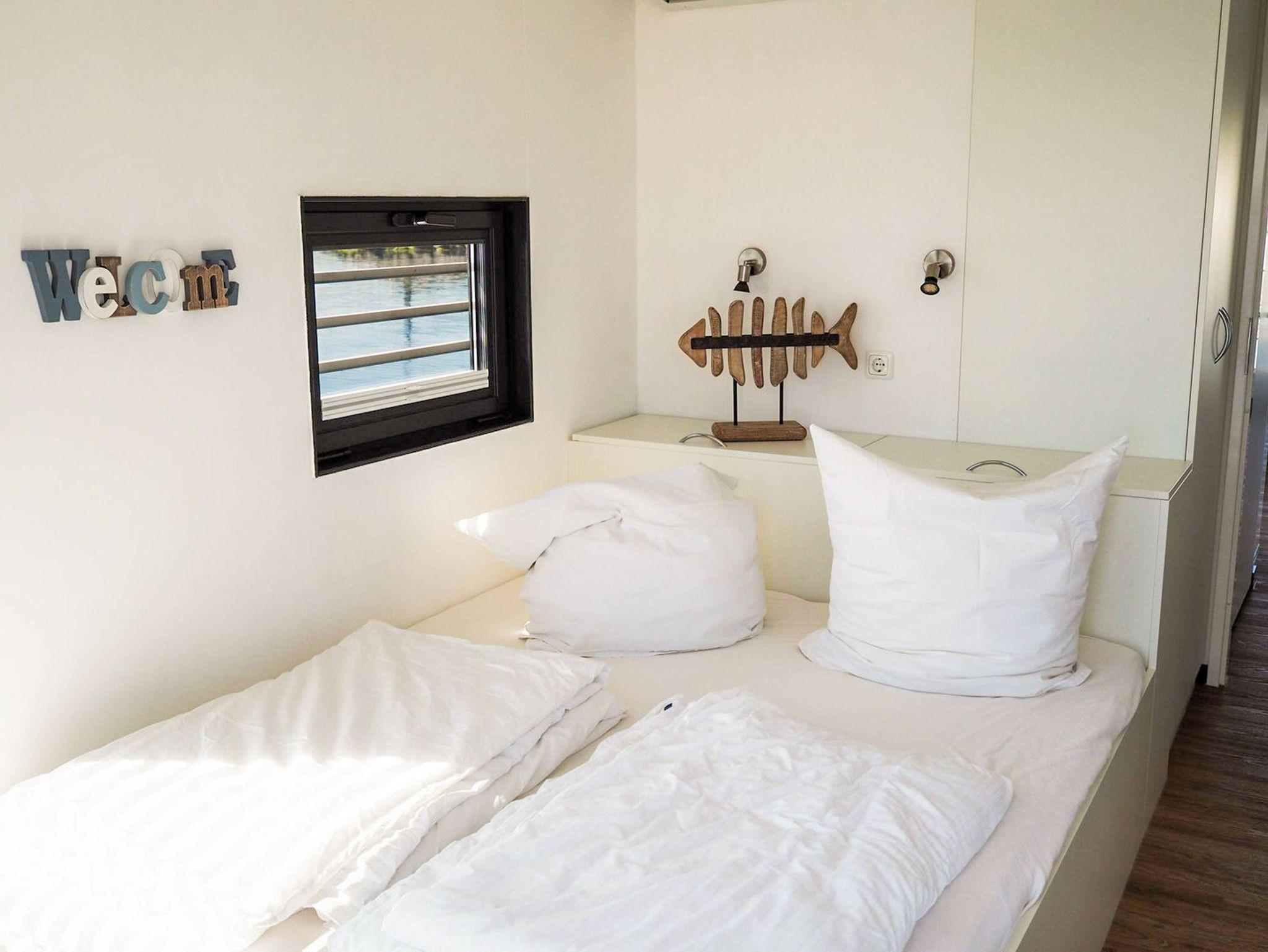 Floating House 8 im Ostseebad Boltenhagen ist genau das Richtige für alle, die ihren Urlaub ganz nah am Wasser verbringen möchten und zwar gemeinsam mit dem Lieblingsmenschen, der Familie und auch mit Hund. Das moderne Hausboot mit festem Liegeplatz bietet Platz für bis zu 4 Personen. Der gesamte Wohnbereich spielt sich auf einer Ebene ab maritim, hell und gemütlich. Die großzügige Eck-Couch, der große Esstisch für bis zu 6 Personen und die offenen Fensterfronten sorgen für ein luftiges Raumgefühl, bei dem das Wasser immer ganz nah ist. Die integrierte Küche ist voll ausgestattet mit Spülmaschine, Mikrowelle, Kühlschrank, Kaffeemaschine, Toaster, Wasserkocher und allem, was du brauchst, um dich auch im Urlaub wie zuhause zu fühlen. In den zwei Schlafzimmern mit Doppelbetten schläft es sich herrlich erholt Bettwäsche ist inklusive, genauso wie ein wöchentliches Handtuch-Set pro Person. Das Badezimmer mit Dusche und das separate WC mit Waschtisch bieten praktischen Komfort auch bei voller Belegung. Draußen findest du gleich zwei besondere Lieblingsplätze: die möblierte Terrasse am Bug (15m²) für dein Frühstück in der Morgensonne und die großzügige Dachterrasse (25m²) für Sonnenstunden, Lesepausen oder einfach nur zum Blickeschweifenlassen. Smart-TV, Radio und CD-Player sind ebenso an Bord wie eine Klimaanlage mit Warmluftfunktion. WLAN bekommst du über das Hafennetz und ein kostenfreier Parkplatz in der Nähe des Hafens gehört ebenfalls dazu. Dieses Hausboot ist hundefreundlich dein Vierbeiner ist herzlich willkommen. Die Einrichtung kann von den abgebildeten Fotos abweichen.