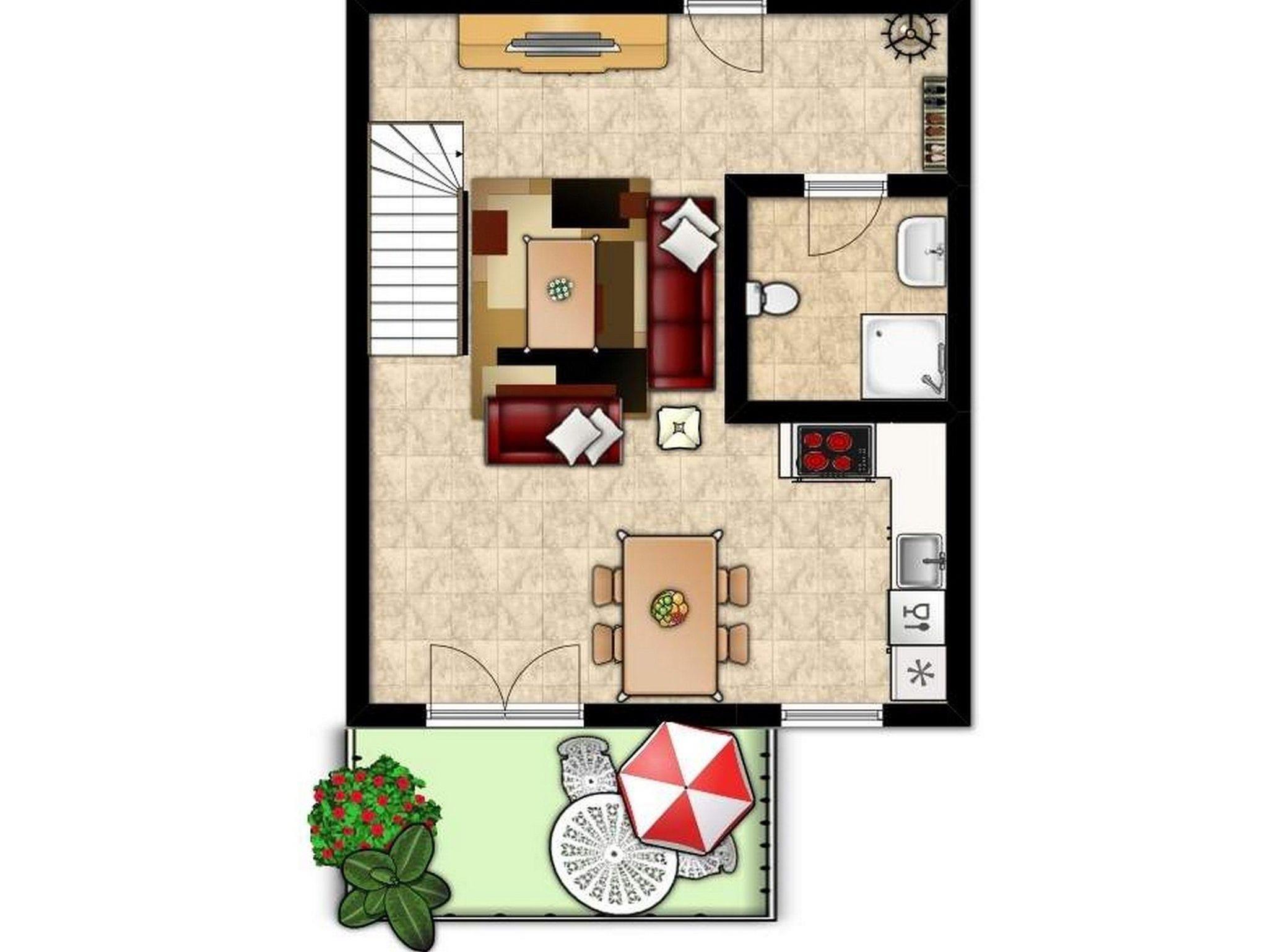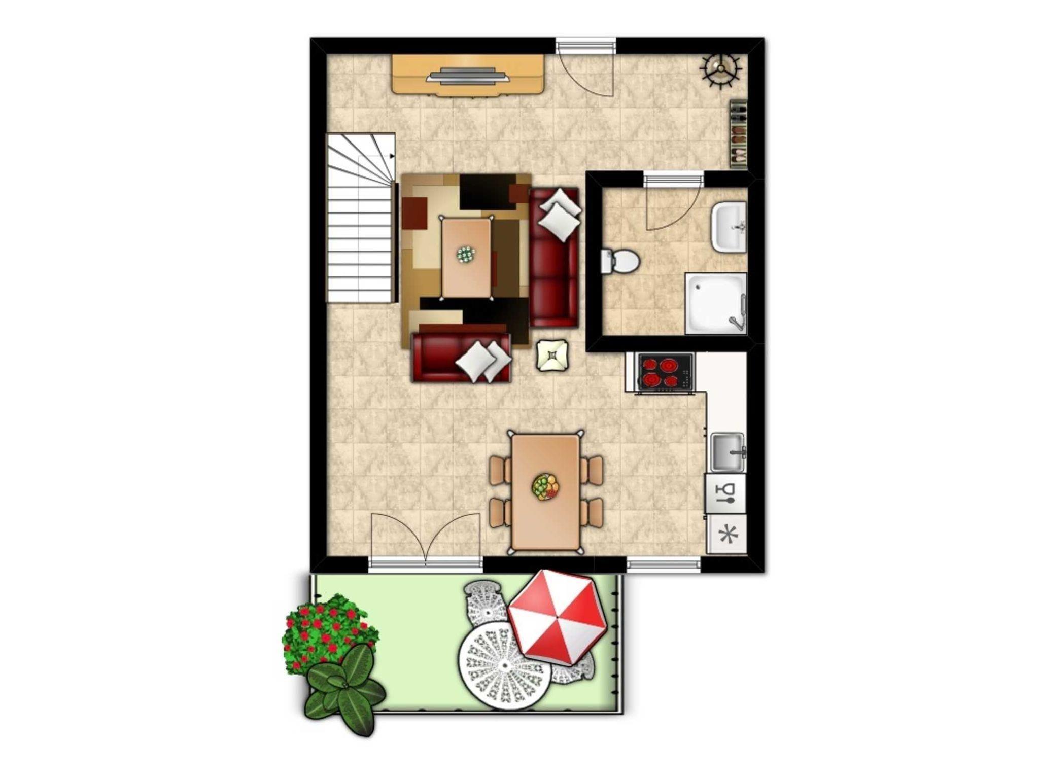 Sie verfügt in der ersten Wohnebene über einen offenen Wohn- und Essbereich mit Essecke und Sofa, Sat-TV und Radio.