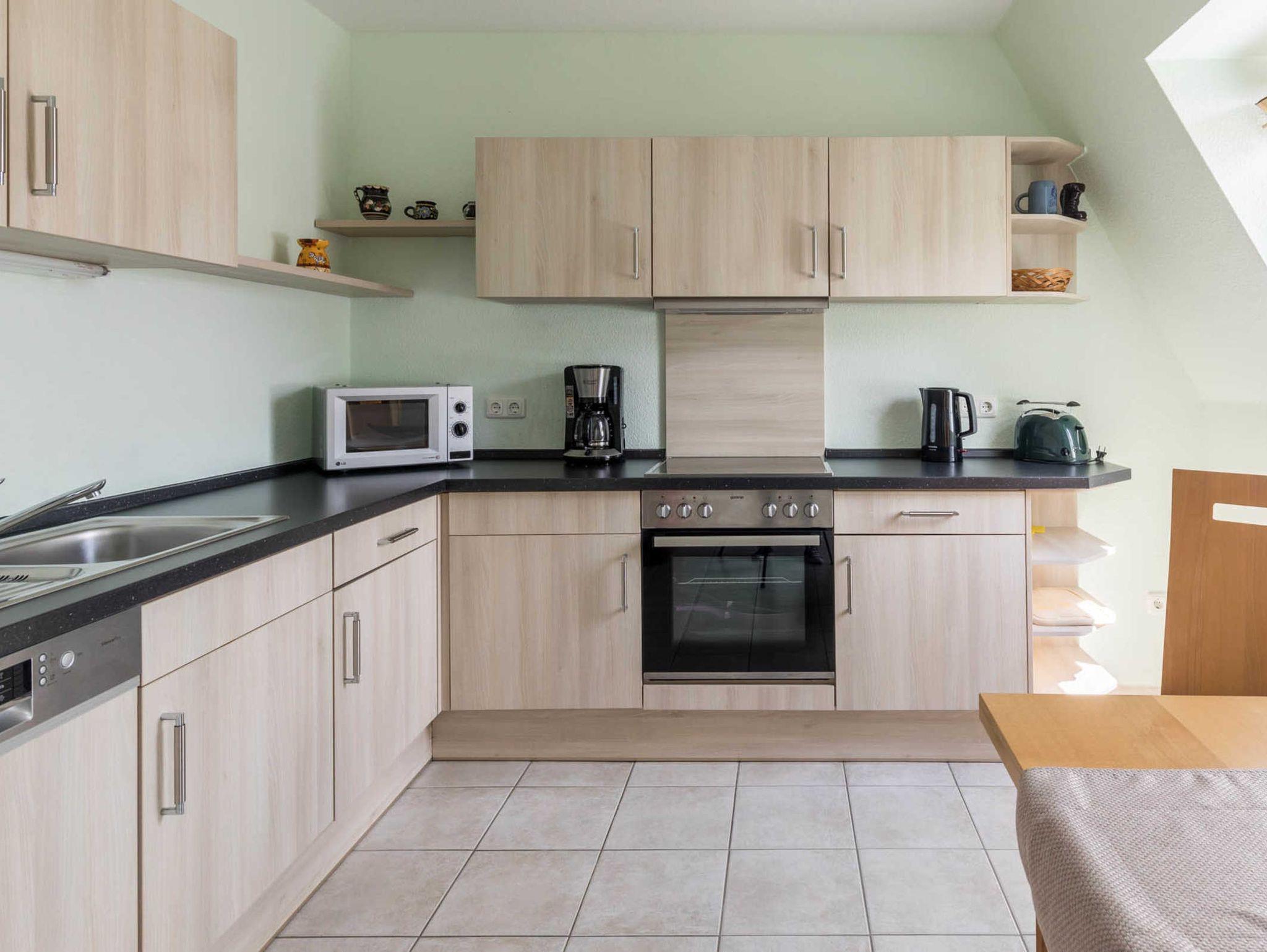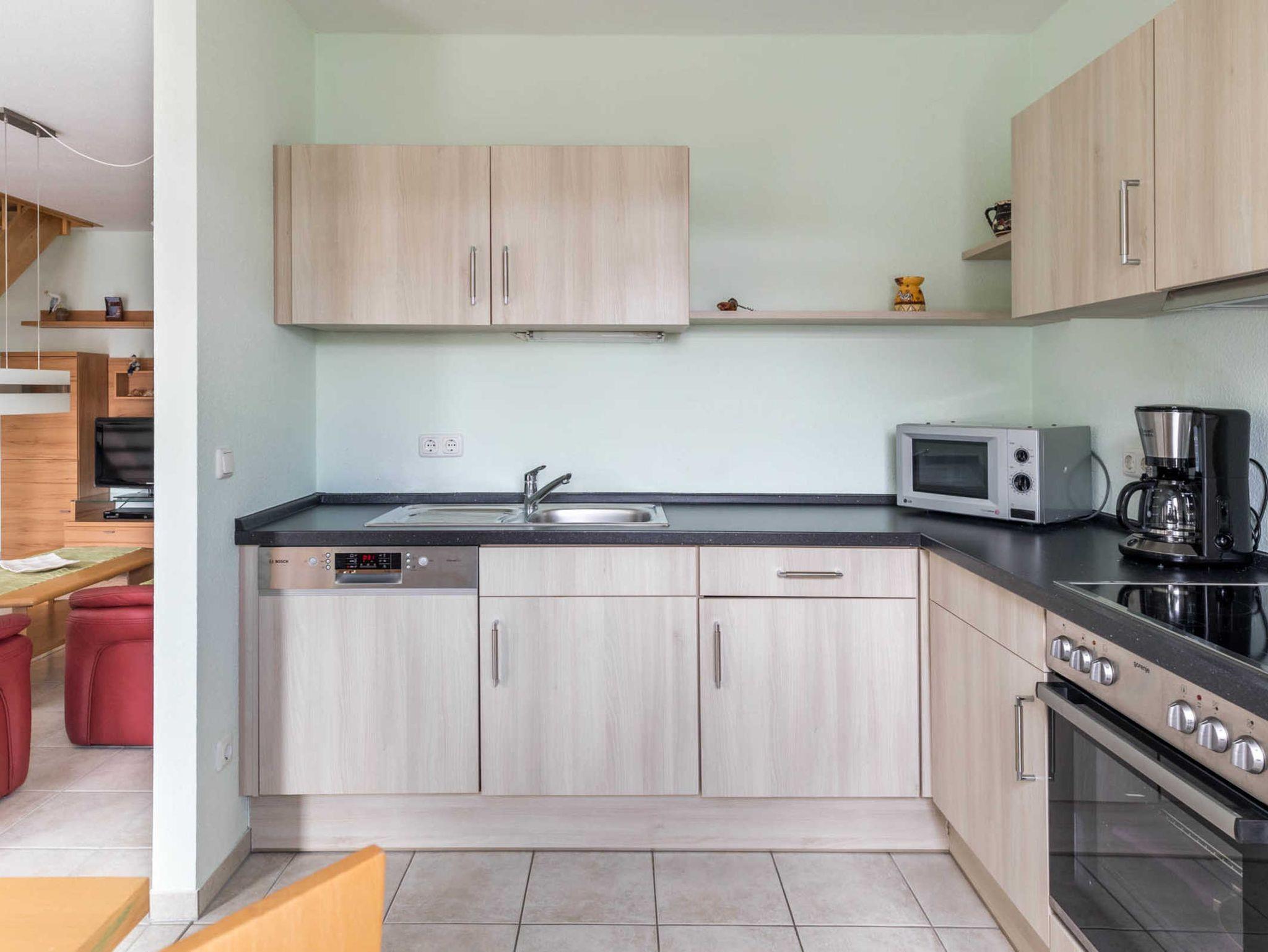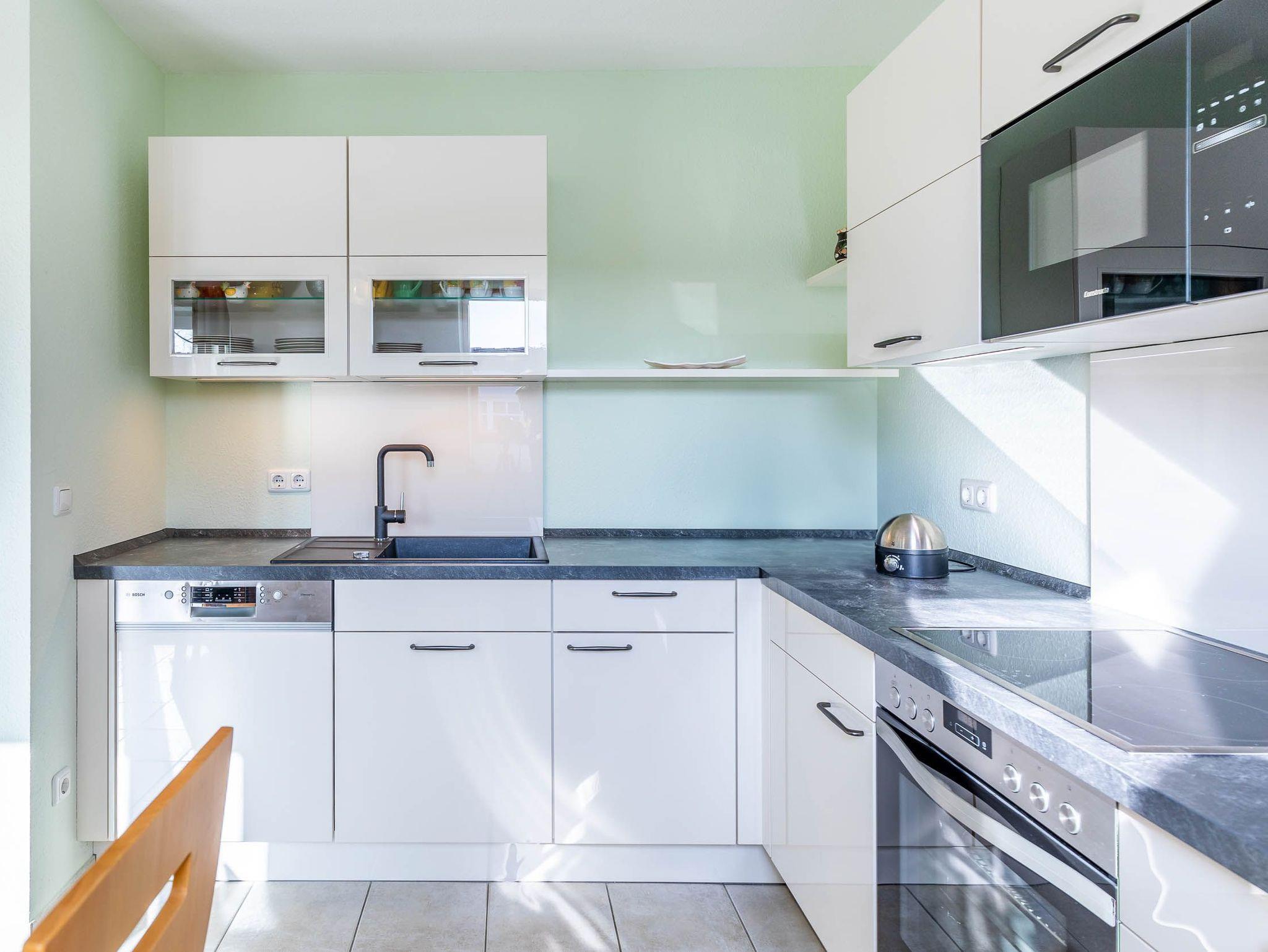 Darüber hinaus erwartet Sie hier eine voll ausgestattete Küchenzeile wie z.B. Geschirrspüler, Mikrowelle, Backofen und Herd.