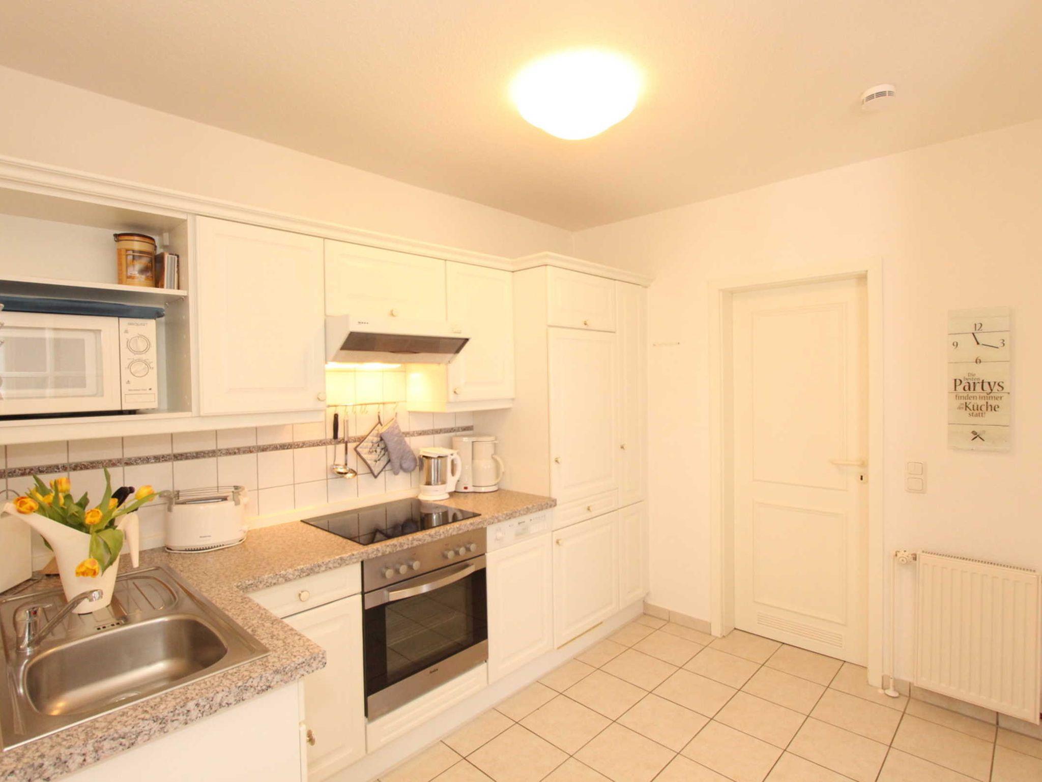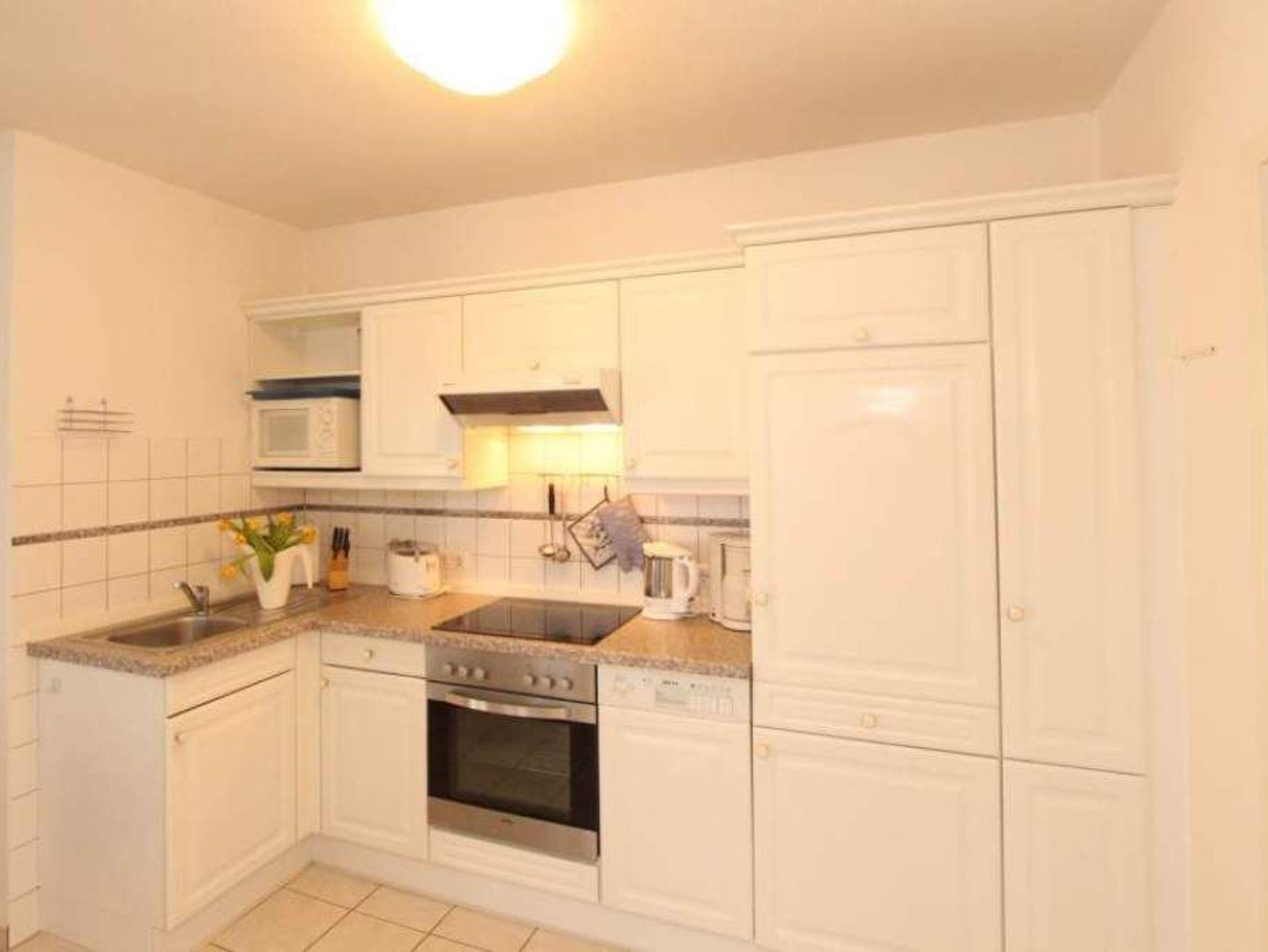 Zur Einrichtung der separaten Küchenzeile gehören ein Herd, ein Backofen, eine Microwelle, ein Kühlschrank mit Gefrierfach sowie eine Spülmaschine.