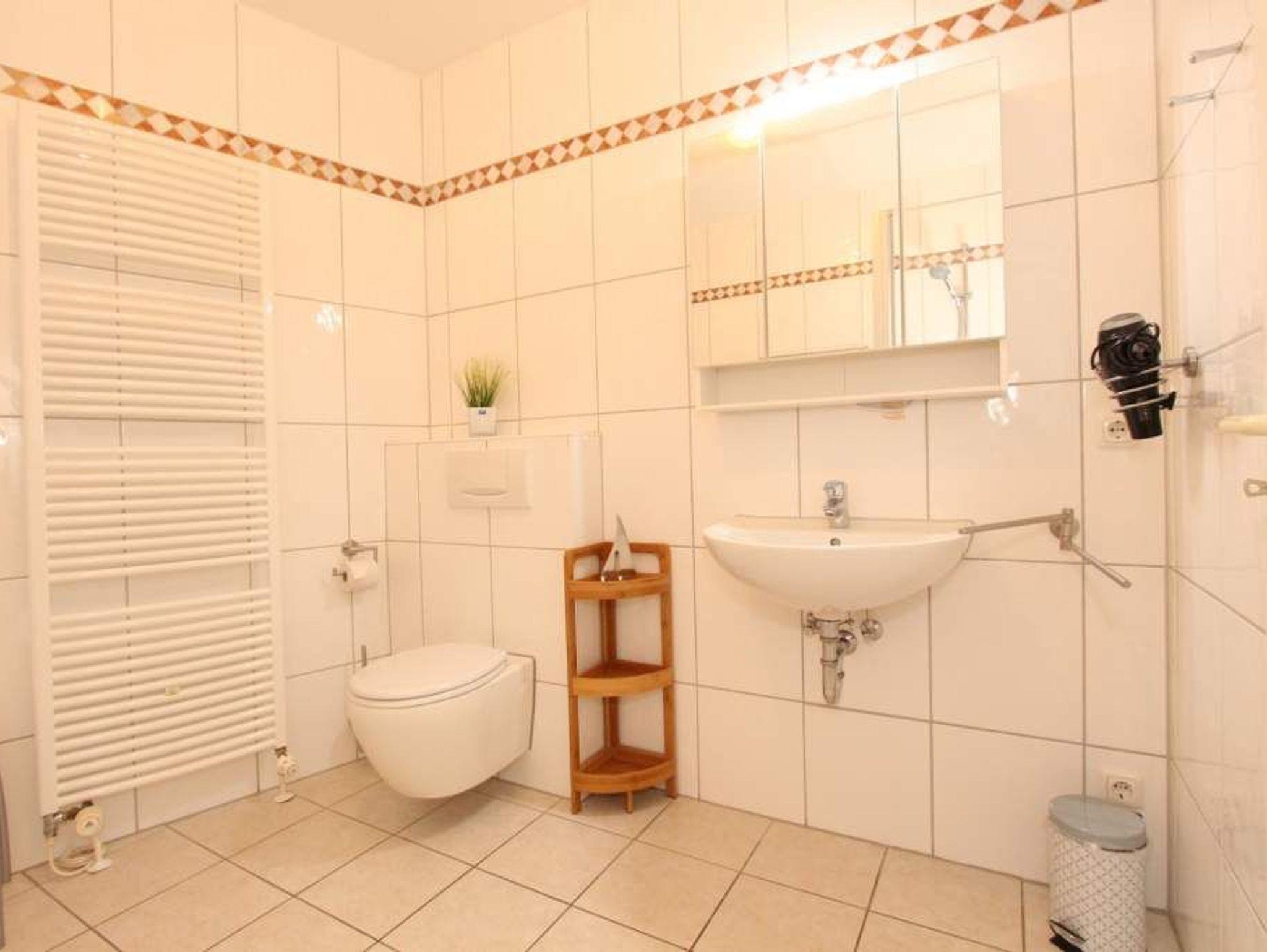 Die Badezimmerausstattung besteht aus einer Dusche und einem WC.