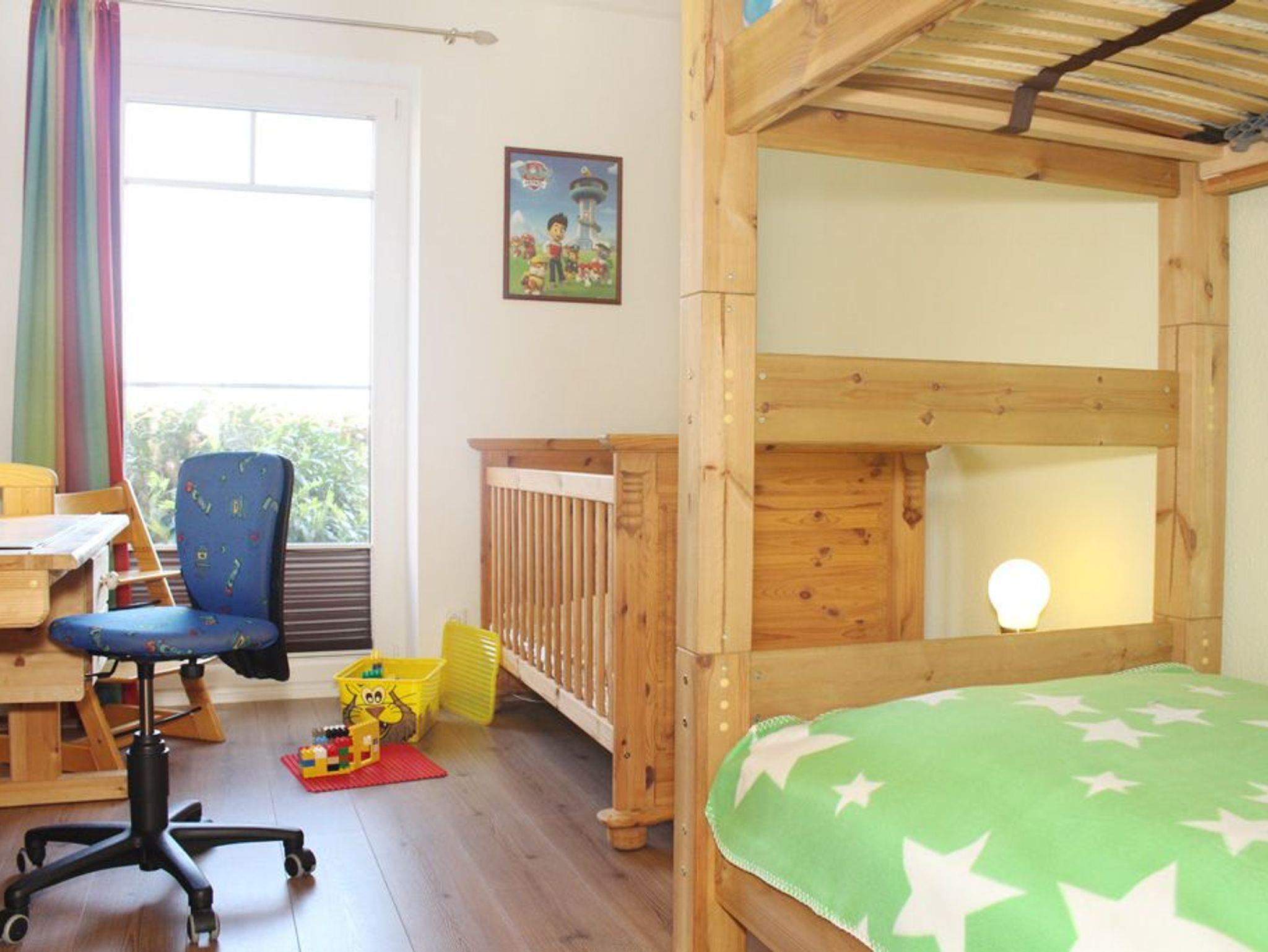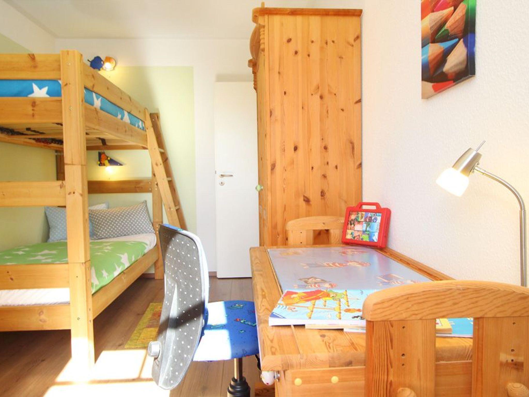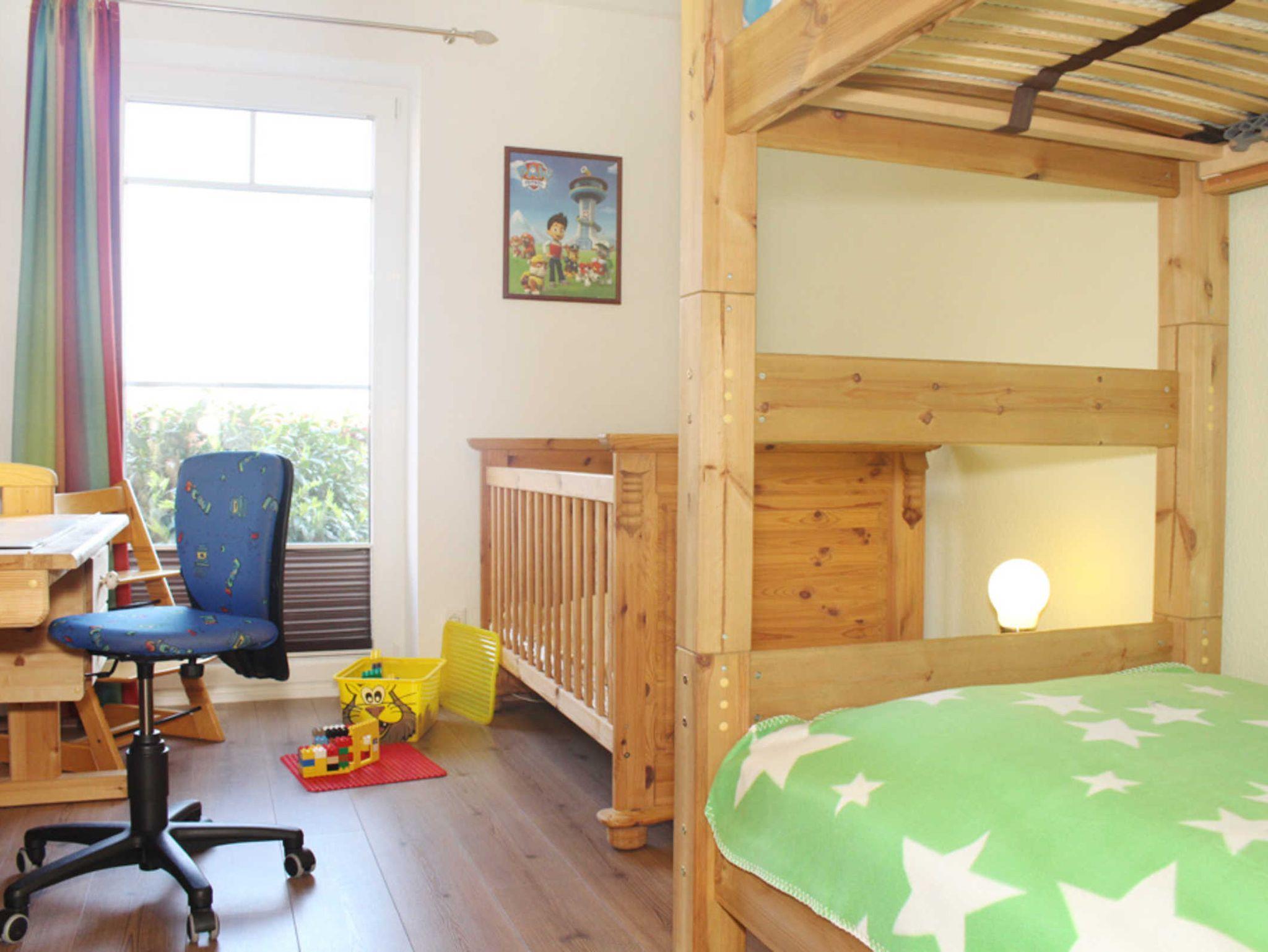 Das Gäste-/ Kinderzimmer ist kinderfreundlich gestaltet und bietet ein Kinder/Babybett für kleine Gäste sowie ein Etagenbett, in dem auch Erwachsene ausreichend Platz finden. Auch ein schöner Schreibtisch hat hier einen Platz gefunden.
