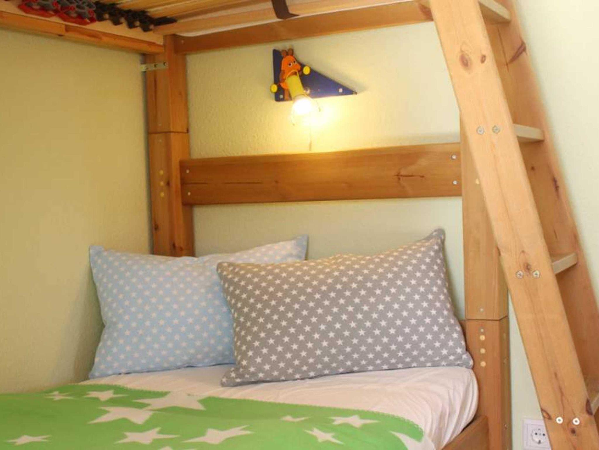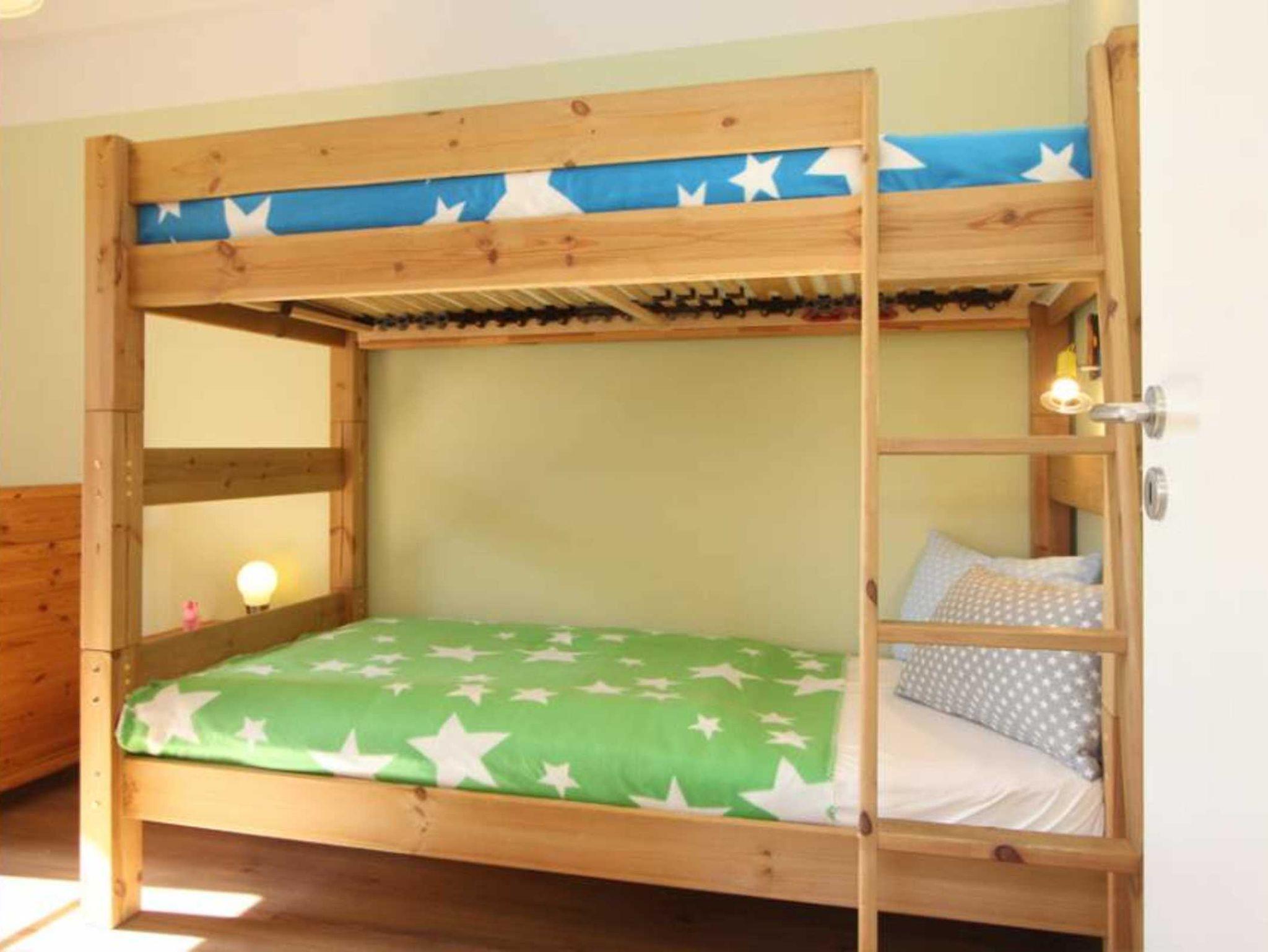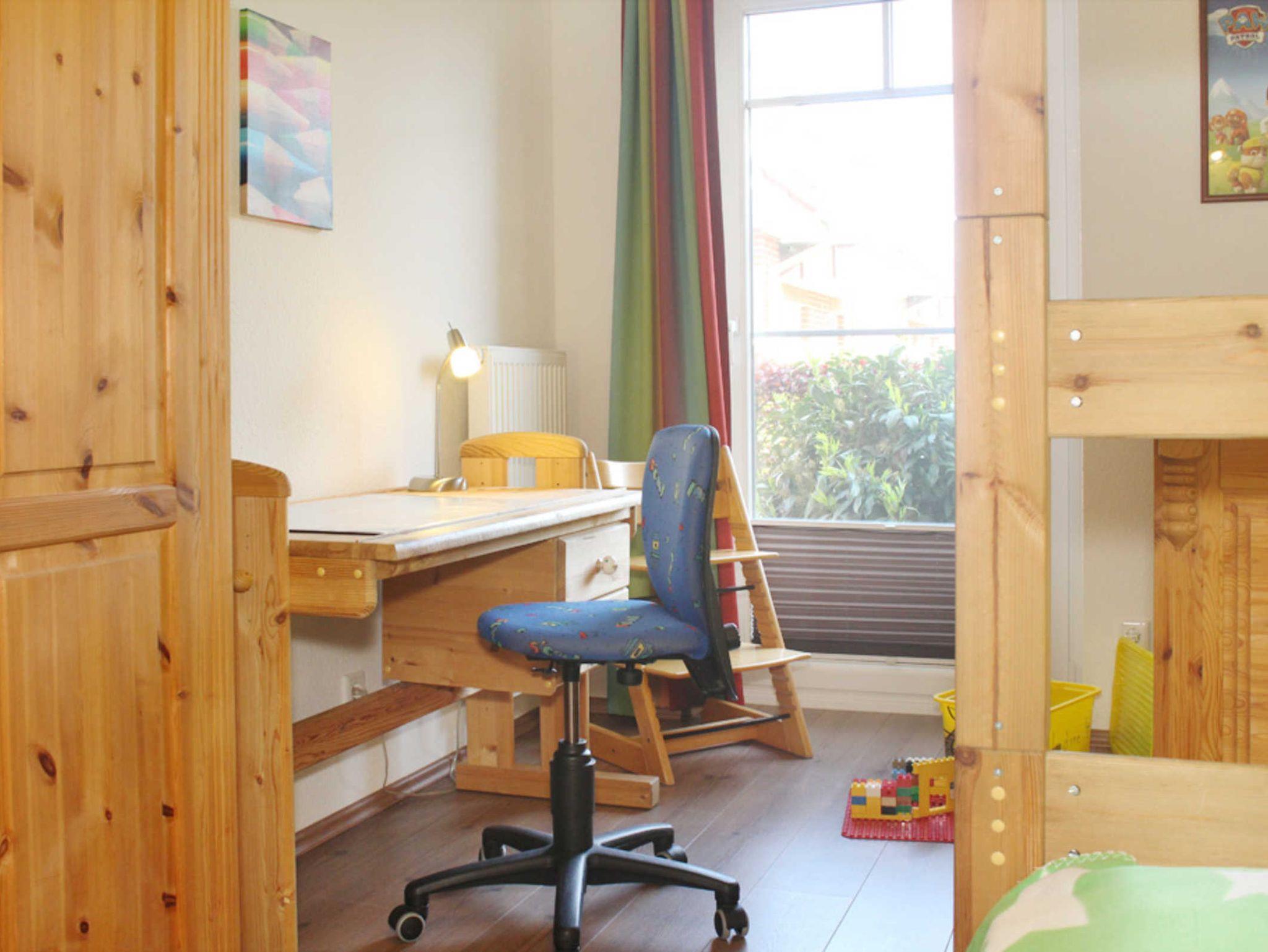 Das Gäste-/ Kinderzimmer ist kinderfreundlich gestaltet und bietet ein Kinder/Babybett für kleine Gäste sowie ein Etagenbett, in dem auch Erwachsene ausreichend Platz finden. Auch ein schöner Schreibtisch hat hier einen Platz gefunden.