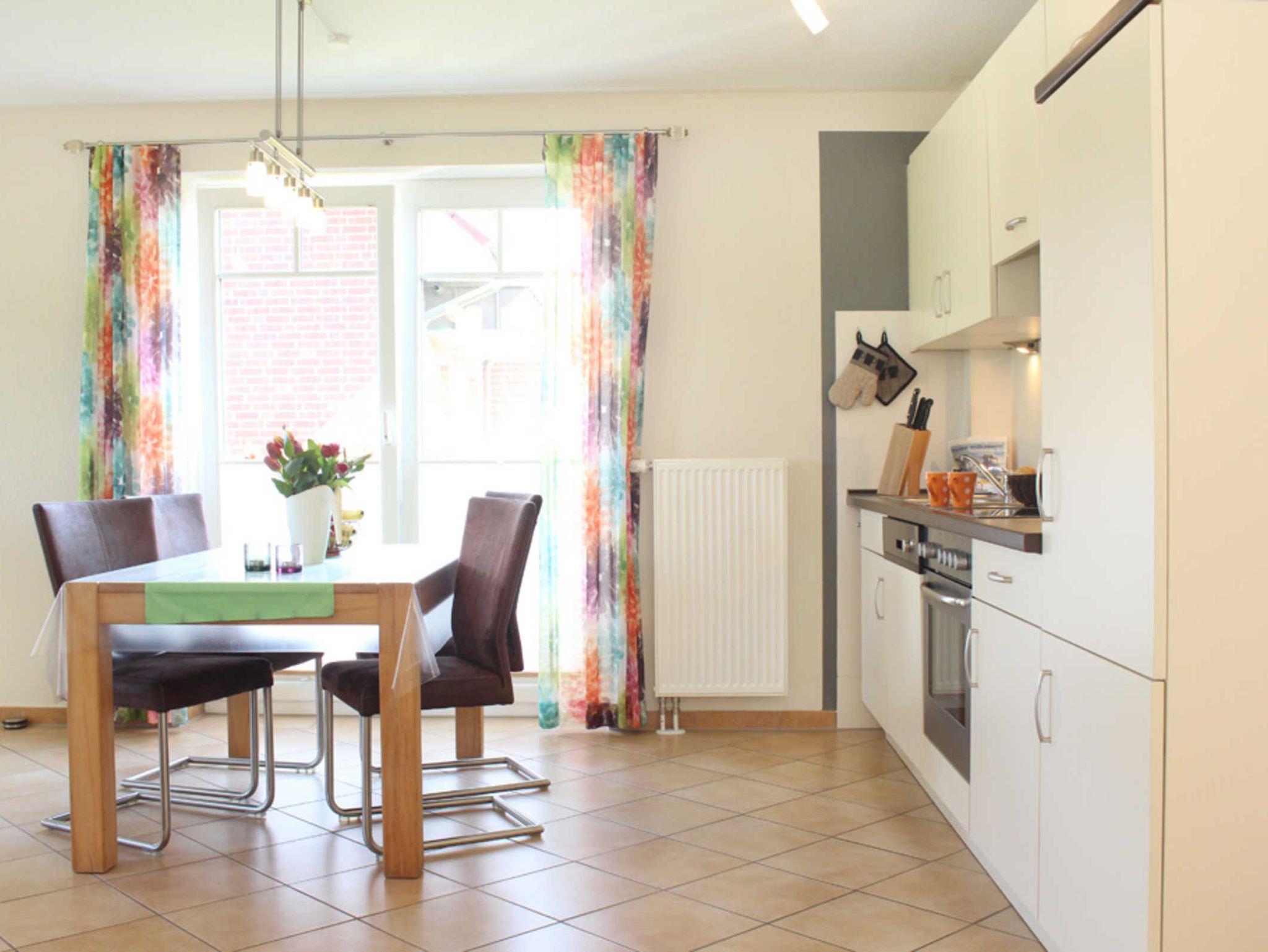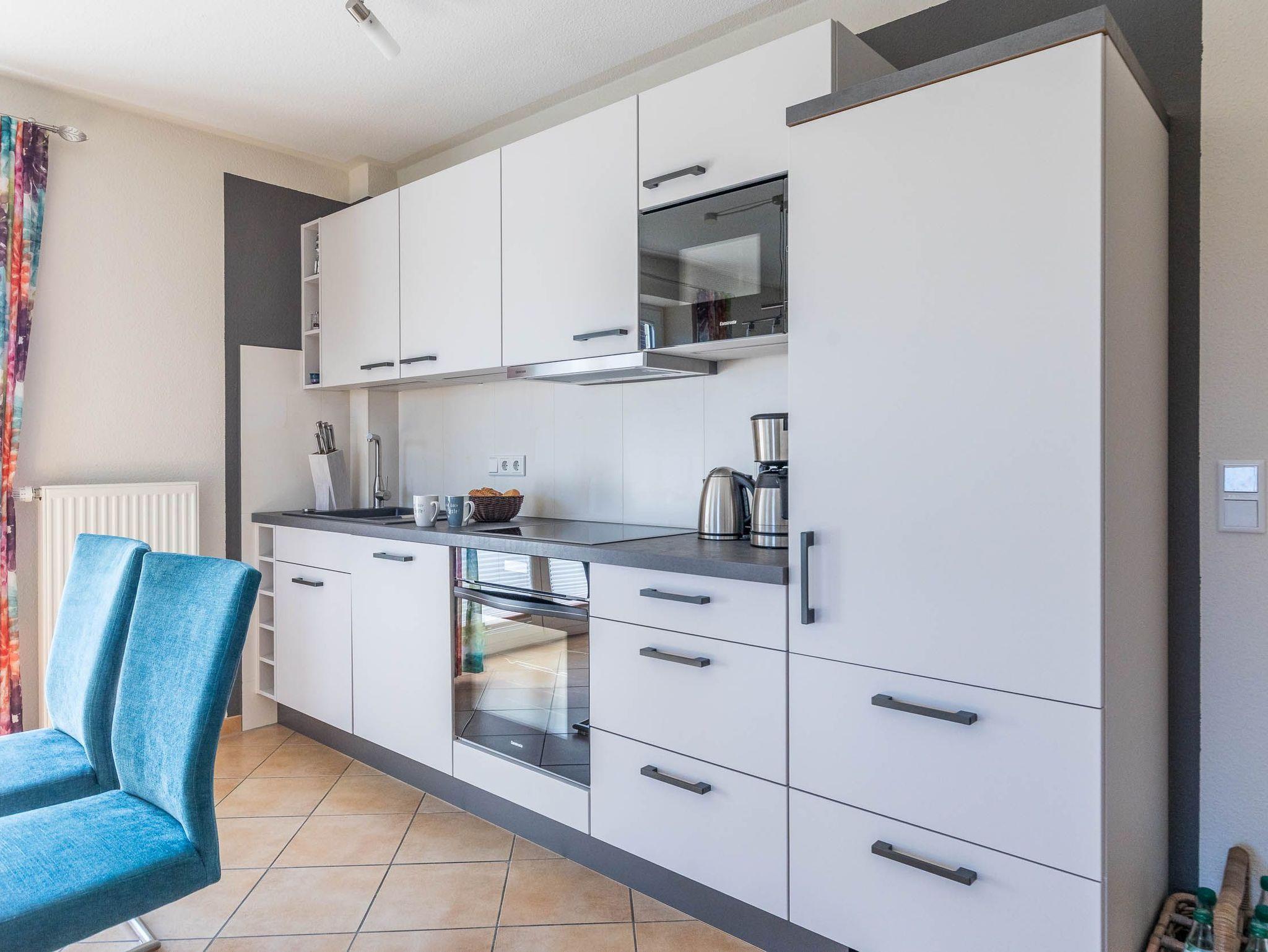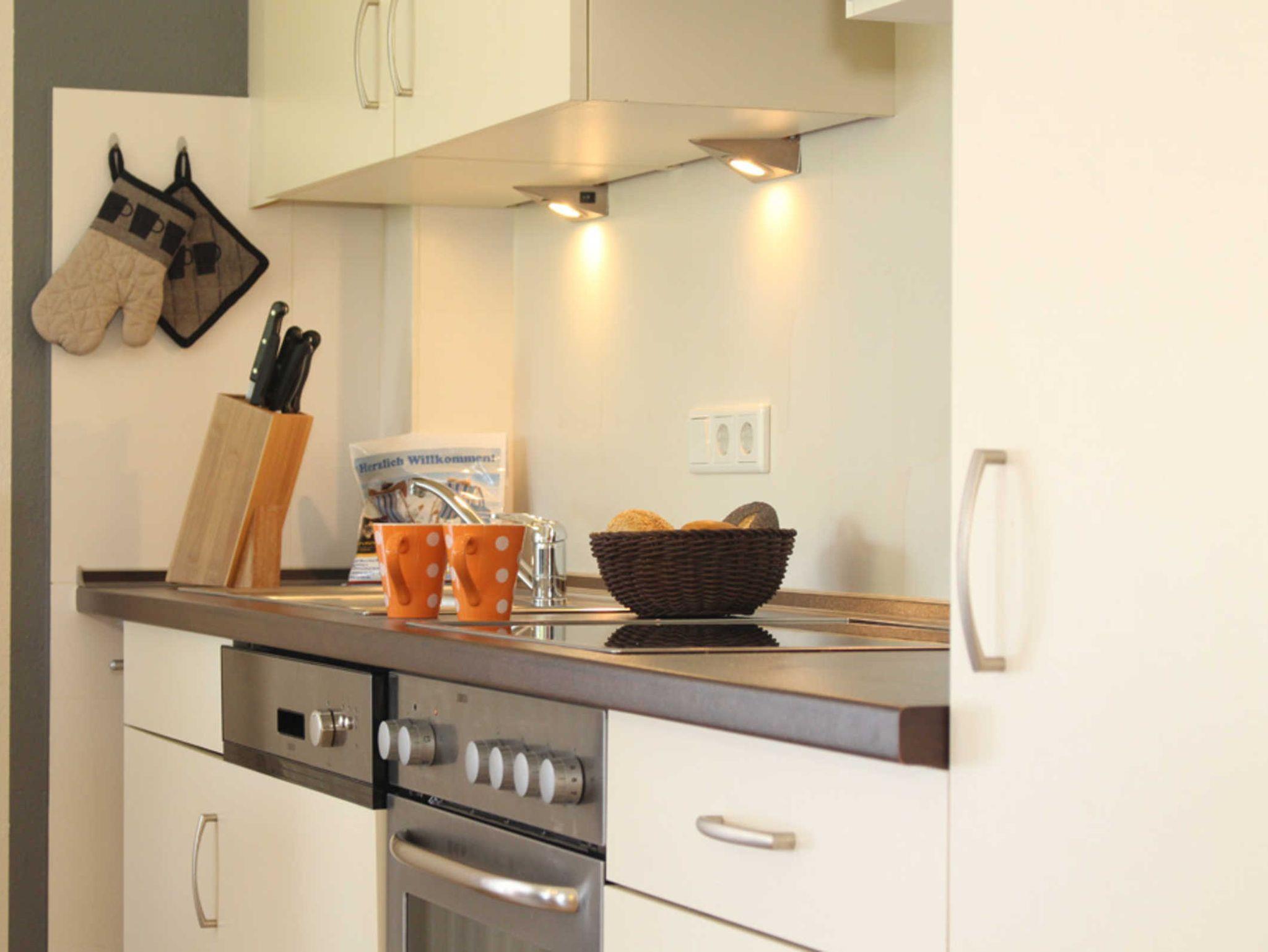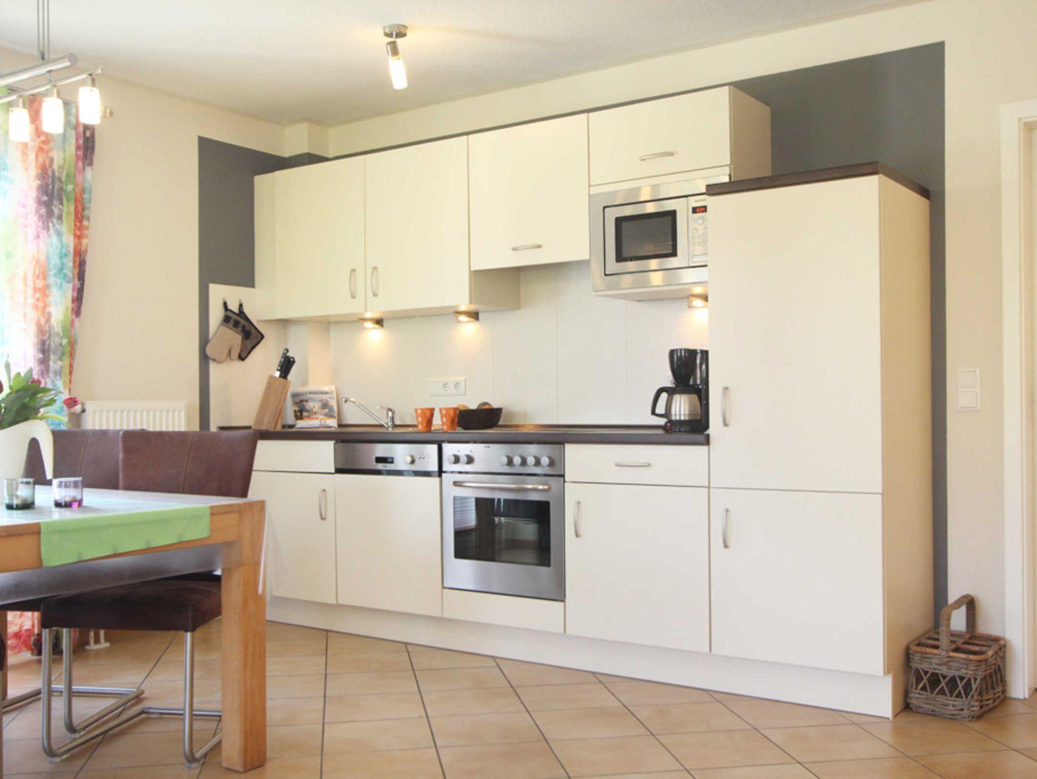 In der gemütlichen Wohnküche mit Wohnbereich, Küchenzeile und Essplatz befindet sich eine gemütliche Sofaecke. Die Küchenzeile ist mit allen gängigen Küchengeräten eingerichtet. So verzichten Sie nicht auf frisch gebrühten Kaffee, Toast und Tee. Um das schmutzige Geschirr kümmert sich die Geschirrspülmaschine.