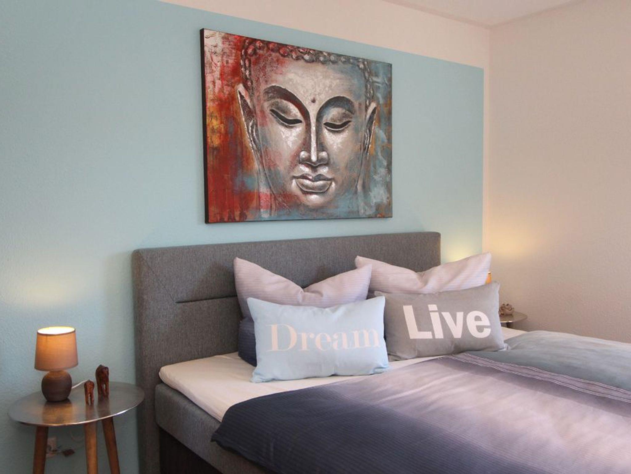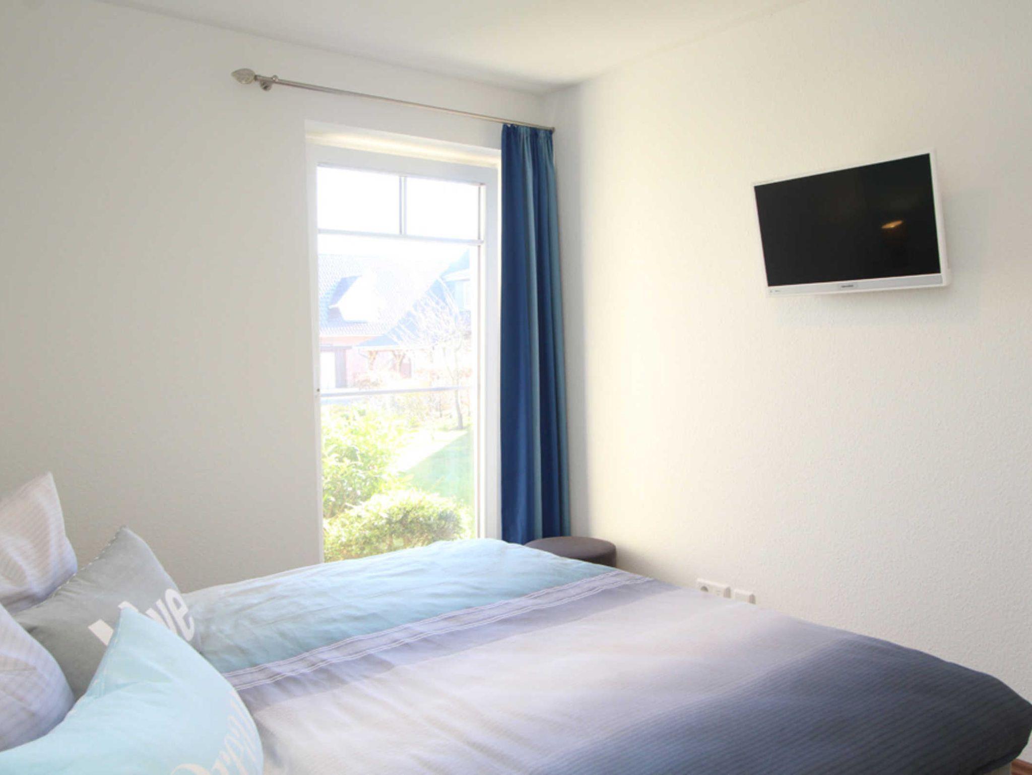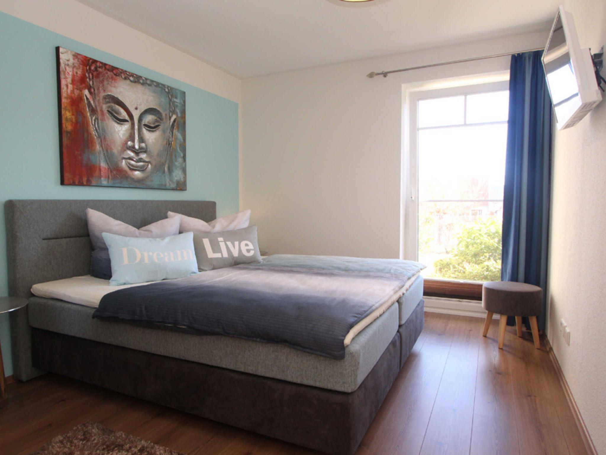 Das Schlafzimmer lädt mit einem komfortablen Boxspringbett für zwei Personen und einem LED-TV an der Wand zu kuscheligen Filmabenden im Bett ein.