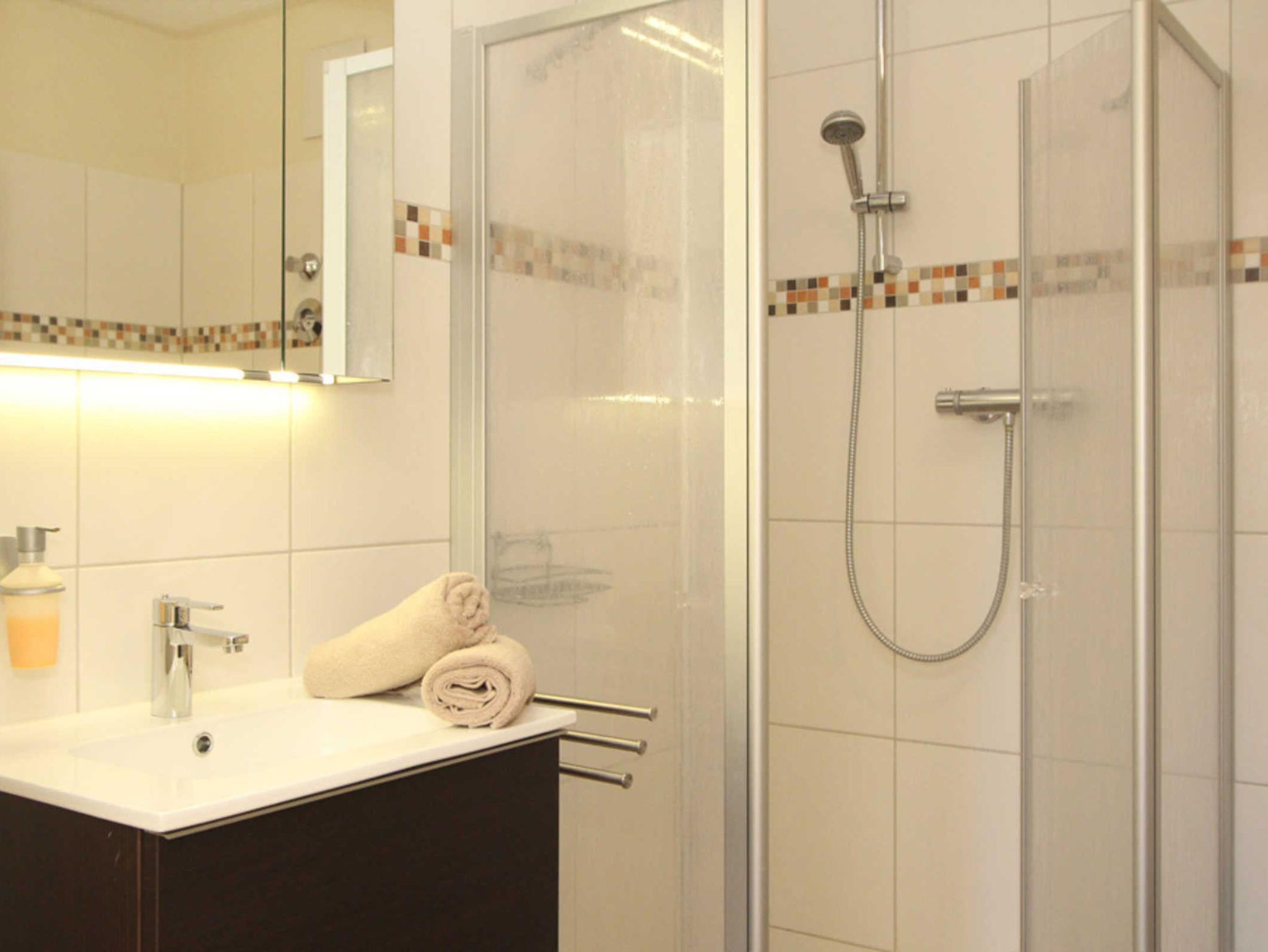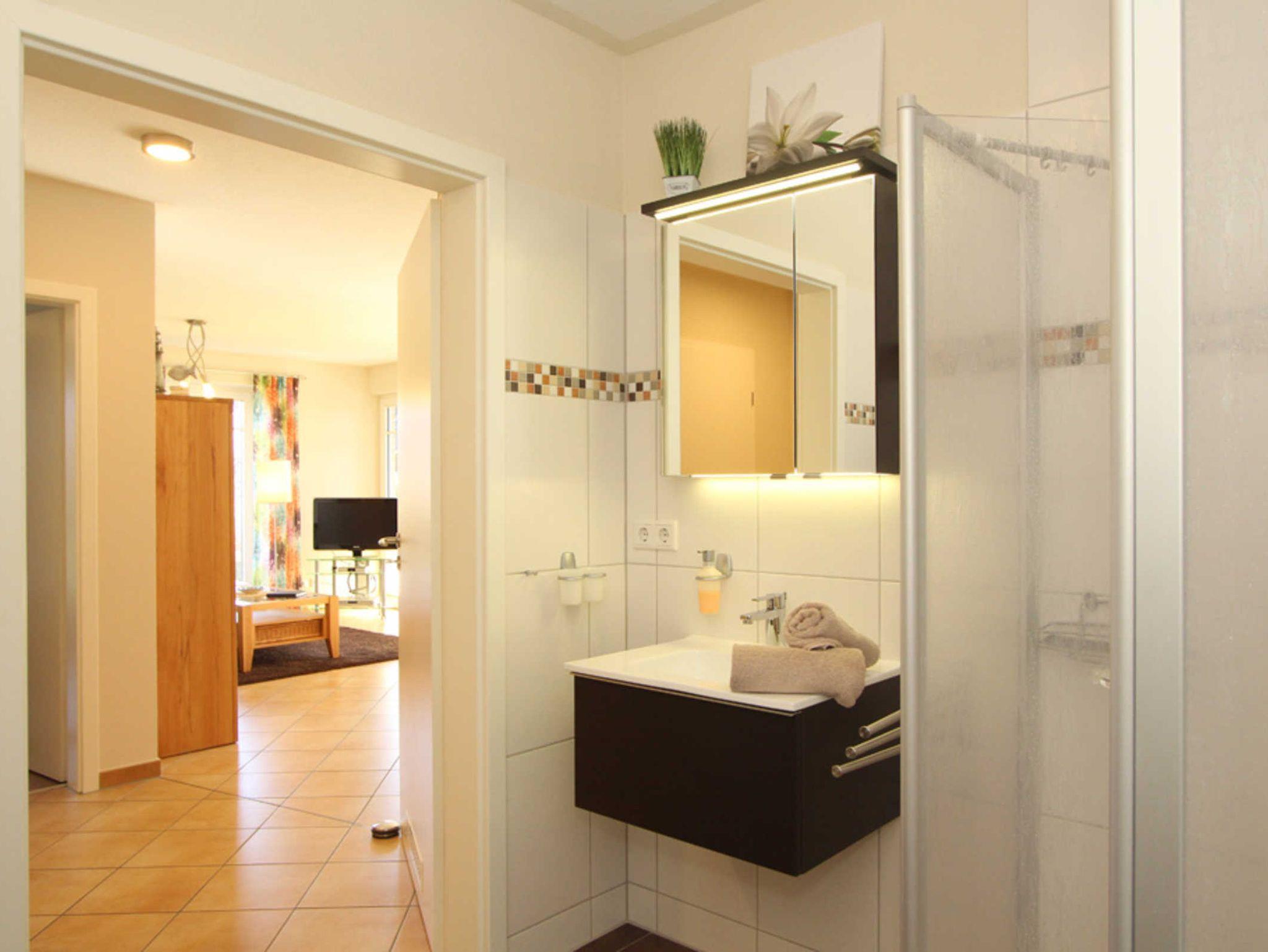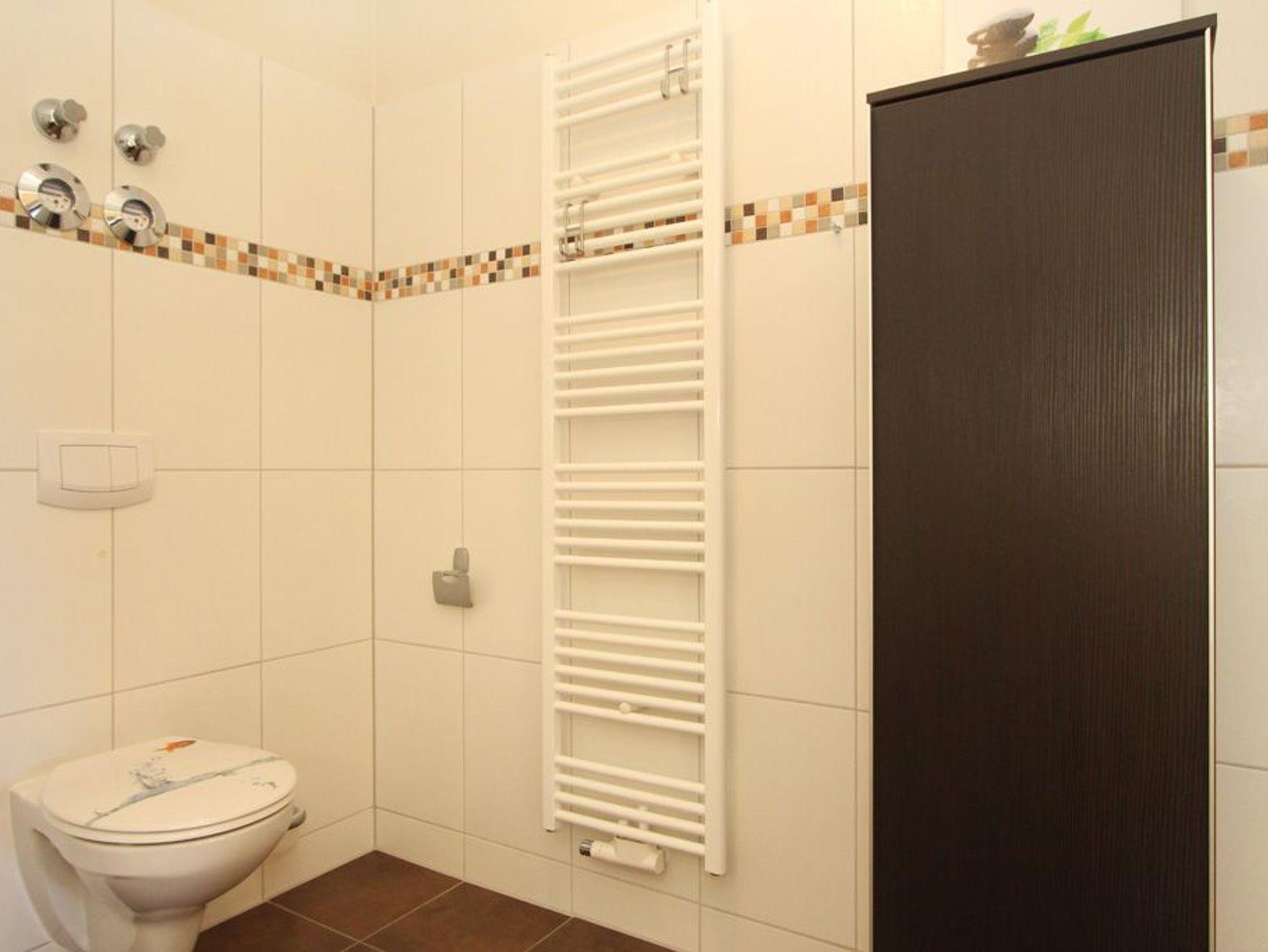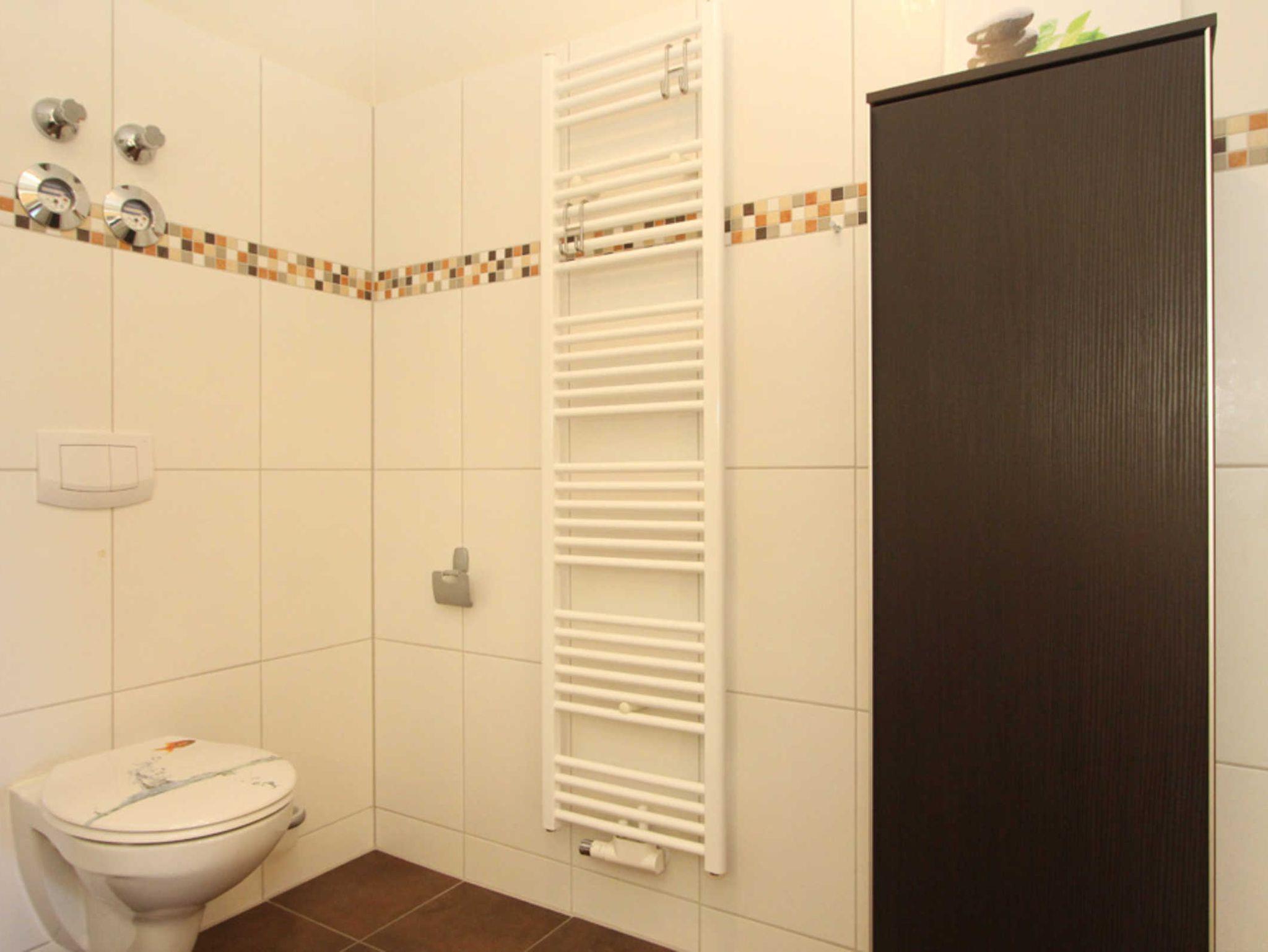 Das barrierefreie Duschbad mit WC ist hell gefliest und modern eingerichtet. Eine große Handtuchheizung sorgt zusätzlich für wohlige Wärme.