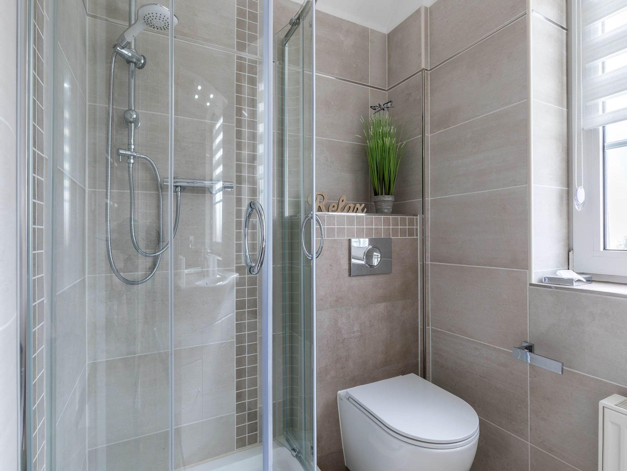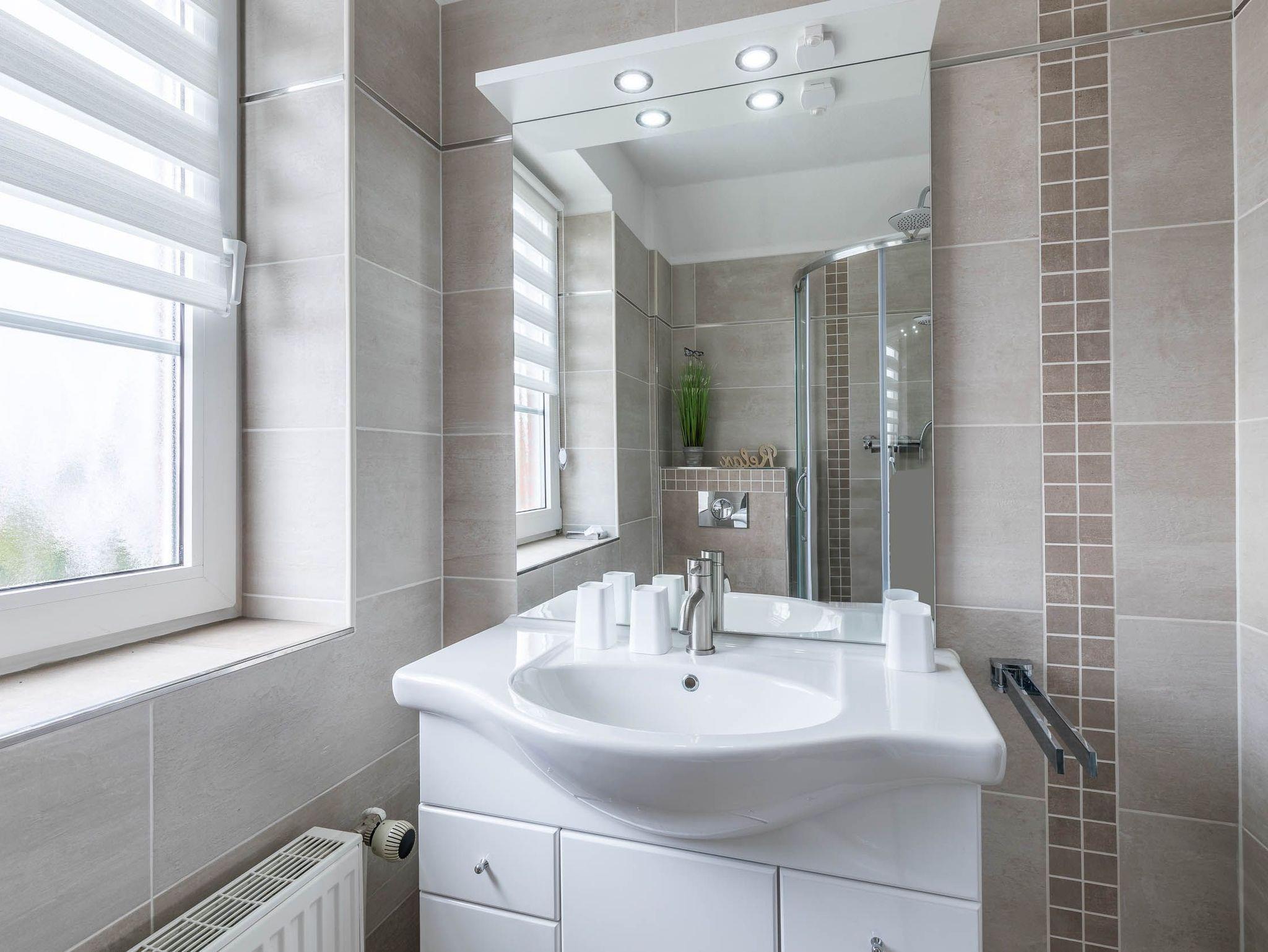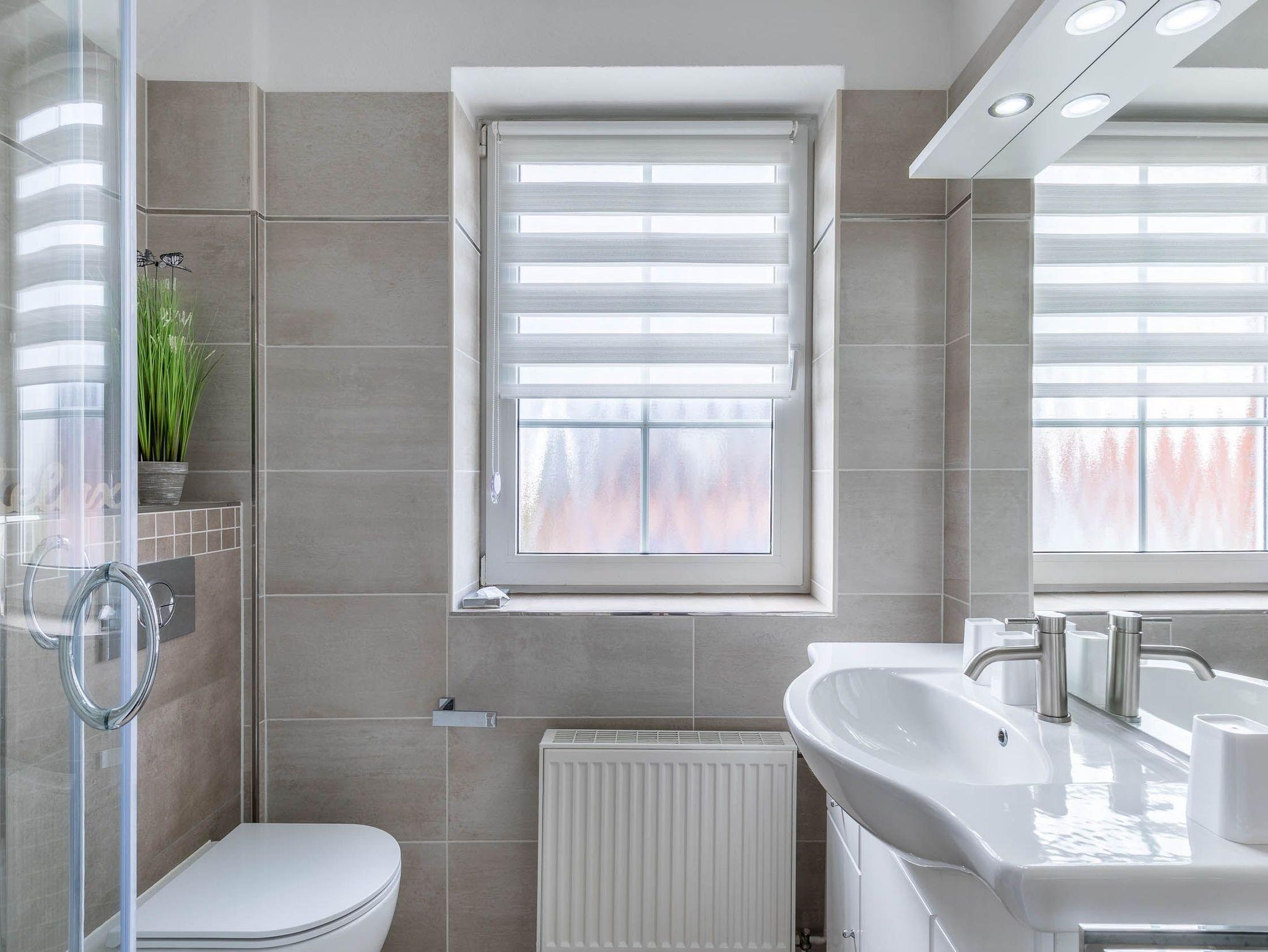 Das hell geflieste Badezimmer mit viel Tageslicht ist mit Dusche, WC und Waschtisch ausgestattet.
