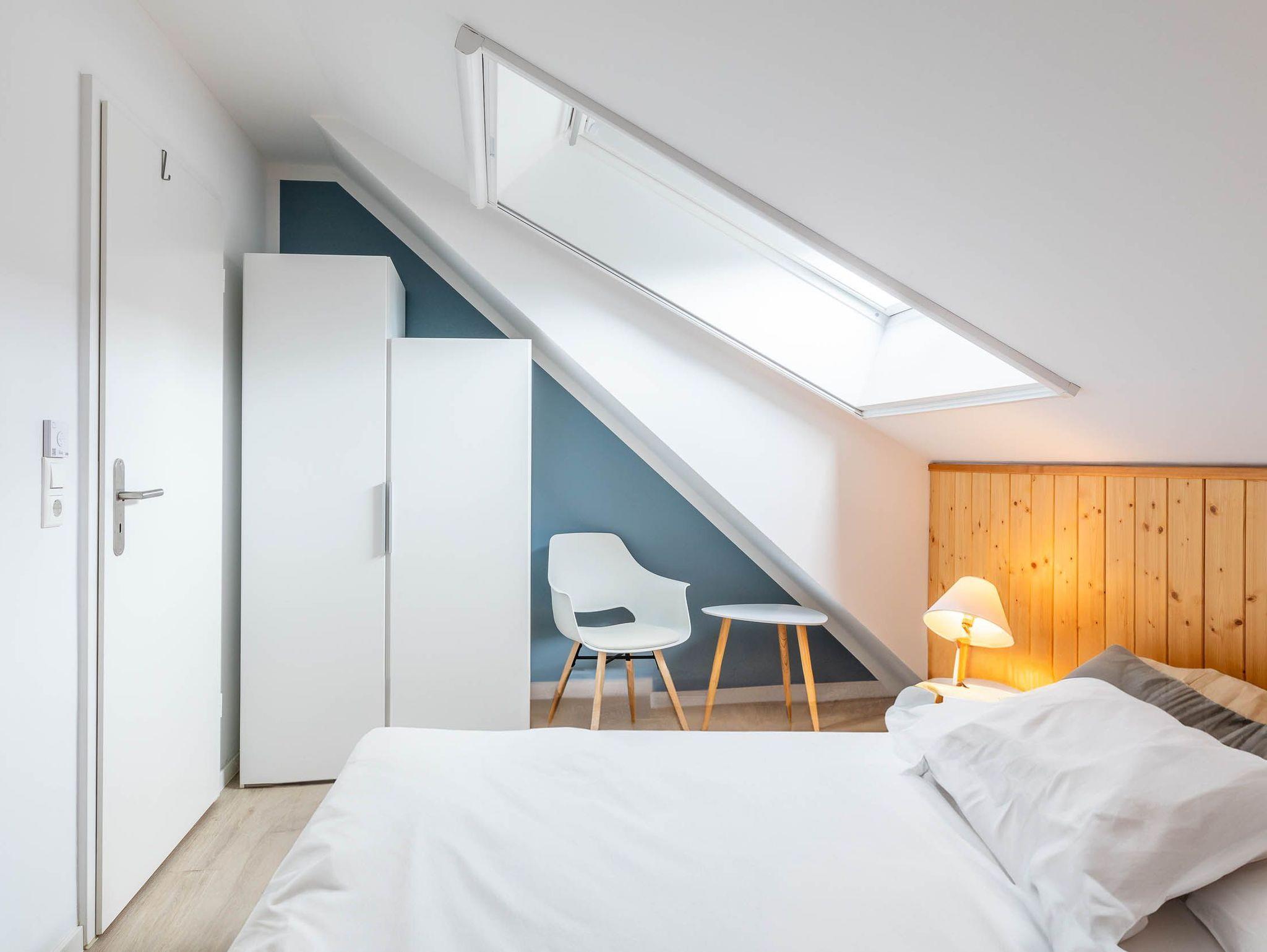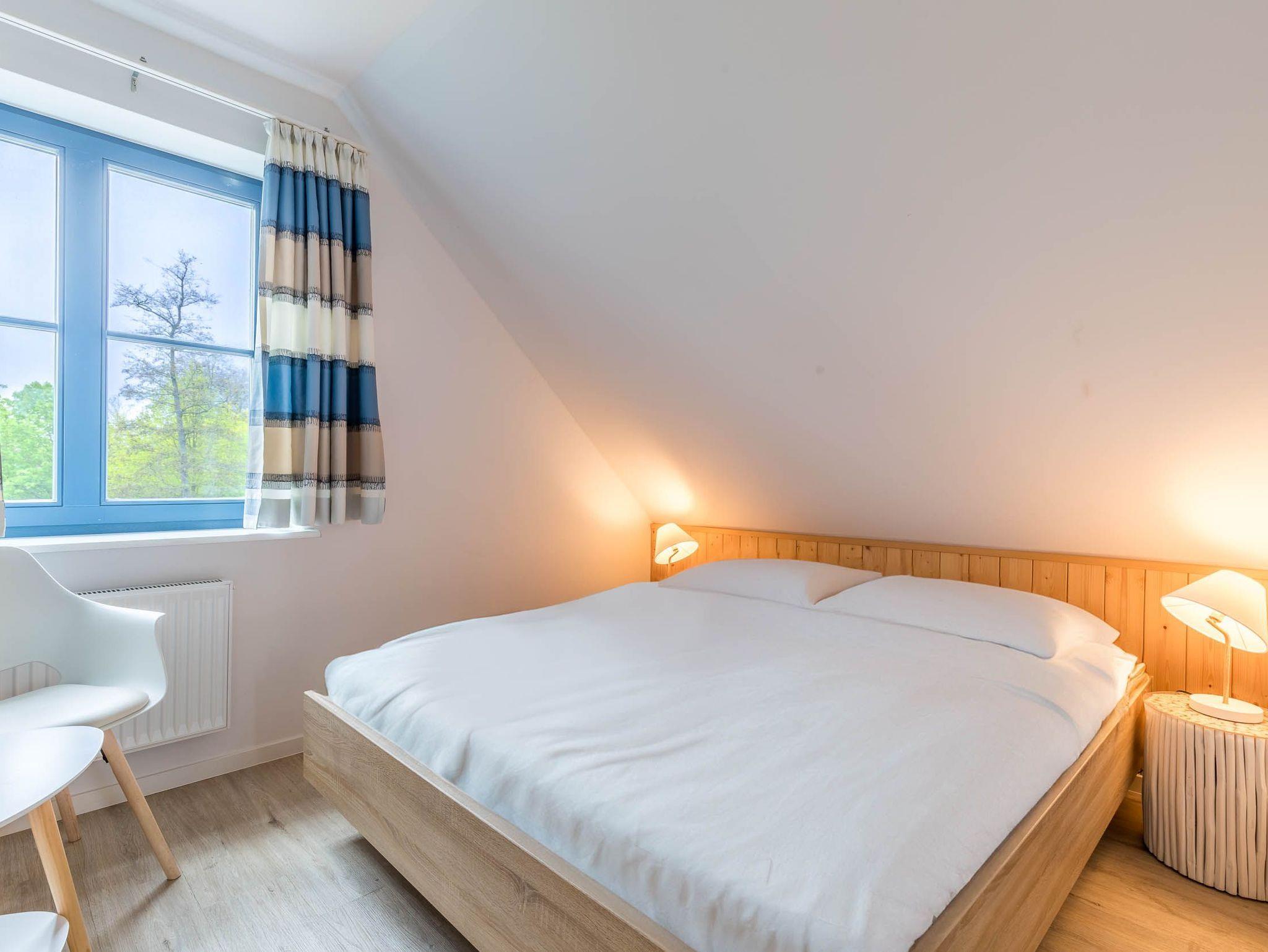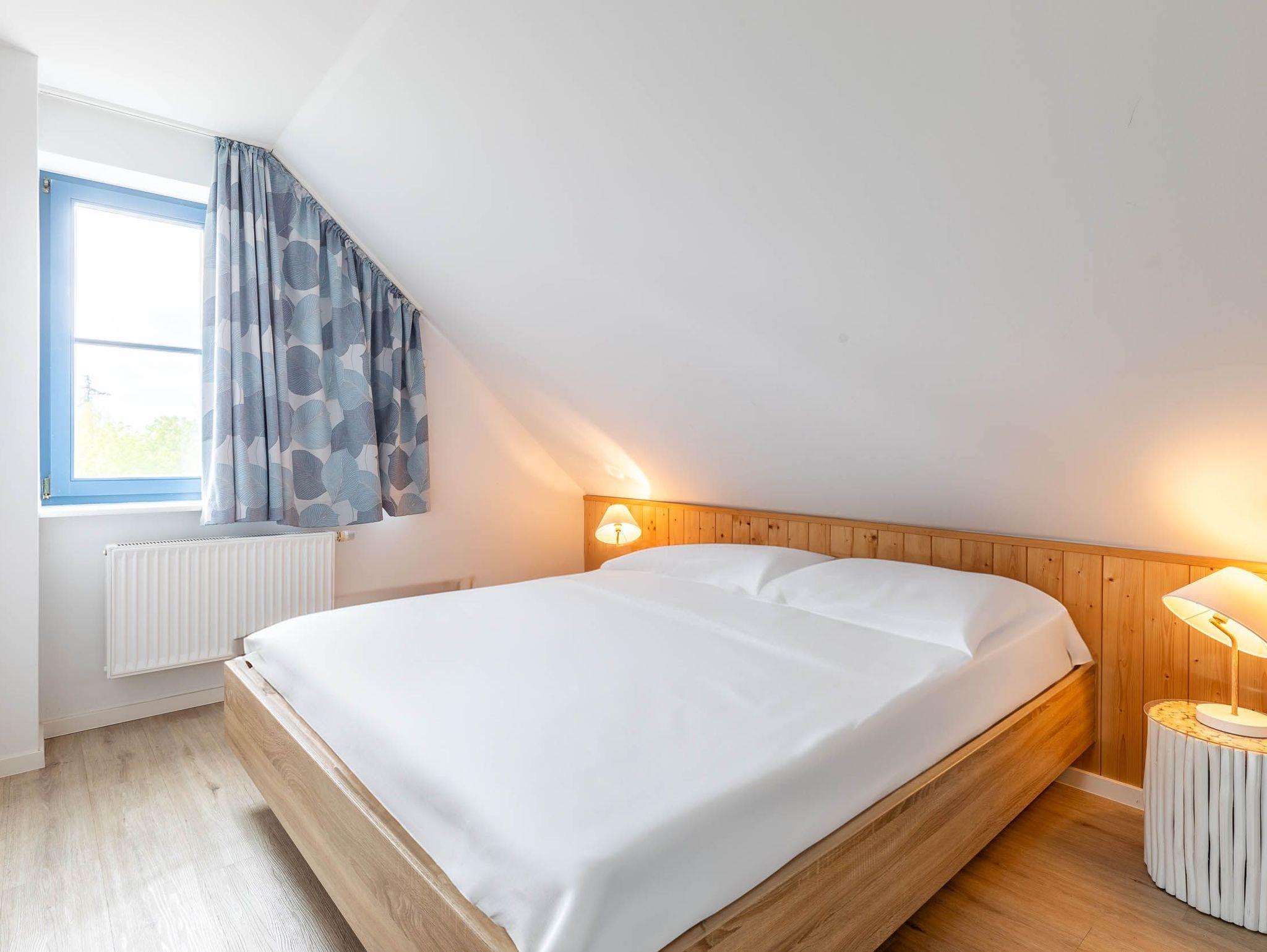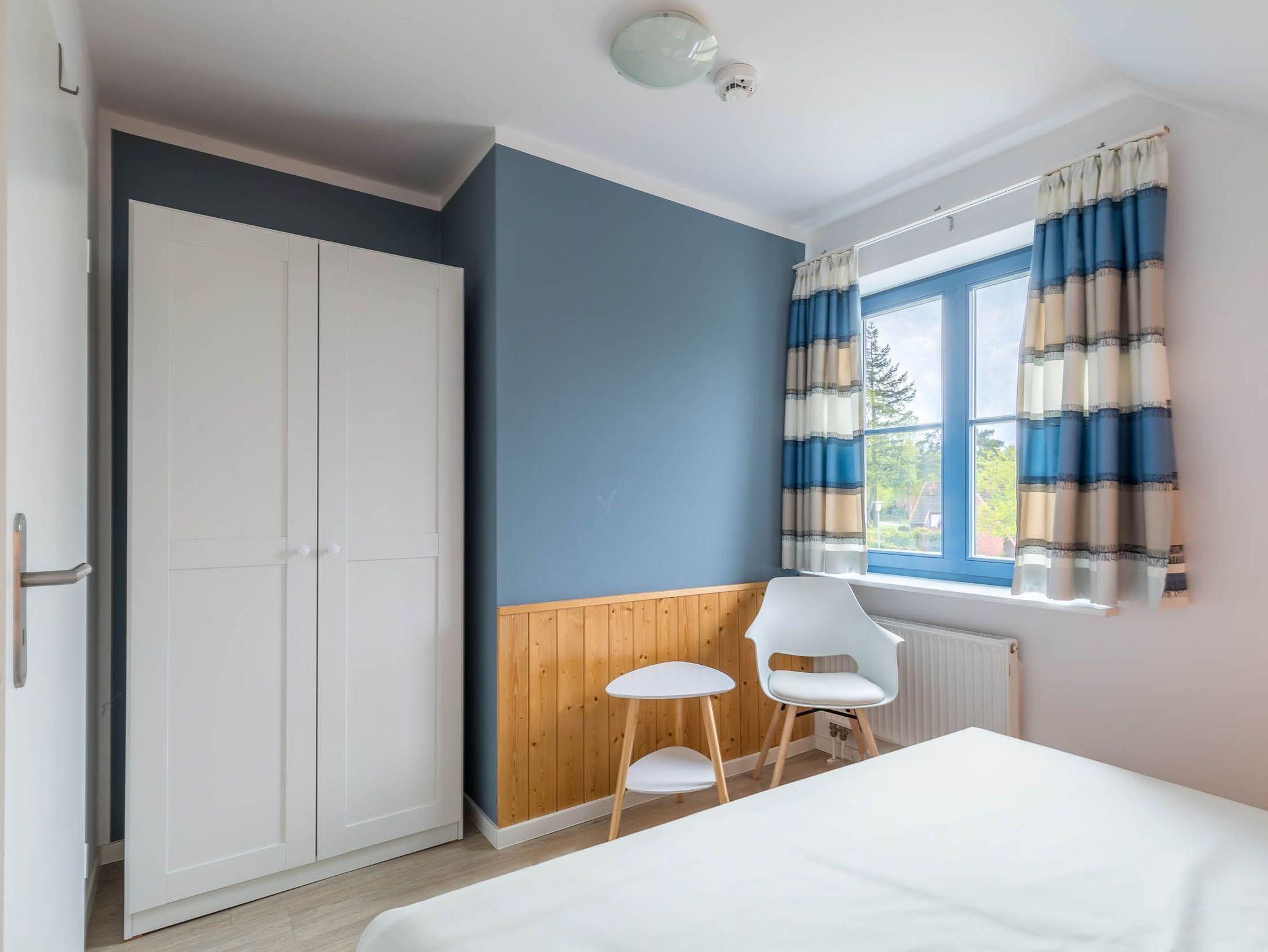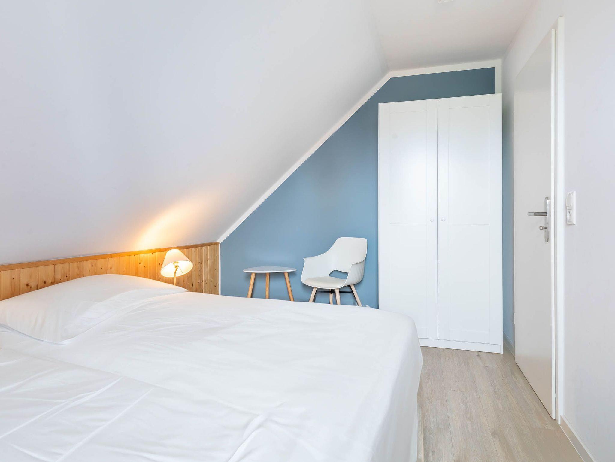 Weiterhin finden Sie auf dieser Wohnebene das erste der insgesamt 3 Schlafzimmer. Es bietet ein bequemes Doppelbett (160x200cm) und einen Kleiderschrank für Ihre Urlaubsgarderobe.