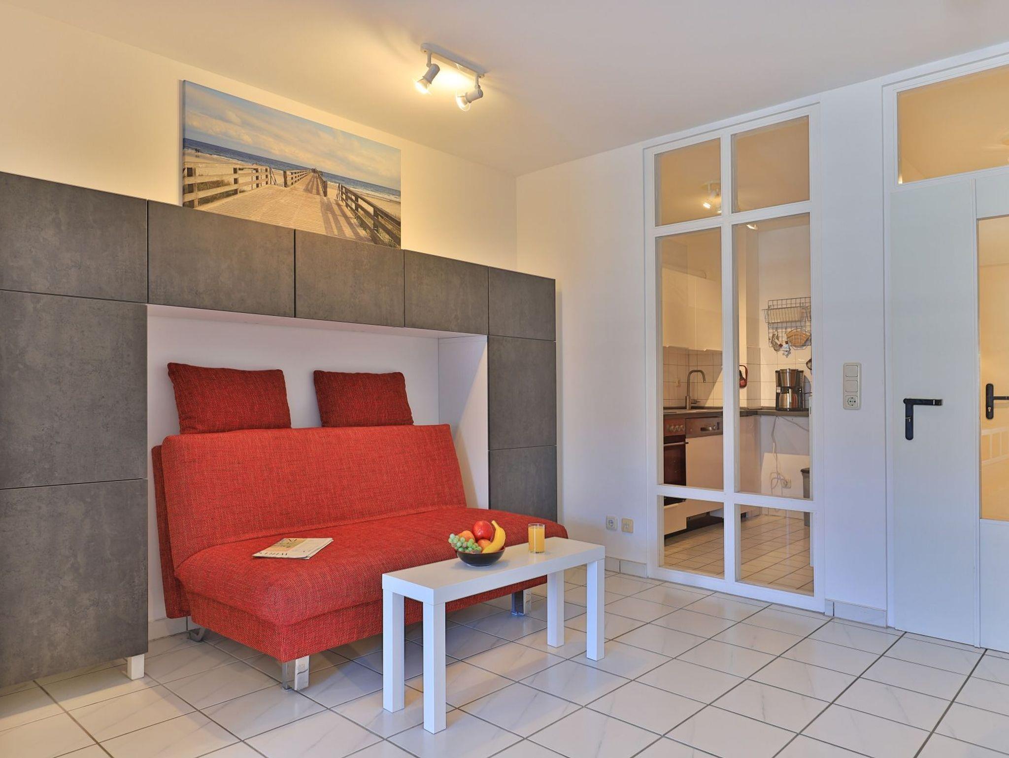 Das geschmackvoll eingerichtete 2-Zimmer-Appartement im 2. Obergeschoss, liegt nur ca. 70 Meter vom schönen Ostseestrand entfernt. Mit einer Wohnfläche von 50 m² bietet die Ferienwohnung Platz für bis zu 4 Personen. Der Wohn-/Essbereich ist ausgestattet mit einem gemütlichen Sofa, einer Schlafcouch für 2 Personen, einem Esstisch sowie einem Fernseher mit DVD-Player und Musikanlage. WLAN steht Ihnen selbstverständlich gebührenfrei zur Verfügung. Die Küche ist separat und verfügt über einen Ceranfeldherd, Backofen, Mikrowelle, Dunstabzug, Geschirrspüler, Kaffeemaschine, Toaster und Wasserkocher. Ebenso sind Kochgeschirr und Besteck vorhanden. Auf dem saisonal möblierten Balkon werden Sie wunderbar entspannen. Im separaten Schlafzimmer erwartet Sie ein Doppelbett und im Kleiderschrank und Wäschekommode ist Platz für die Urlaubsgarderobe. Das hell geflieste Duschbad ist mit Waschtisch, Fön, WC, ausgestattet. Ein zusätzlicher Abstellraum mit Waschmaschinen- und Wäschetrocknernutzung ist ebenso vorhanden, wie Bügelbrett, Bügeleisen. Ihren PKW parken Sie bequem auf dem fest zugeordneten Stellplatz in der Tiefgarage, wo sich auch ein Fahrradabstellraum befindet. Ein Fahrstuhl bringt Sie mühelos in die 2. Etage. In der Nähe finden Sie einen Bäckerladen sowie zahlreiche Restaurants und Cafés, die zu einem entspannten Aufenthalt einladen. Bitte beachten Sie, dass in dieser Wohneinheit das Rauchen nicht gestattet ist und Haustiere nicht erlaubt sind.
