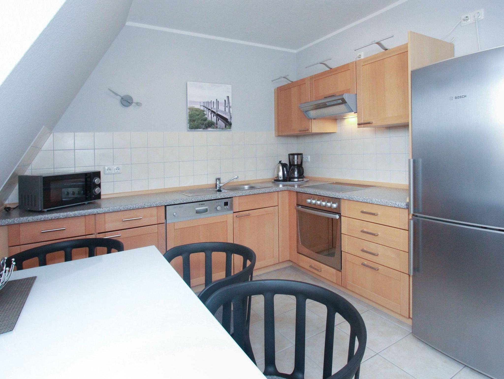 Die separate Küche ist mit Esstisch und großer Küchenzeile zeitlos und ebenfalls komfortabel möbliert. Ob Sandwichtoaster, Pasta oder Pizzateller, es ist alles vorhanden. Hier können Sie dank des modernen Radios (läuft über WLAN) beim Frühstücken auch ganz gespannt Musik und Nachrichten hören.