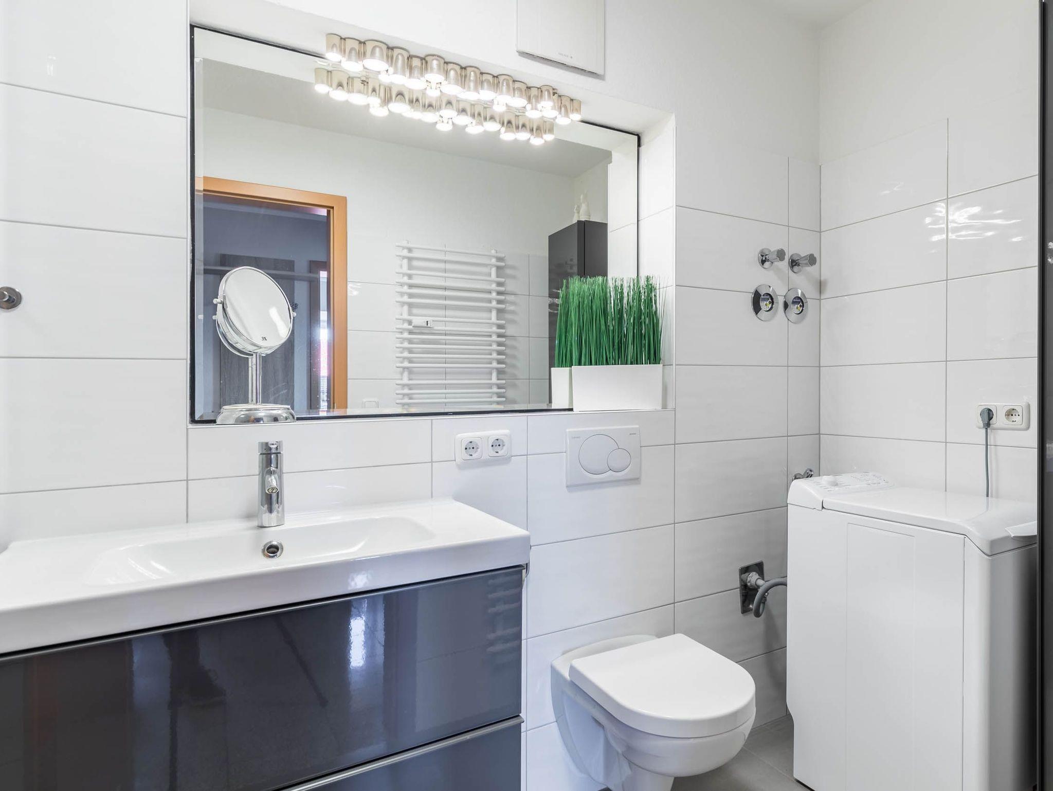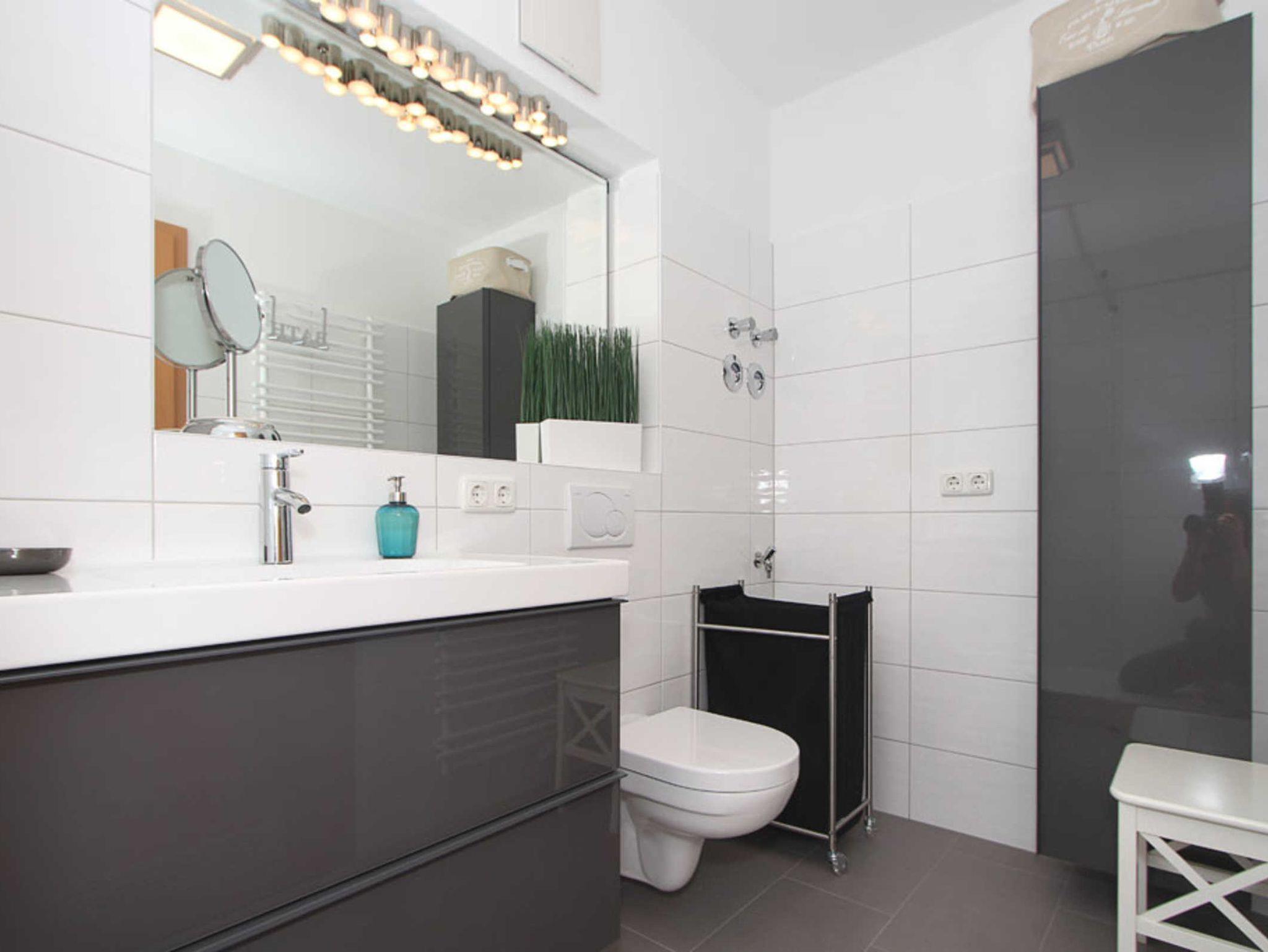 Das Badezimmer bietet Waschtisch, Dusche und WC. Der Eingangsbereich ist einladend eingerichtet.