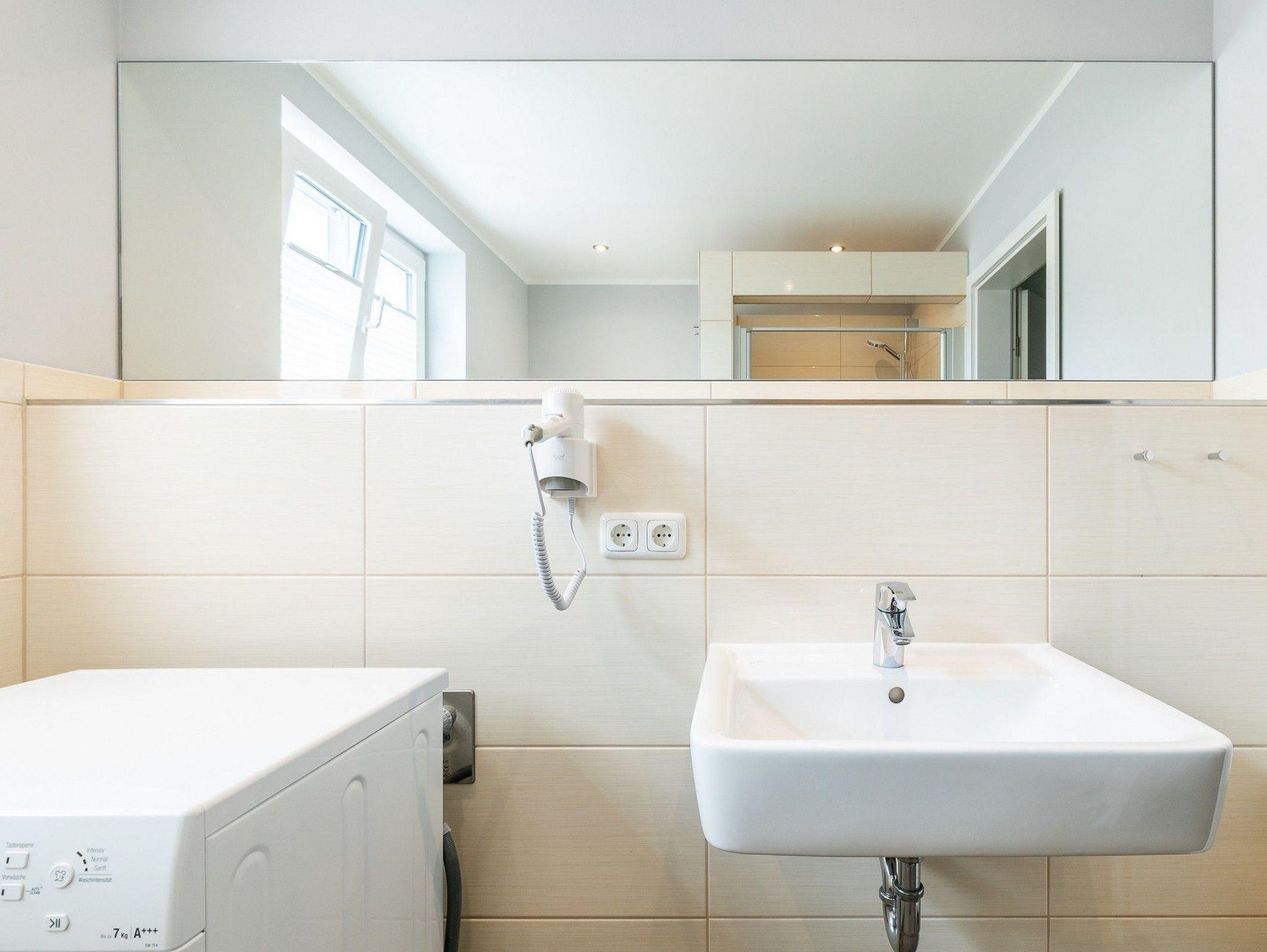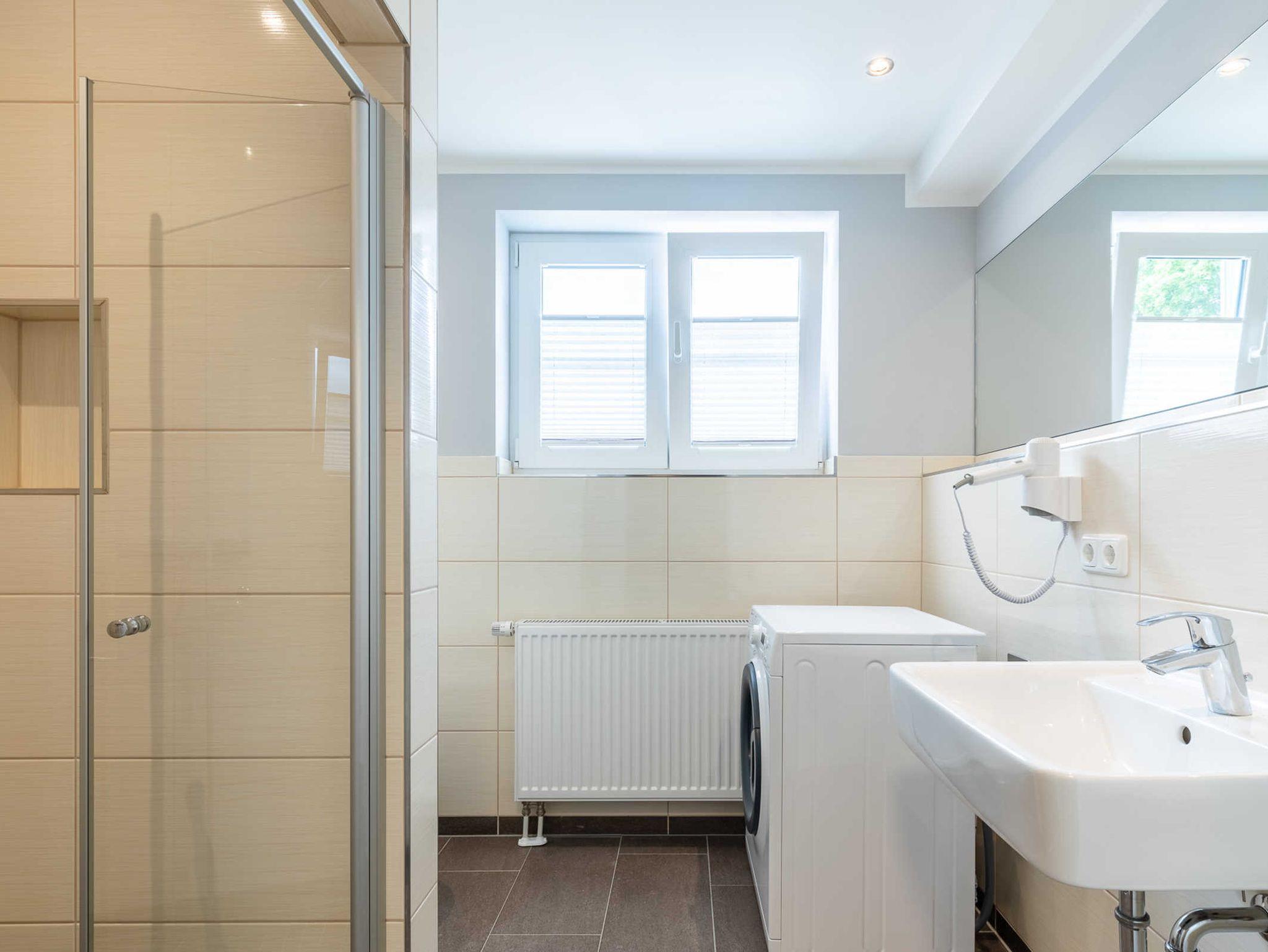Ein großes Bad mit Tageslicht bietet eine barrierefreie Dusche, Waschbecken, WC und auch eine Waschmaschine.