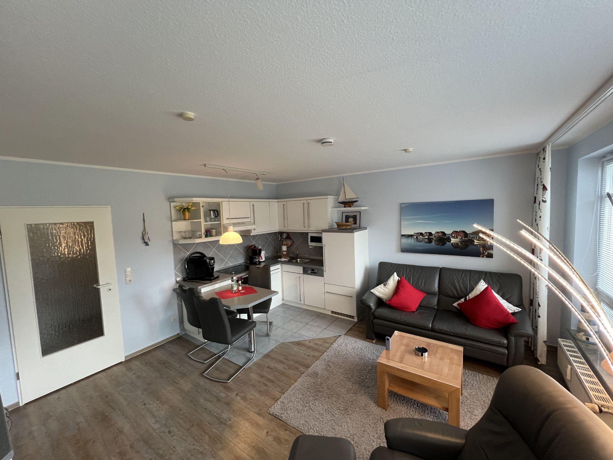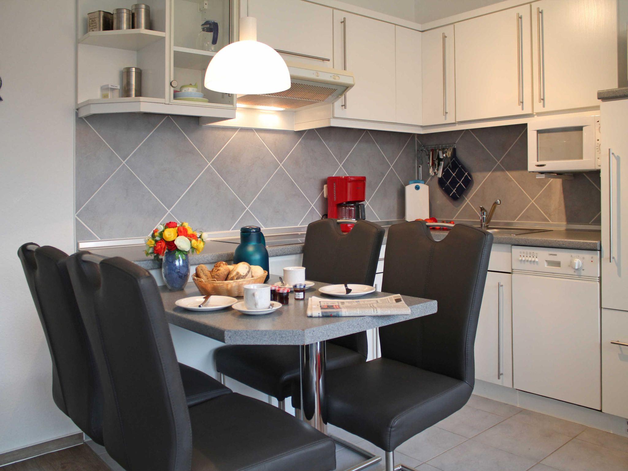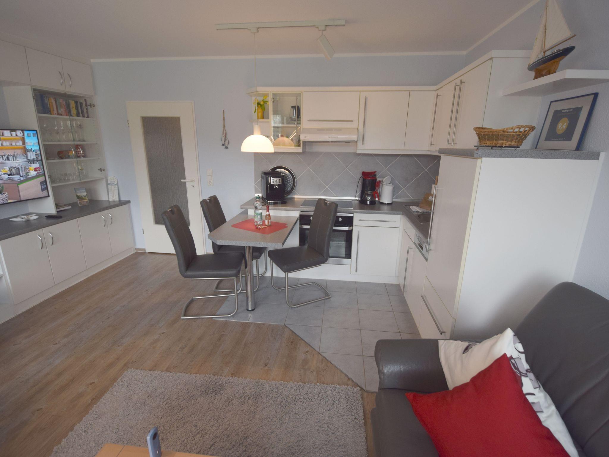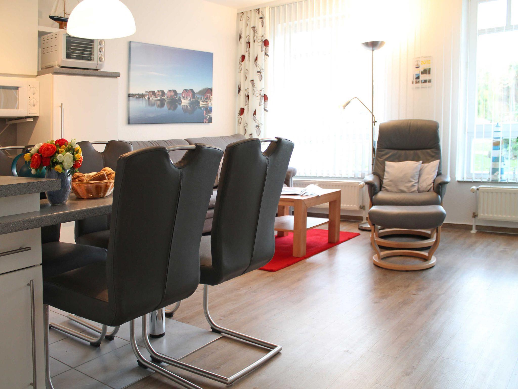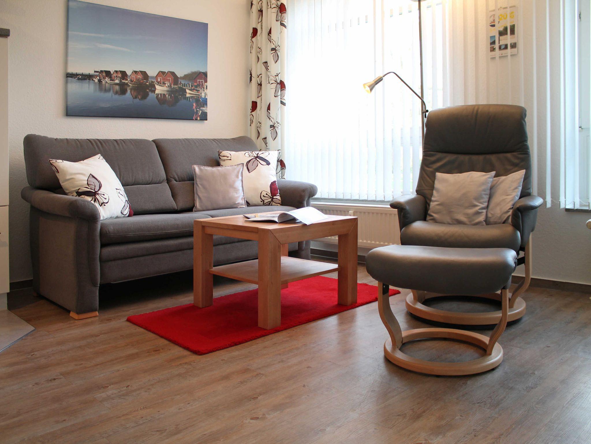 Die Wohnung ist hochwertig ausgestattet und entspricht einem 4-Sterne-Niveau. Das Schlafzimmer hat Doppelbett großen Einbauschrank mit viel Stauraum zusätzliche Kopfkissen und Bettdecken Das Wohnzimmer ist eingerichtet mit einem Sofa (für zwei zusätzliche Schlafplätze) zwei Sesseln und einem Tisch LCD-Fernseher sowie Musikanlage separater Leselampe kostenloses WLAN-Internet Telefonflat im Festnetzbereich Im Küchenbereich befindet sich ein Ess-Tresen, an dem bis zu drei Personen Platz finden. Die Küchenzeile ist ausgestattet mit Kühlschrank Geschirrspüler Mikrowelle Ceranfeld mit vier Platten Wasserkocher Toaster Kaffeemaschine sämtlichem Geschirr und Besteck Weitere Ausstattungsmerkmale sind z.B. Fön Bügeleisen Bügelbrett Wäscheständer Terrassenmöbel incl. 2 Rollliegen Die kpl. Wohnung ist mit modernem und pflegeleichtem Vinyl-Designboden ausgelegt, der Küchenbereich ist gefliest. Auch für unsere kleinsten Gäste ist gesorgt: Kinderbett mit Kopfkissen und Bettdecke (Bettwäsche ist bitte mitzubringen) Hochstuhl Kindergeschirr Die Wohnung ist für Allergiker geeignet, Haustiere sind nicht erlaubt.
