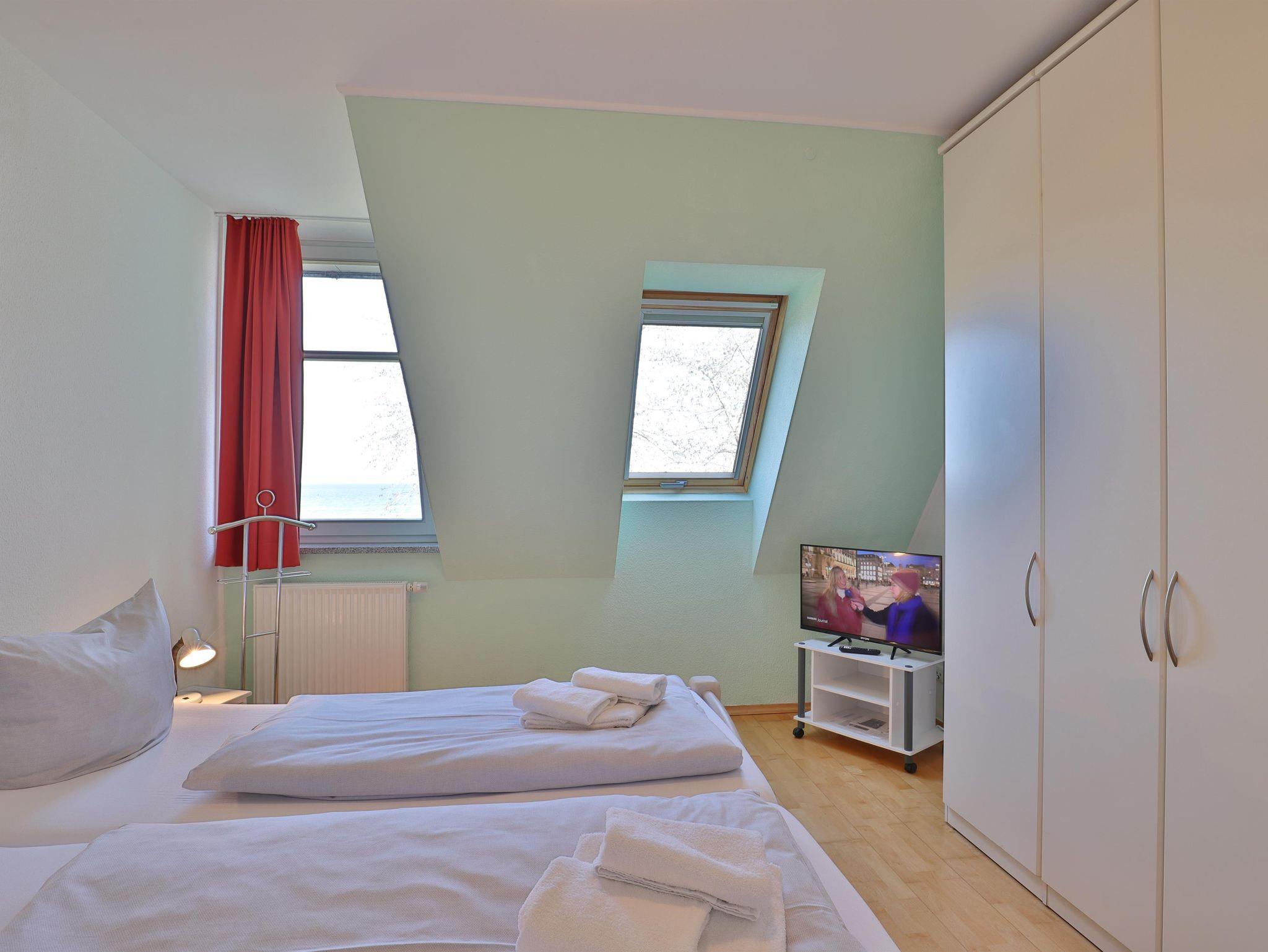 Das Schlafzimmer – ebenfalls mit herrlichem Ostseeblick – ist ausgestattet mit einem Doppelbett (180 x 200 cm) und einem großen Kleiderschrank. Ein weitere Flat Screen TV ist hier ebenfalls vorhanden. Das moderne und zweckmäßig ausgestattetes Tageslichtbad mit Dusche komplettiert die Ausstattung.