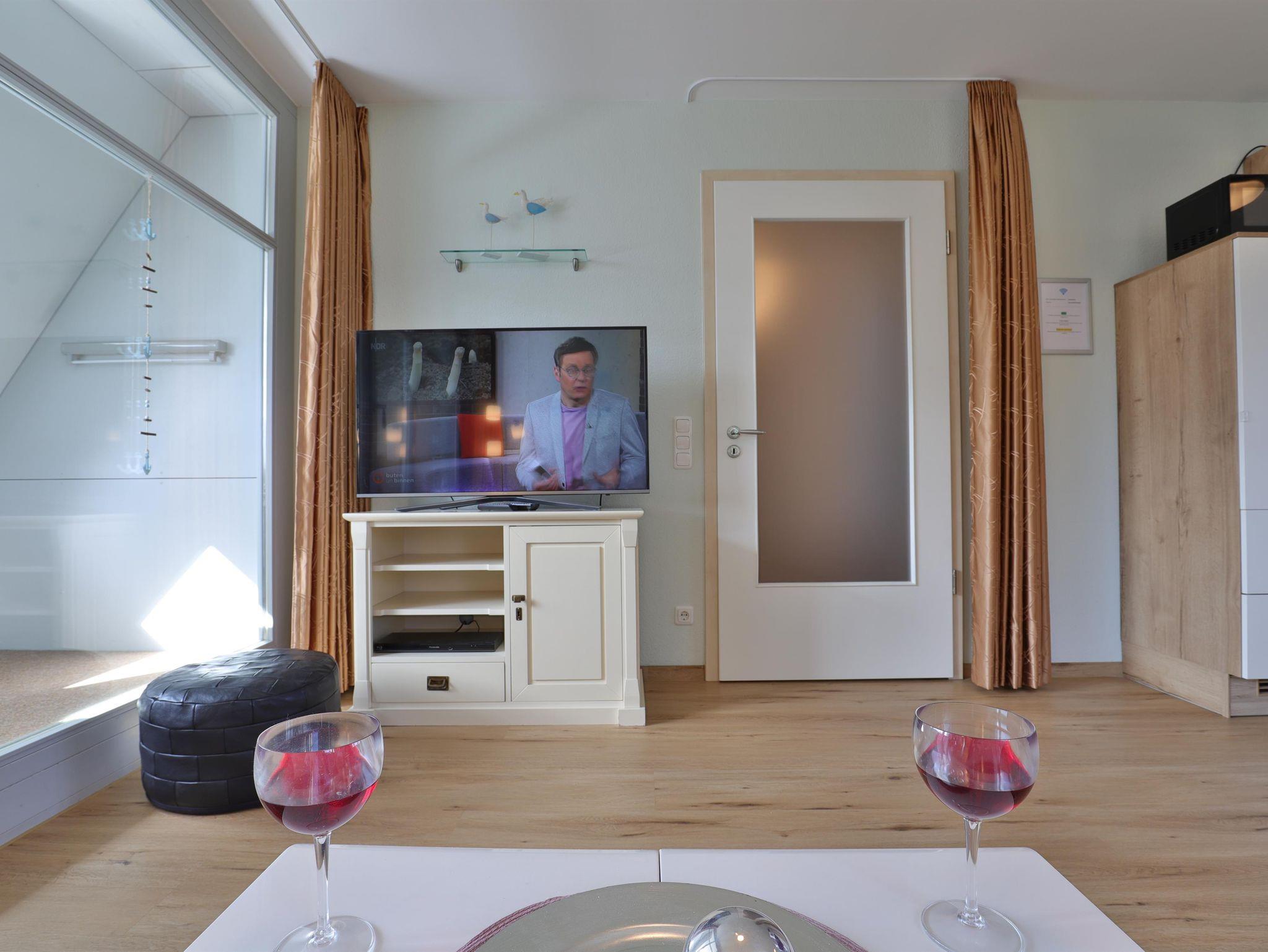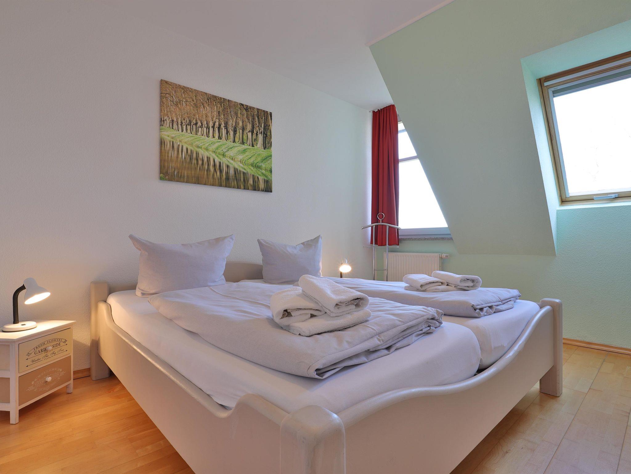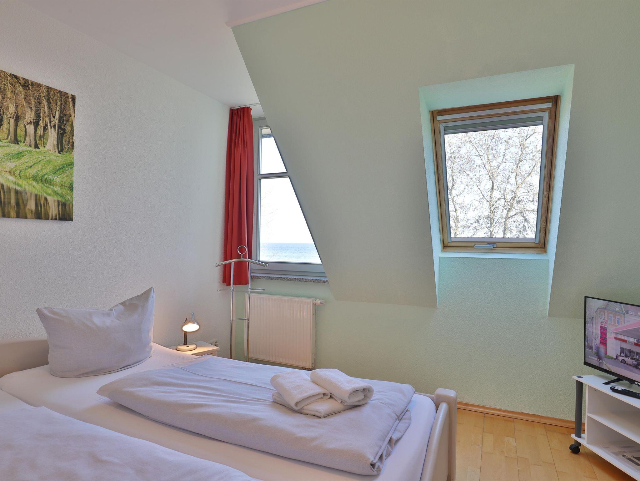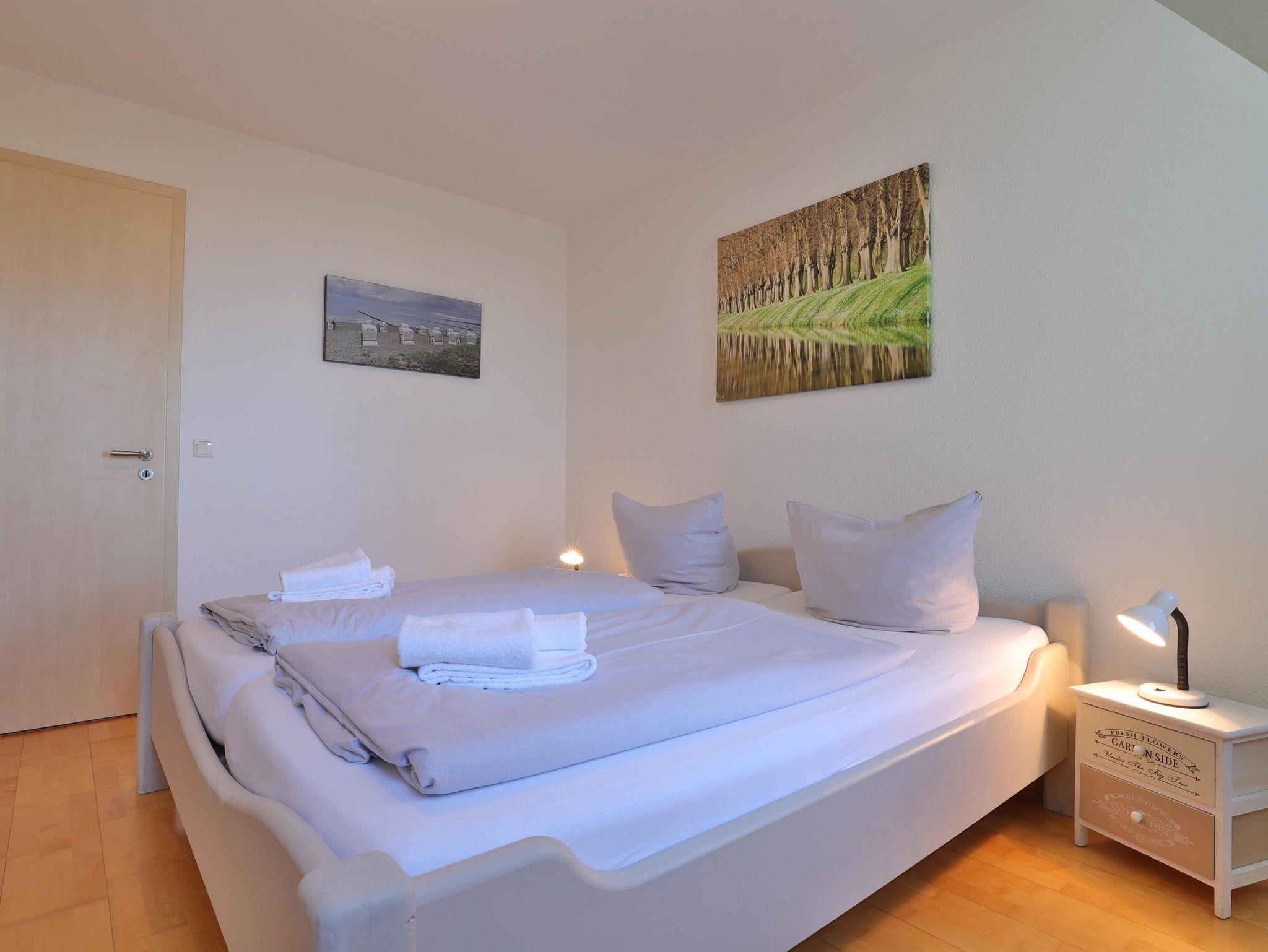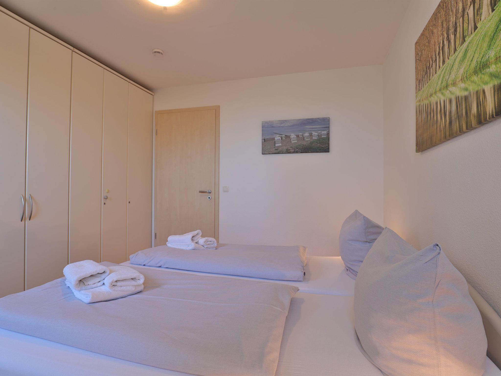 Das Schlafzimmer – ebenfalls mit herrlichem Ostseeblick – ist ausgestattet mit einem Doppelbett, einem großen Kleiderschrank und Flat Screen TV. Das moderne Tageslichtbad mit Dusche komplettiert die Ausstattung.