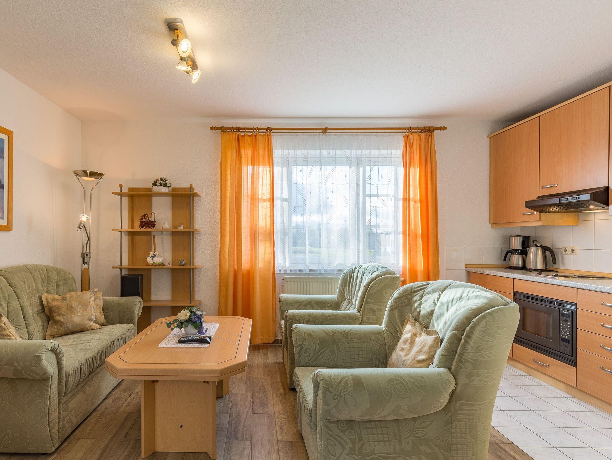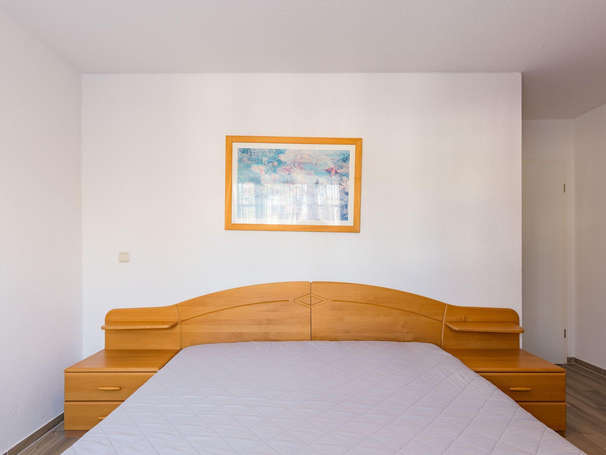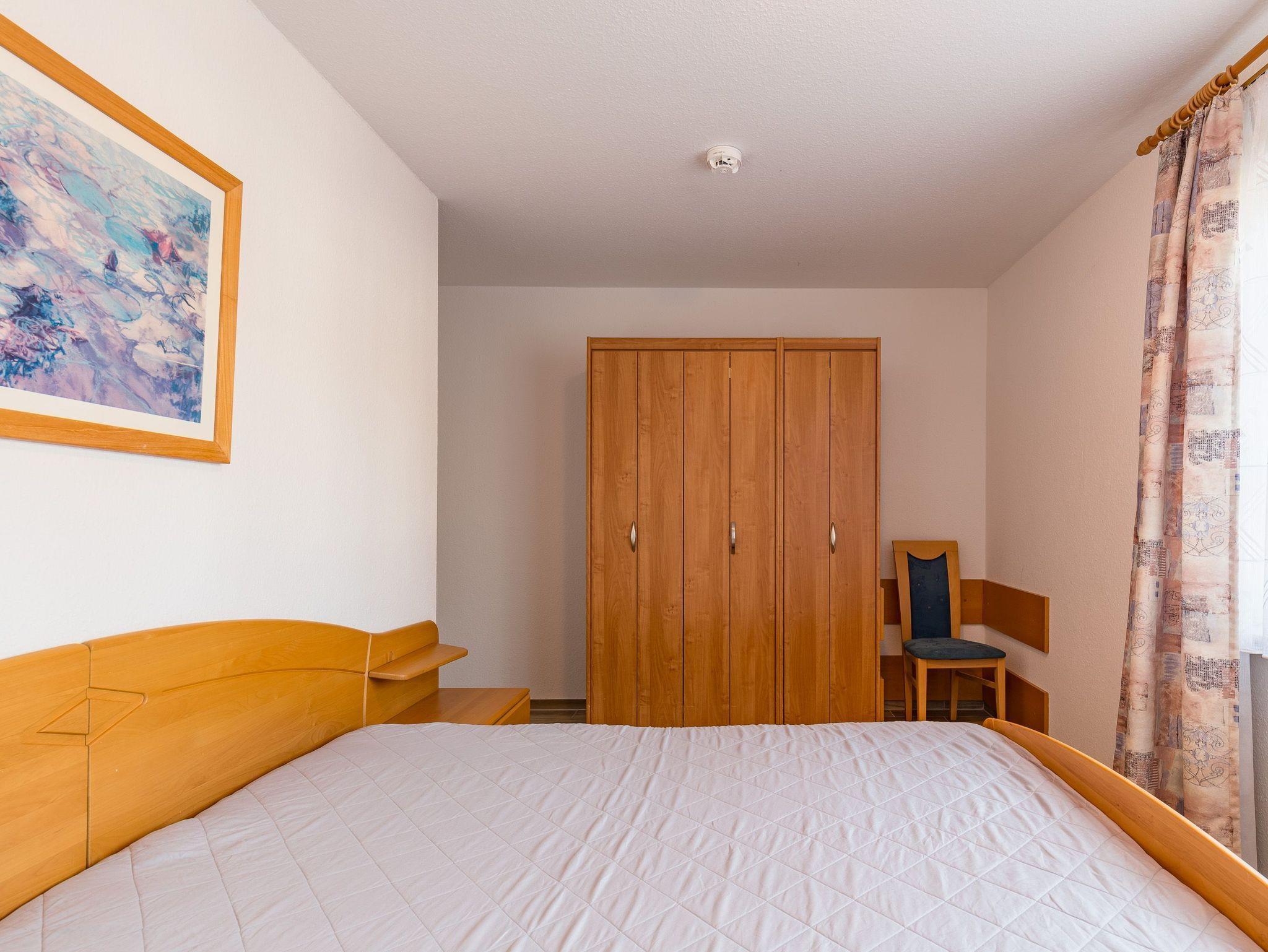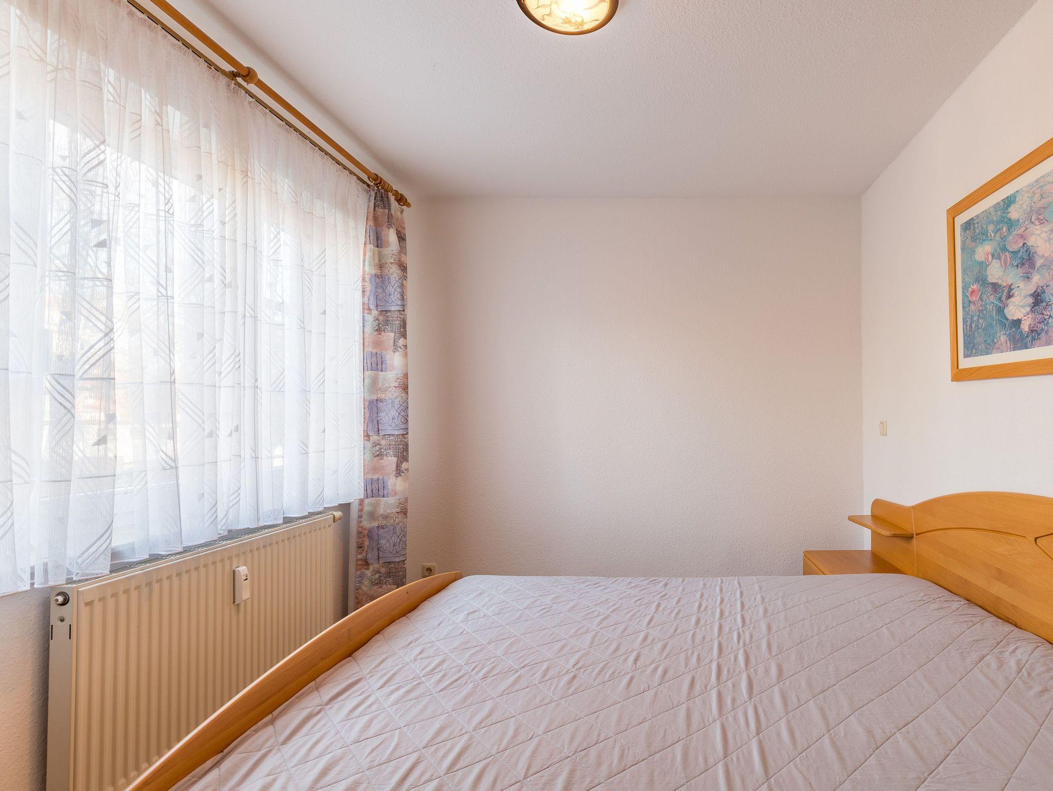 In der Küchenzeile im Wohnzimmer finden Sie eine Einbaumikrowelle, ein Kochfeld mit 2 Platten und einen kleinen Kühlschrank mit Gefrierfach. Im Schlafzimmer steht ein geräumiger Kleiderschrank für Ihre Urlaubsgarderobe. Das Doppelbett hat 2 einzelne Matratzen (Liegefläche 180x200 cm). Im kleinen Schlafzimmer stehen 2 Einzelbetten ( Liegeflächen: 90x200 cm und 90x180 cm) . Auf dem Balkon ( Westseite) stehen Balkonmöbel für Sie bereit. Ihr Auto stellen Sie sicher auf dem Außenstellplatz in der Nähe des Hauses ab. Haustiere sind in dieser Wohnung nicht erlaubt.