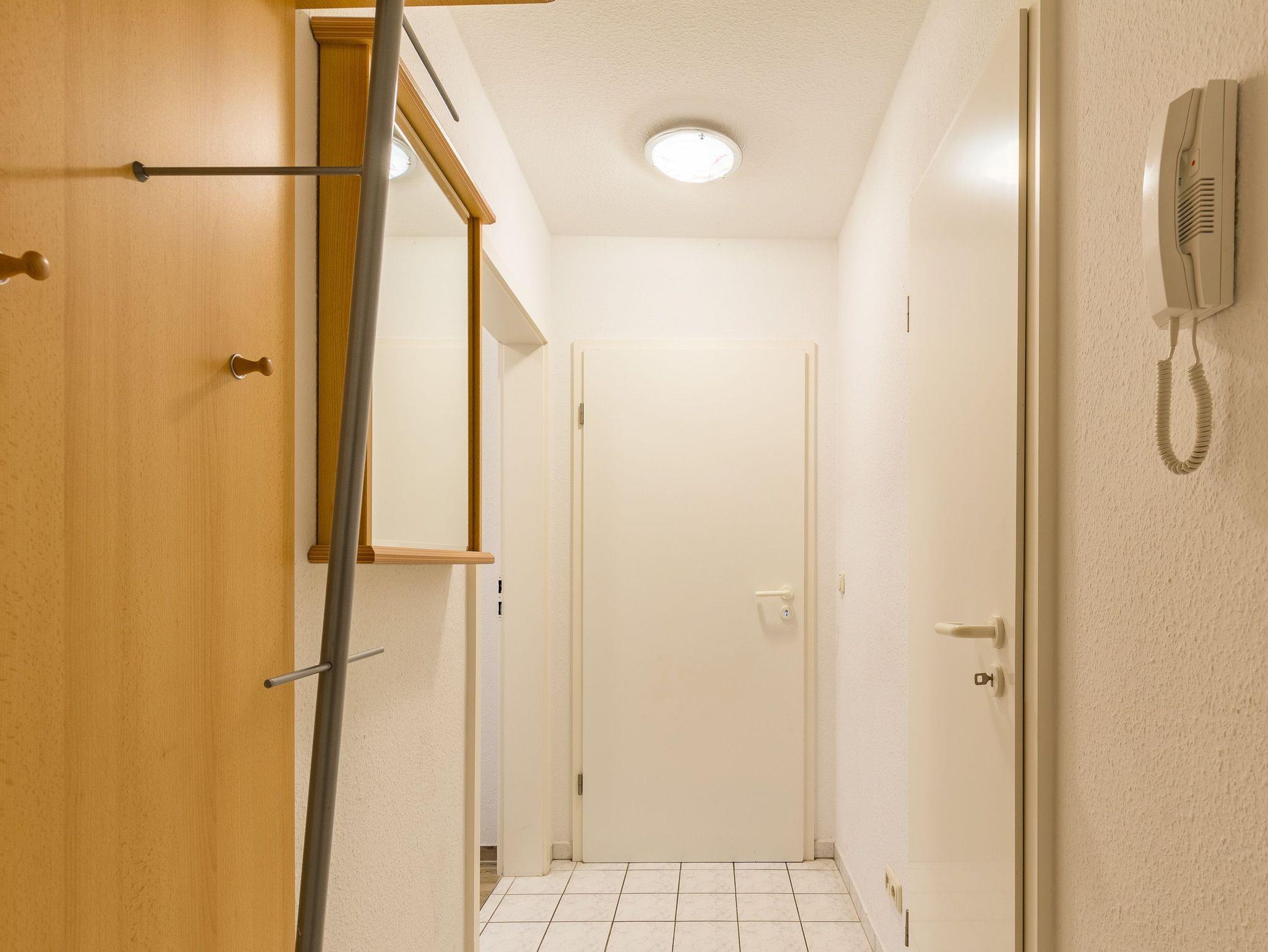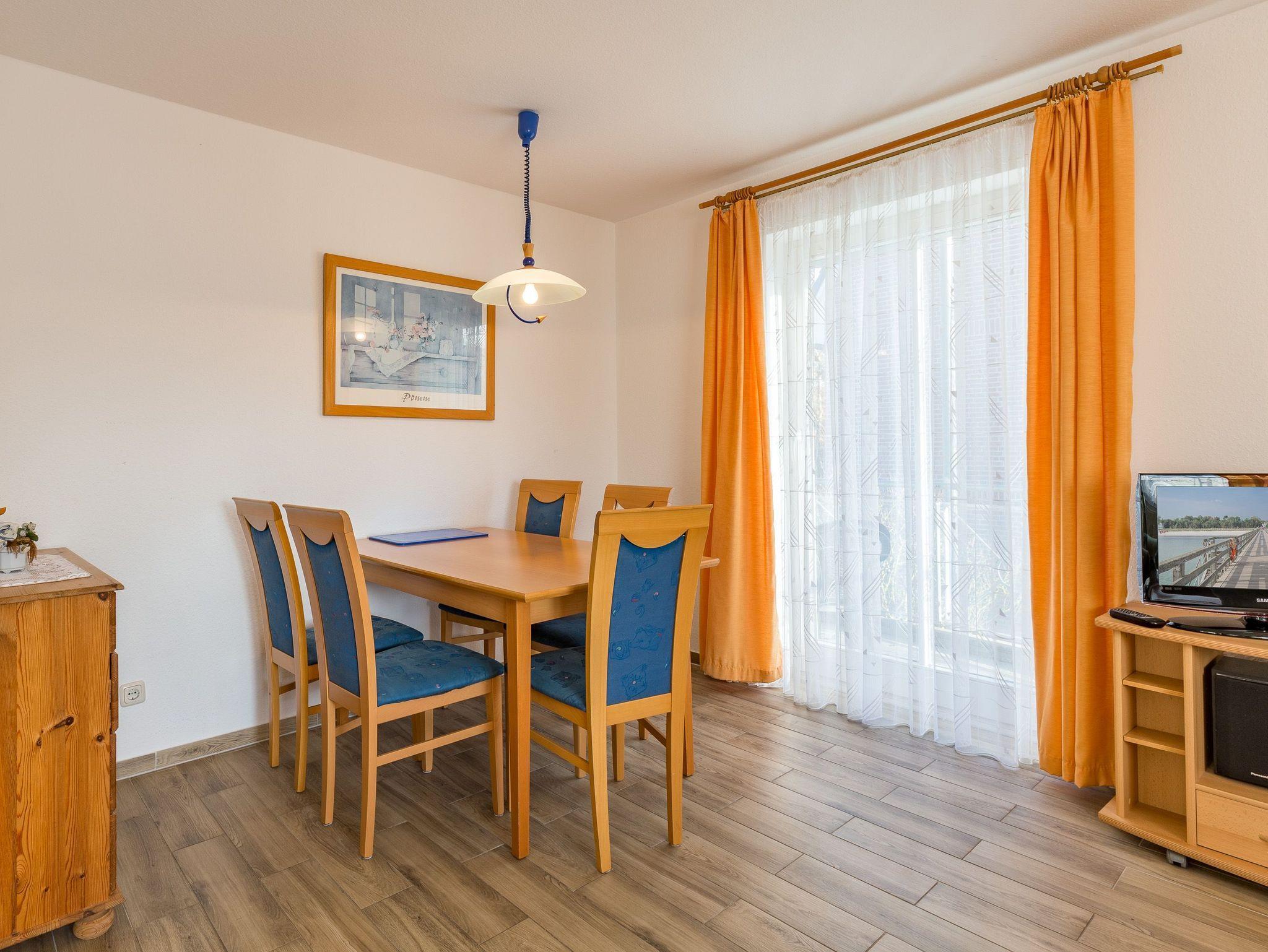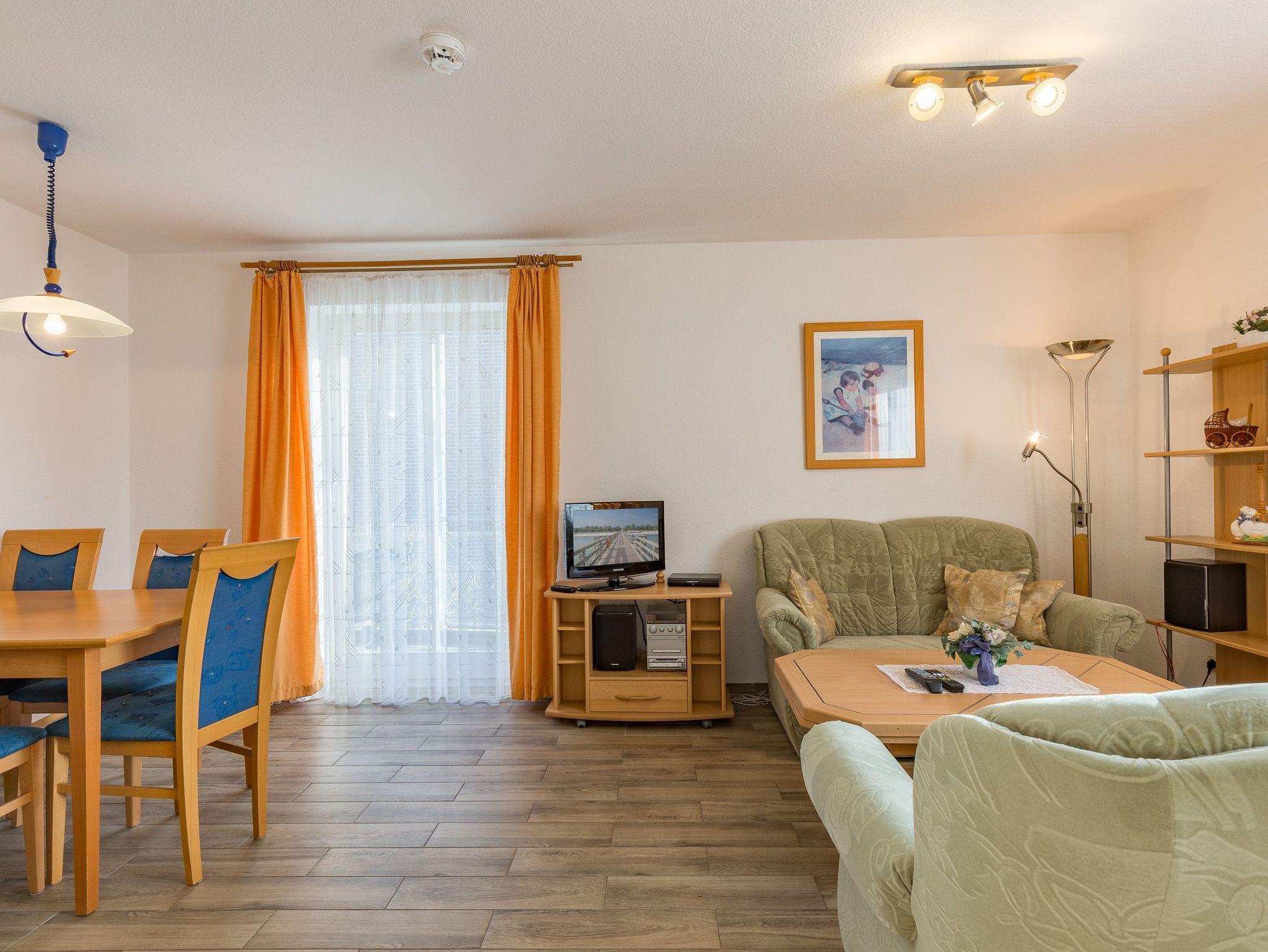 In der Küchenzeile im Wohnzimmer finden Sie eine Einbaumikrowelle, ein Kochfeld mit 2 Platten und einen kleinen Kühlschrank mit Gefrierfach. Im Schlafzimmer steht ein geräumiger Kleiderschrank für Ihre Urlaubsgarderobe. Das Doppelbett hat 2 einzelne Matratzen (Liegefläche 180x200 cm). Im kleinen Schlafzimmer stehen 2 Einzelbetten ( Liegeflächen: 90x200 cm und 90x180 cm) . Auf dem Balkon ( Westseite) stehen Balkonmöbel für Sie bereit. Ihr Auto stellen Sie sicher auf dem Außenstellplatz in der Nähe des Hauses ab. Haustiere sind in dieser Wohnung nicht erlaubt.
