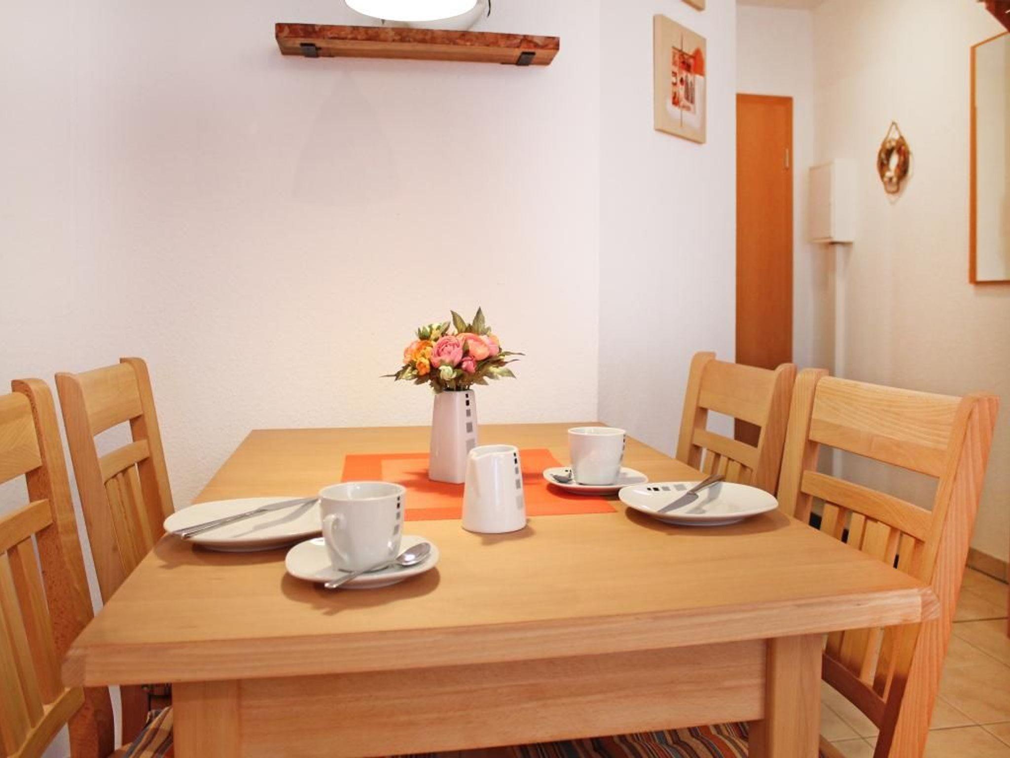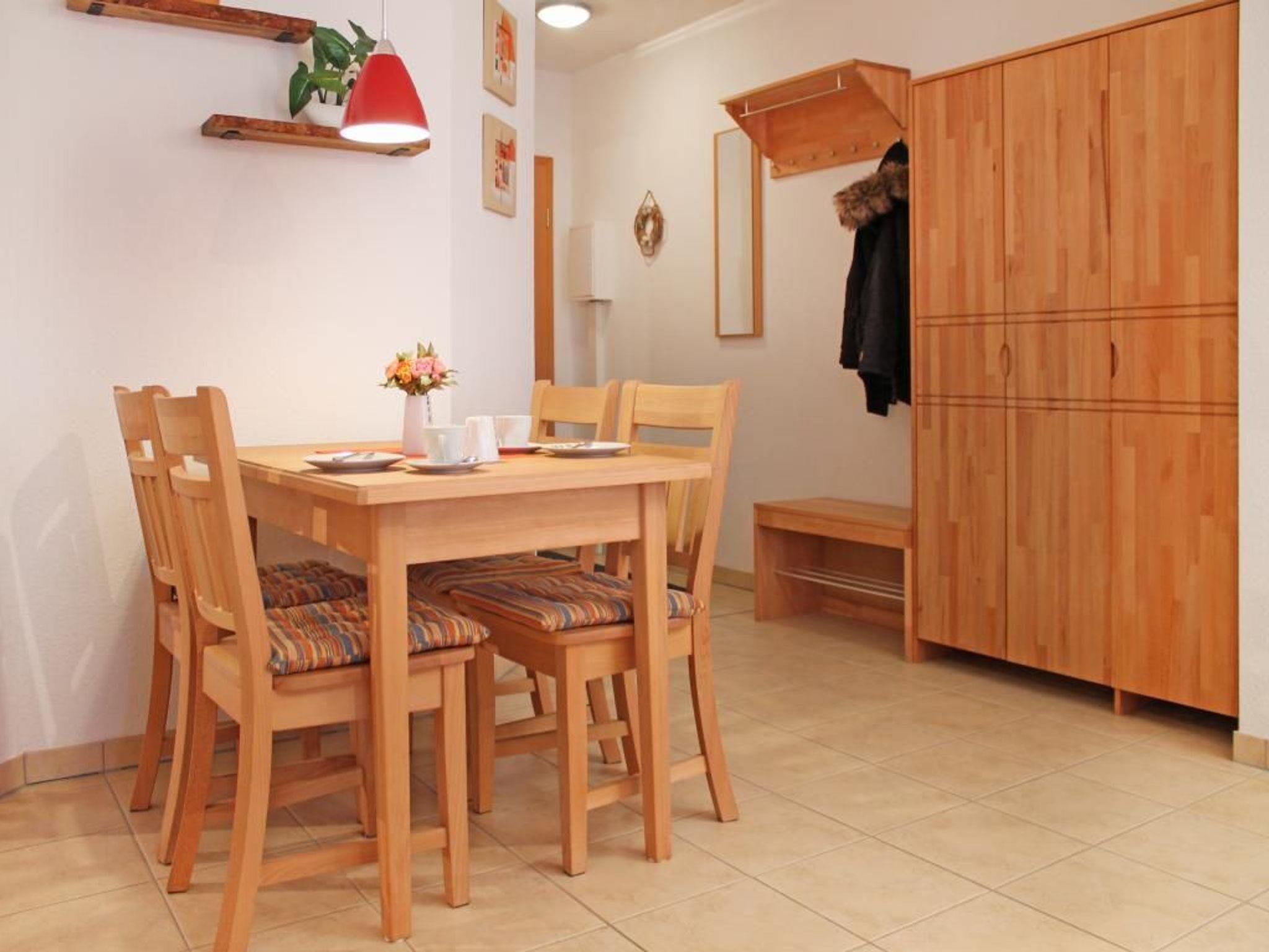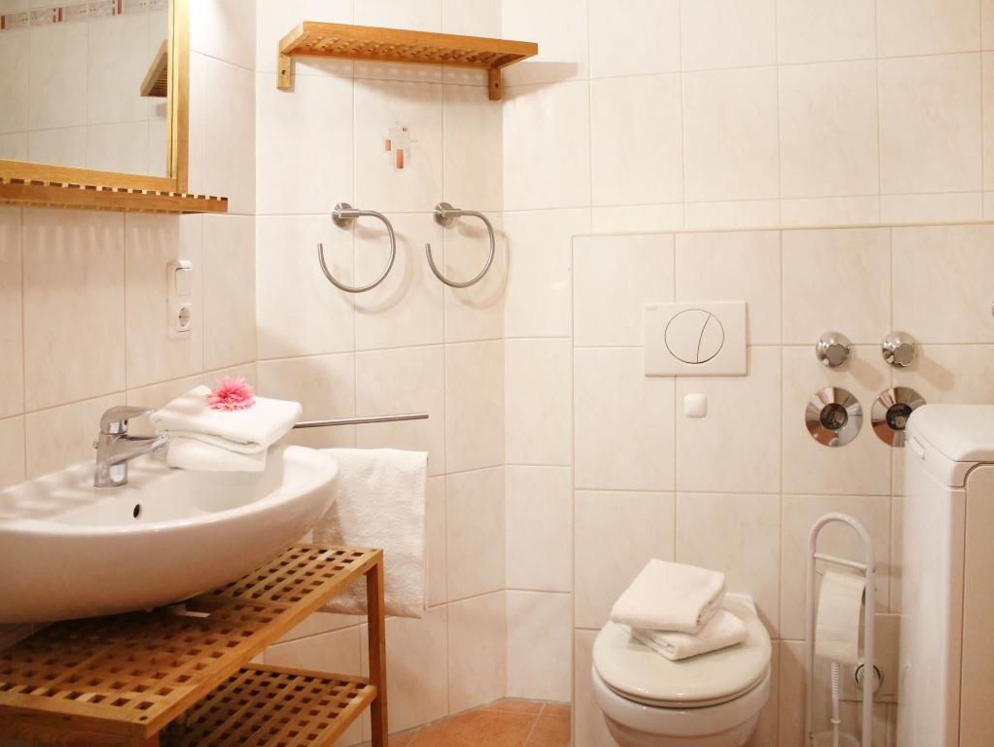 Zugehörig ist ein Duschbad mit Waschtisch, Handtuchheizung und WC. Auch eine Waschmaschine kann gegen Gebühr im Münzbetrieb genutzt werden.