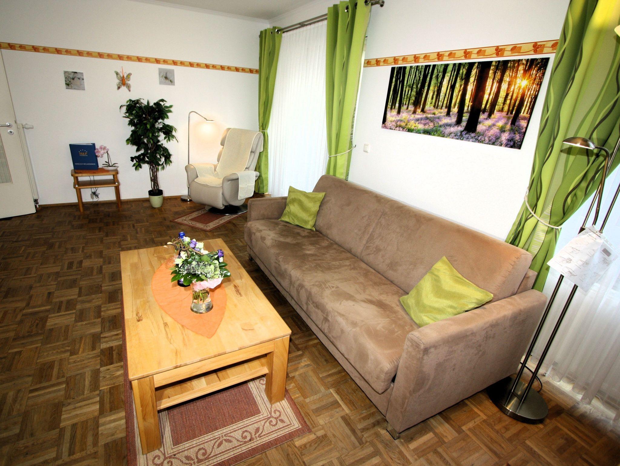 Eine Doppelbettcouch und ein bequemer Sessel laden ein zum Lesen, Entspannen, Genießen und Fernsehen.