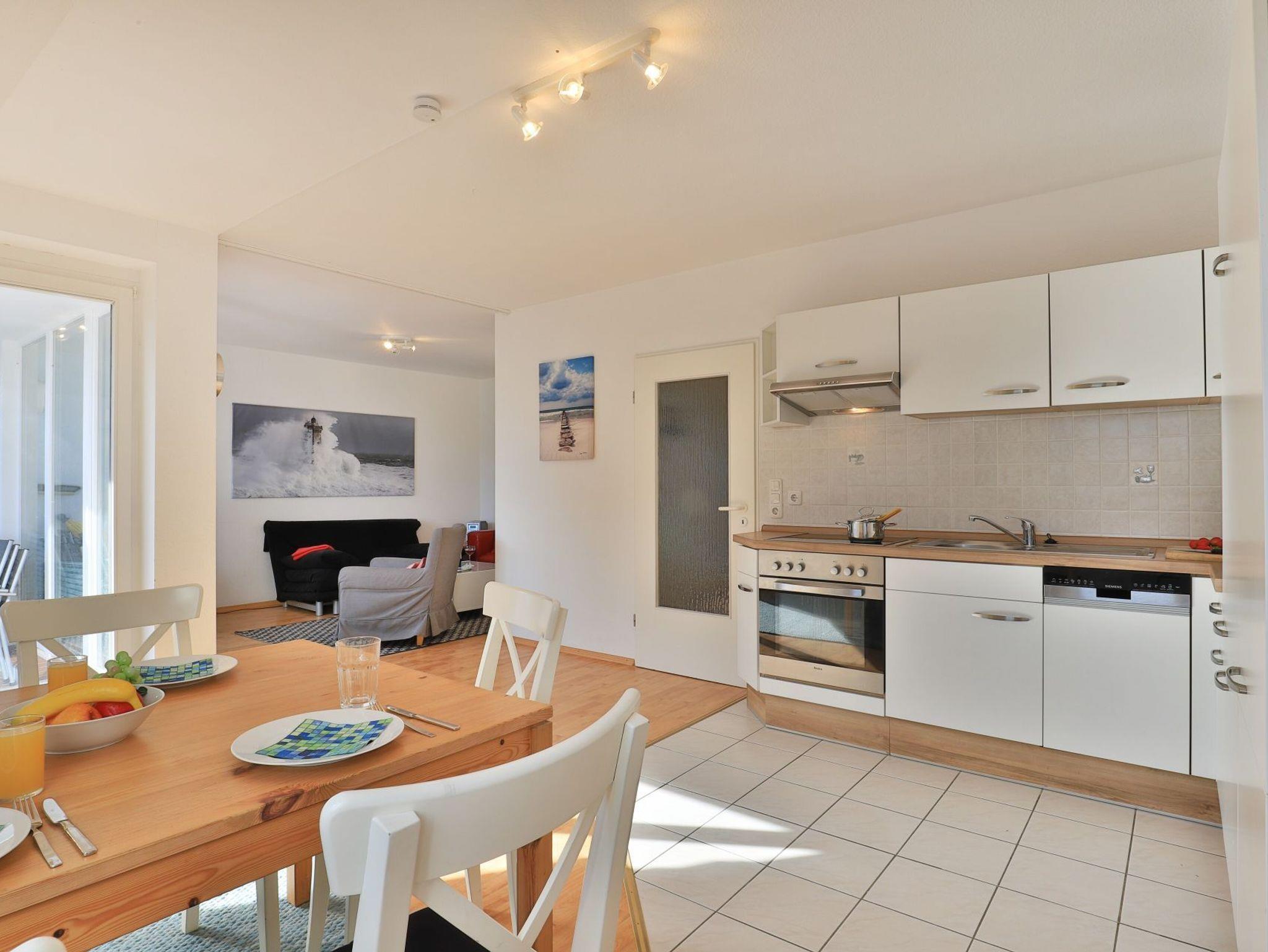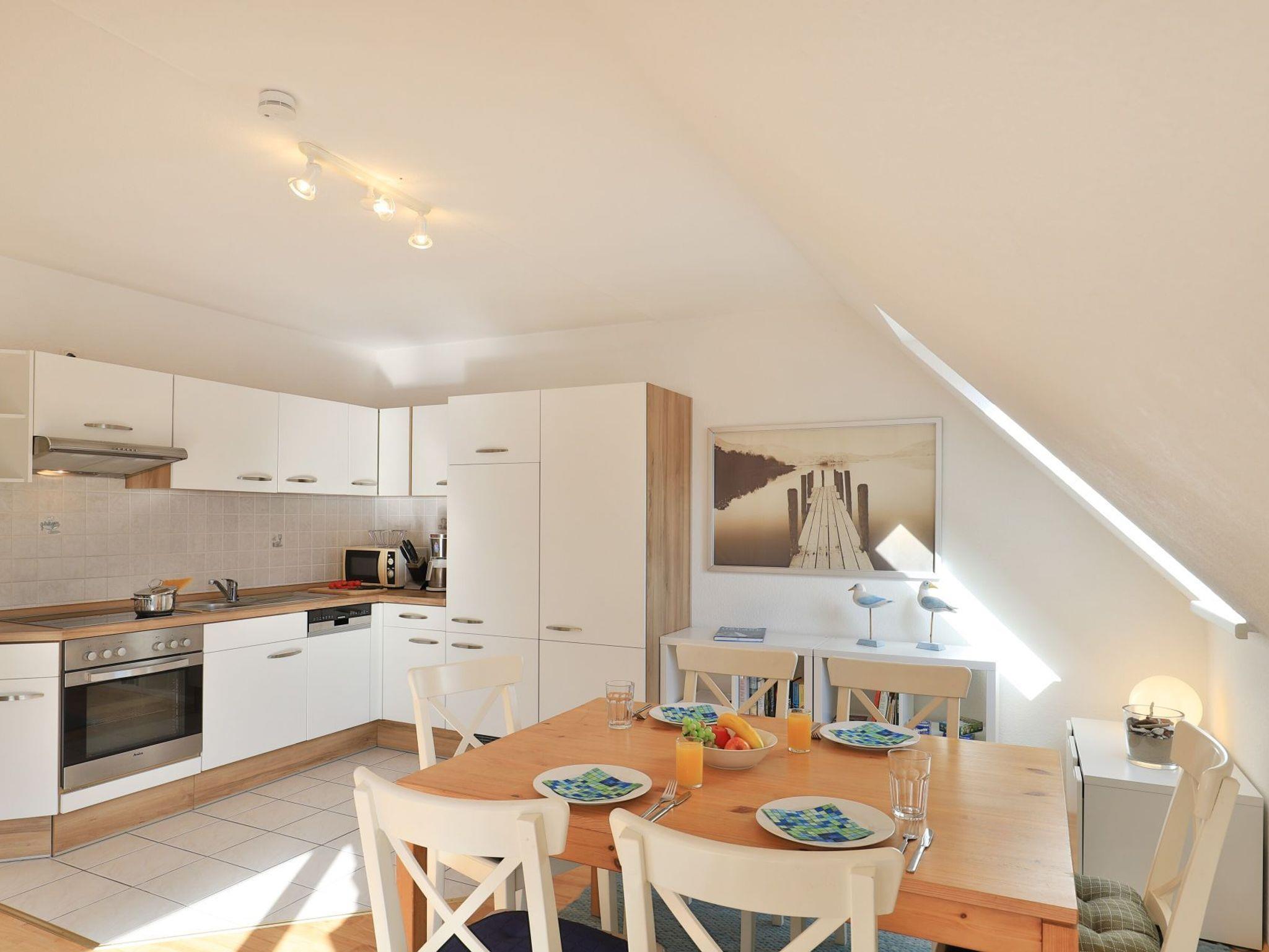Die 3-Zimmer Maisonettenwohnung ?Likedeeler 37? mit Balkon, besitzt eine Wohnfläche von 85qm und ist für eine Belegung mit bis zu 5 Personen bestens geeignet. Diese Wohneinheit befindet sich im 2. Obergeschoss ? Fahrstuhl. Für technische Unterhaltung können Sie den Fernseher, DVD-Player sowie eine Musikanlage nutzen, zudem steht WLAN kostenfrei bereit. Im sehr komfortabel möblierten Wohn-/Essbereich empfängt Sie eine bequeme Sitzgruppe und weiteres Mobiliar. Ebenso ist ein großer Esstisch im Wohnbereich platziert. Die integrierte Wohnküche ist offen gestaltet und ermöglicht die Eigenversorgung mit: Ceranherd, Backofen, Mikrowelle, Dunstabzug, Kühlschrank mit integr. Gefrierfach, Geschirrspüler, Kaffeemaschine, Wasserkocher, Toaster usw. Ihre Urlaubsmahlzeiten können Sie bequem am Esstisch zu sich nehmen. An wärmeren Tagen genießen Sie den saisonal möblierten Balkon in östliche Ausrichtung zum Innenbereich der Appartementanlage. Über eine geschwungene Wohnraumtreppe erreichen Sie zwei separate Schlafzimmer, die sich in der oberen Wohnebene befinden. Einer der Schlafbereiche ist mit einem Doppelbett, Kleiderschrank eingerichtet. Im zweiten Schlafzimmer bzw. Kinderzimmer, erwartet Sie ein Etagenbett und ein Einzelbett. Für Familien mit Kleinkind befindet sich ein Kinderreisebett und ein Kinderhochstuhl in der Wohnung. Die Ferienwohnung bietet Ihnen ein modernisiertes Duschbad mit Waschtisch, WC. Zusätzlich ist ein Gäste-WC mit Dusche vorhanden. Hausgäste können im Untergeschoss sowohl Waschmaschine als auch Wäschetrockner gegen Gebühr nutzen. Ihr Fahrzeug parken Sie in der hauseigenen Tiefgarage auf einem fest zugeordneten Stellplatz. Mit dem Fahrstuhl gelangen Sie bequem zu den Wohnungsetagen. Im Haus gibt es eine gemeinschaftlich nutzbare Fahrrad Abstellmöglichkeit.