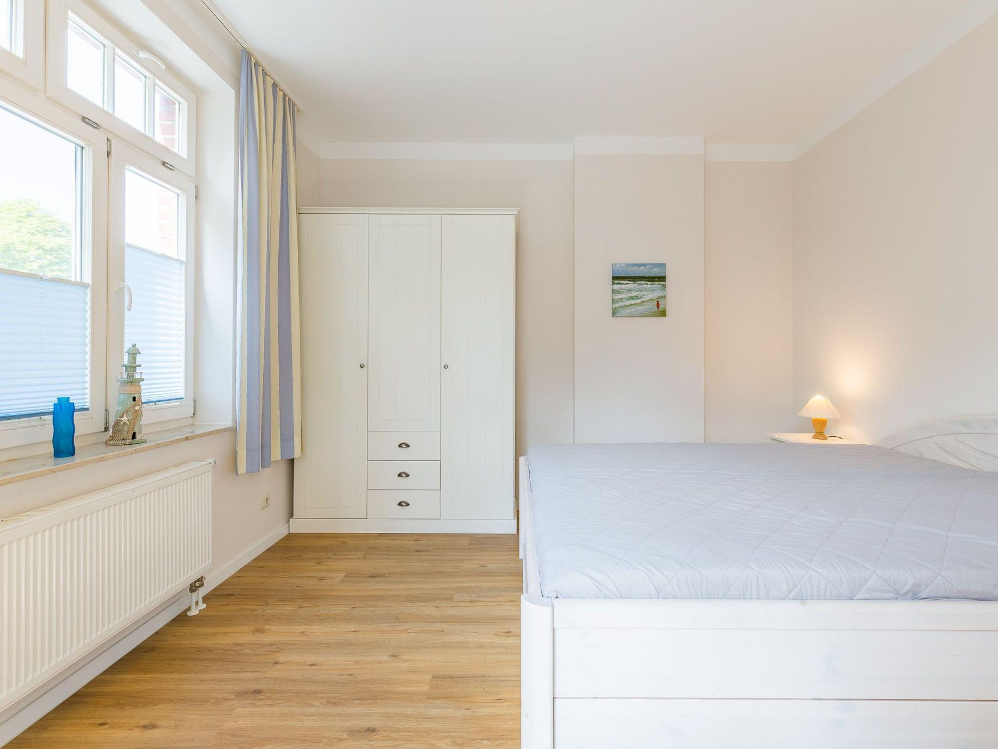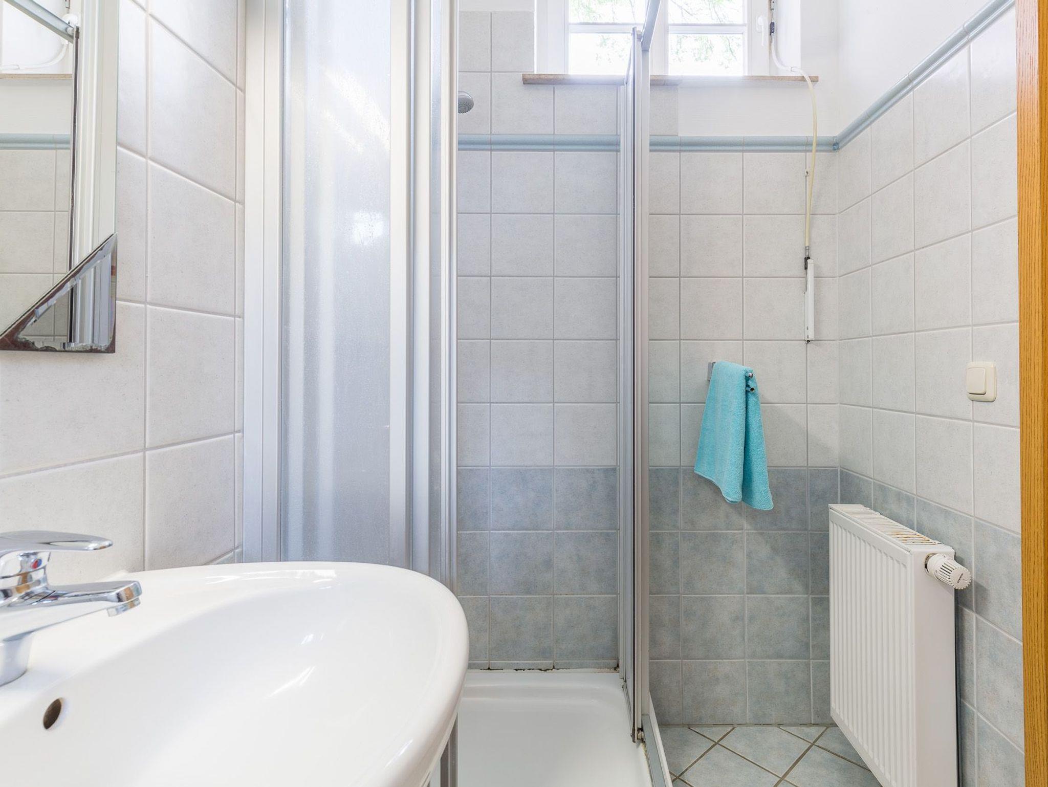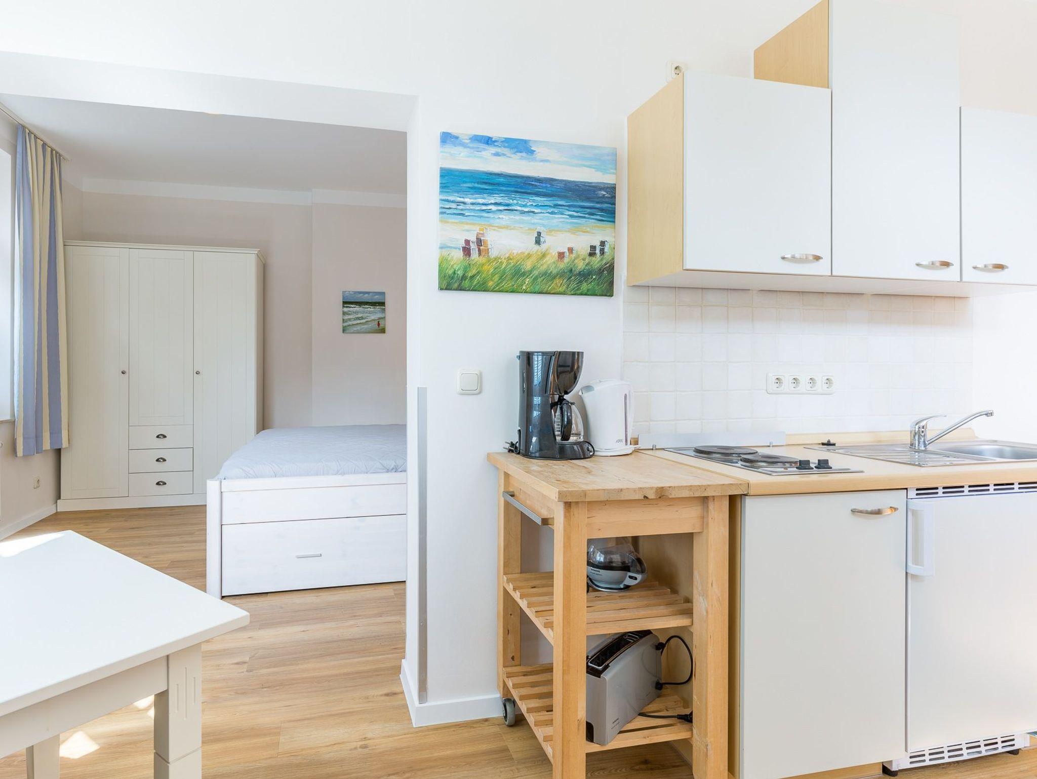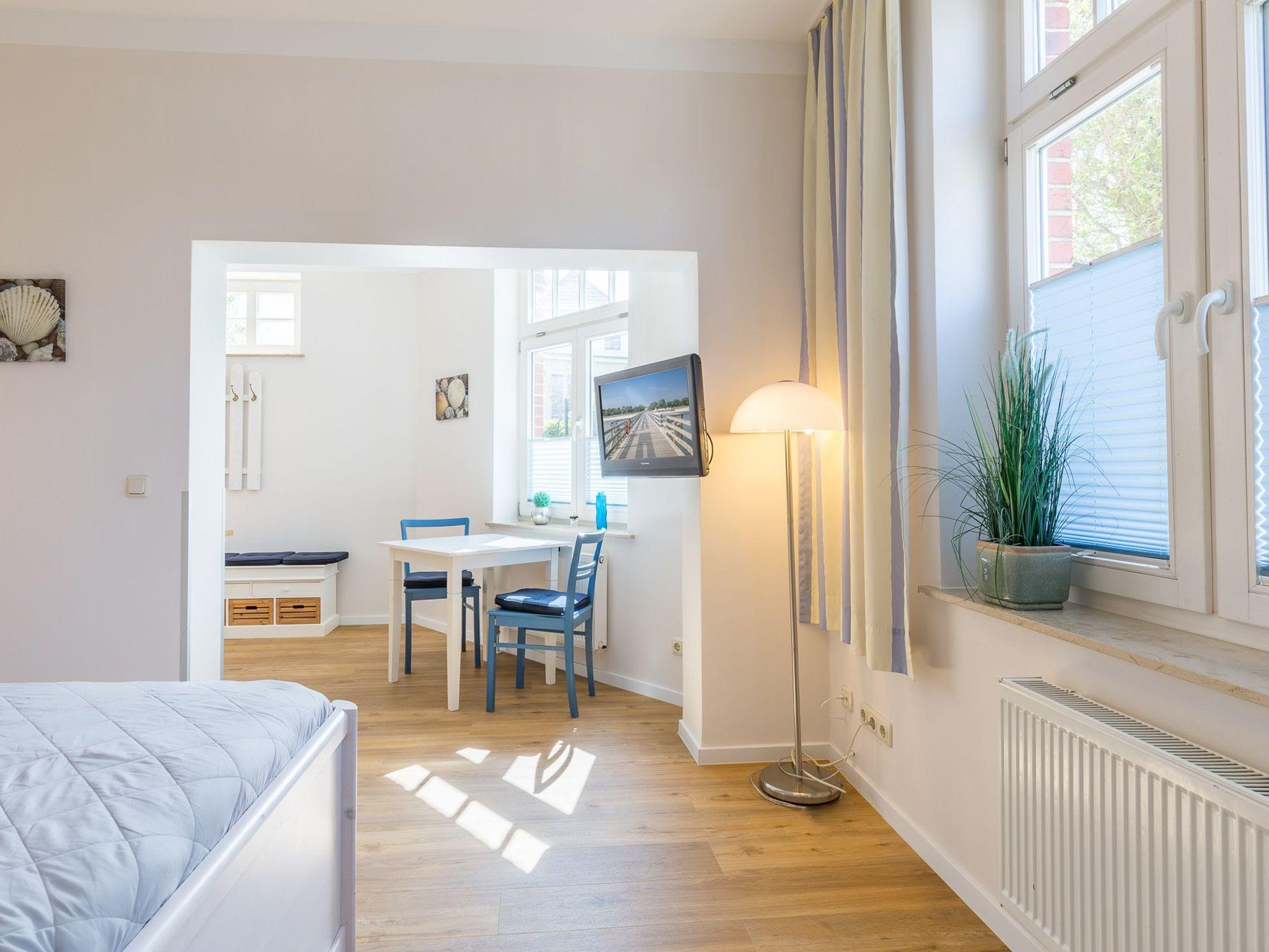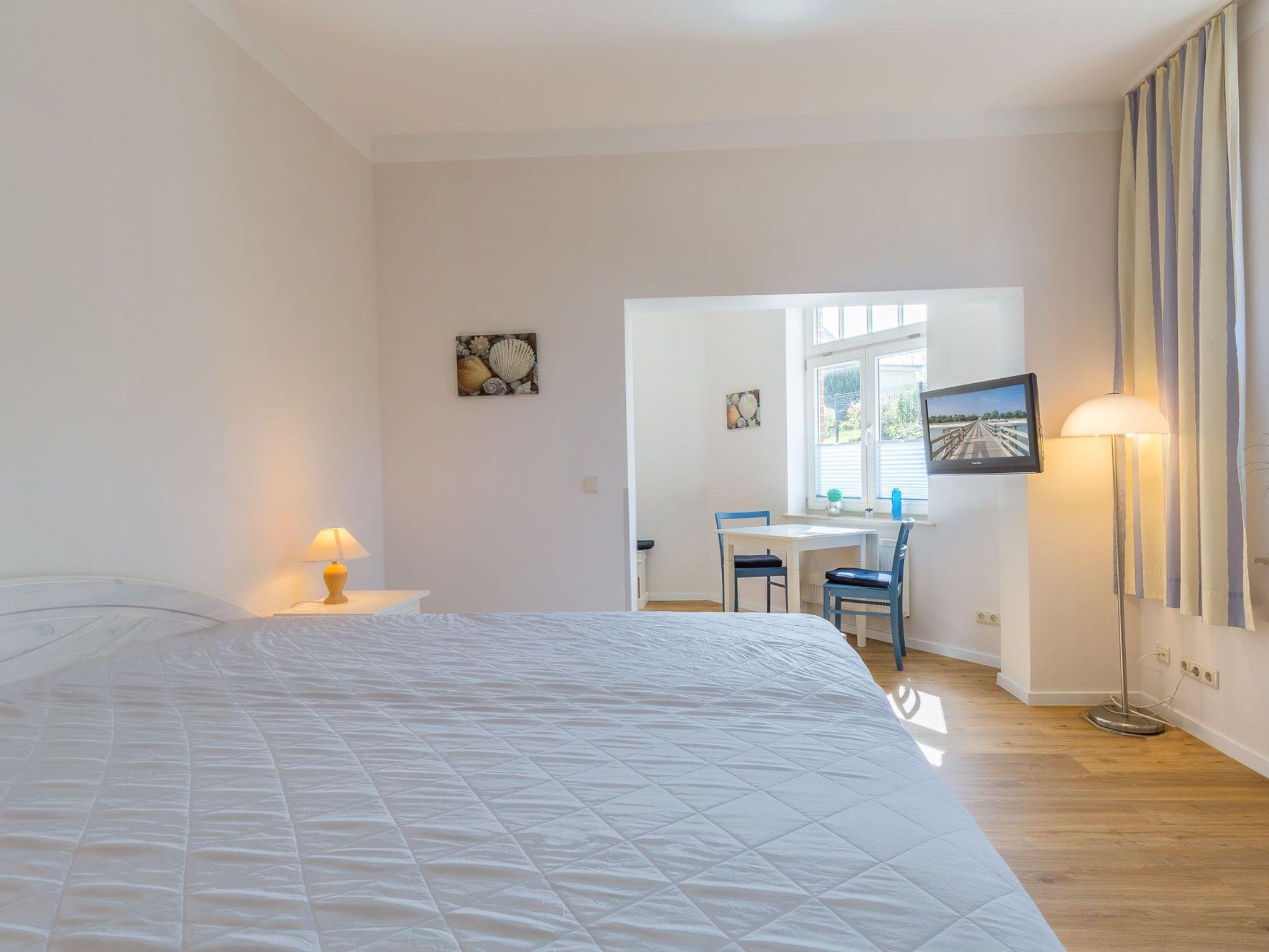 Die Ferienwohnung 04 im Erdgeschoss bietet mit einem kombinierten Wohn- und Schlafzimmer mit Doppelbett Platz für 2 Personen. Der große Flachbild-TV sorgt für Unterhaltung an Regentagen. Die Ferienwohnung verfügt über eine kleine Küchenzeile im Eingangsbereich mit 2-Platten-Herd und Kühlschrank sowie ein Badezimmer mit Dusche und WC. Den großen Garten mit Grillmöglichkeit können alle Gäste des Hauses gern nutzen. Ihren PKW können Sie auf der freien Fläche zur Gartenseite abstellen.