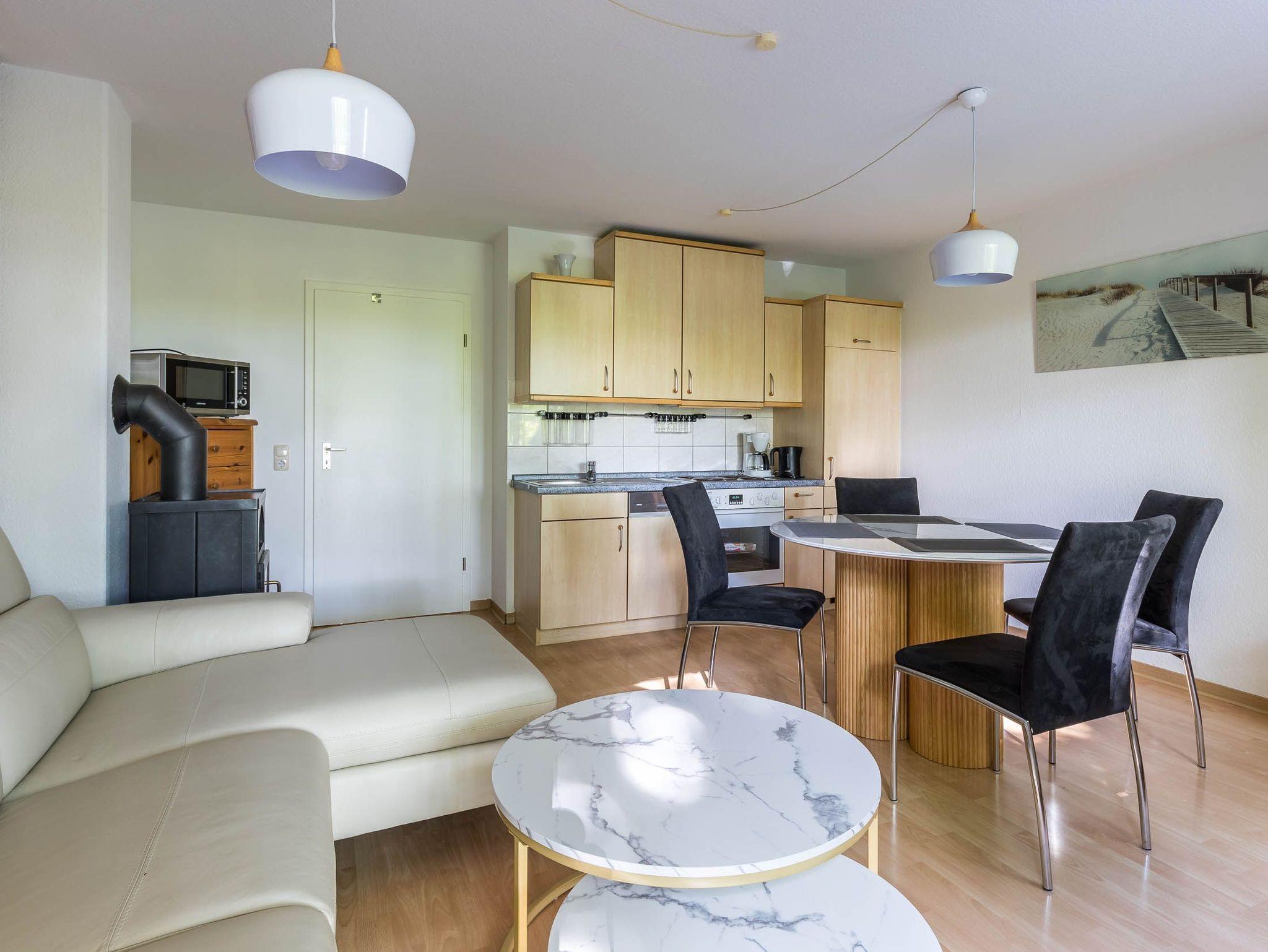 Das familienfreundliche Ferienhaus im Grünen bietet die ideale Unterkunft für einen erholsamen Urlaub an der Ostsee. Es bietet Platz für 2-4 Gäste und verfügt über ein Badzimmer. Die offene Küche ist mit einem Kühlschrank mit Gefrierfach, Geschirrspüler und Backofen ausgestattet. Im Wohnbereich sorgt ein Kamin für Wärme und Gemütlichkeit an kälteren Tagen. Im Dachgeschoss befindet sich das größere Schlafzimmer mit einem bequemen Doppelbett, TV und großem Kleiderschrank. Ein weiteres Schlafzimmer mit zwei Einzelbetten und einer Kommode befindet sich im Erdgeschoss. Das angrenzende Duschbad verfügt über eine Waschmaschine. Die Gäste können die schöne Luft der Ostsee auf der möblierten Terrasse genießen und ihre Fahrräder in einem abschließbaren Abstellhäuschen unterstellen. Ein kostenloser Pkw-Stellplatz ist ebenfalls vorhanden und auf dem Gelände gibt es einen Kinderspielplatz.