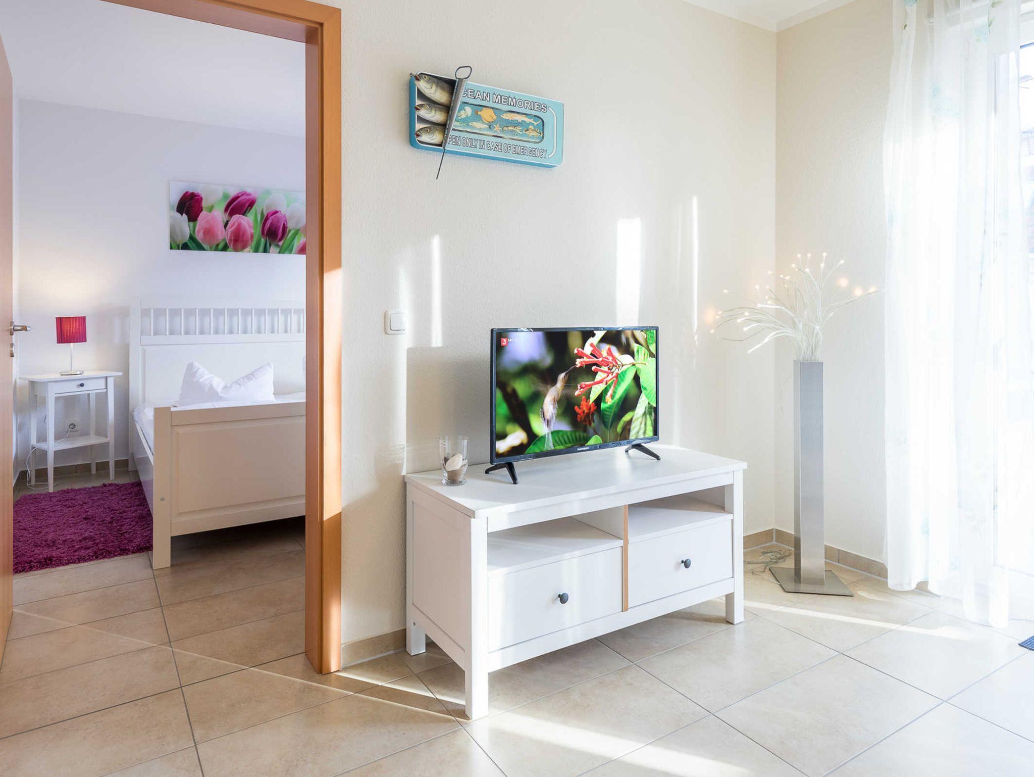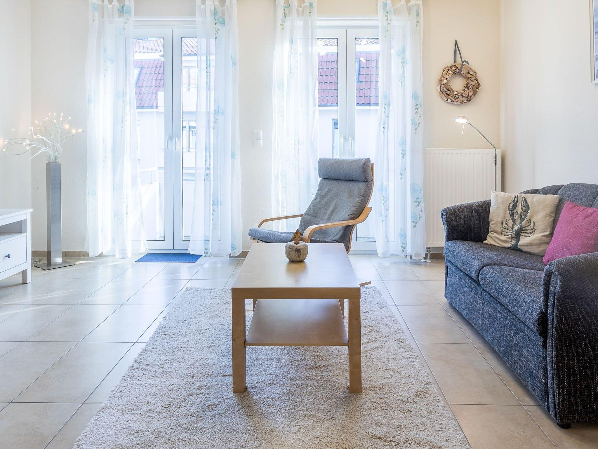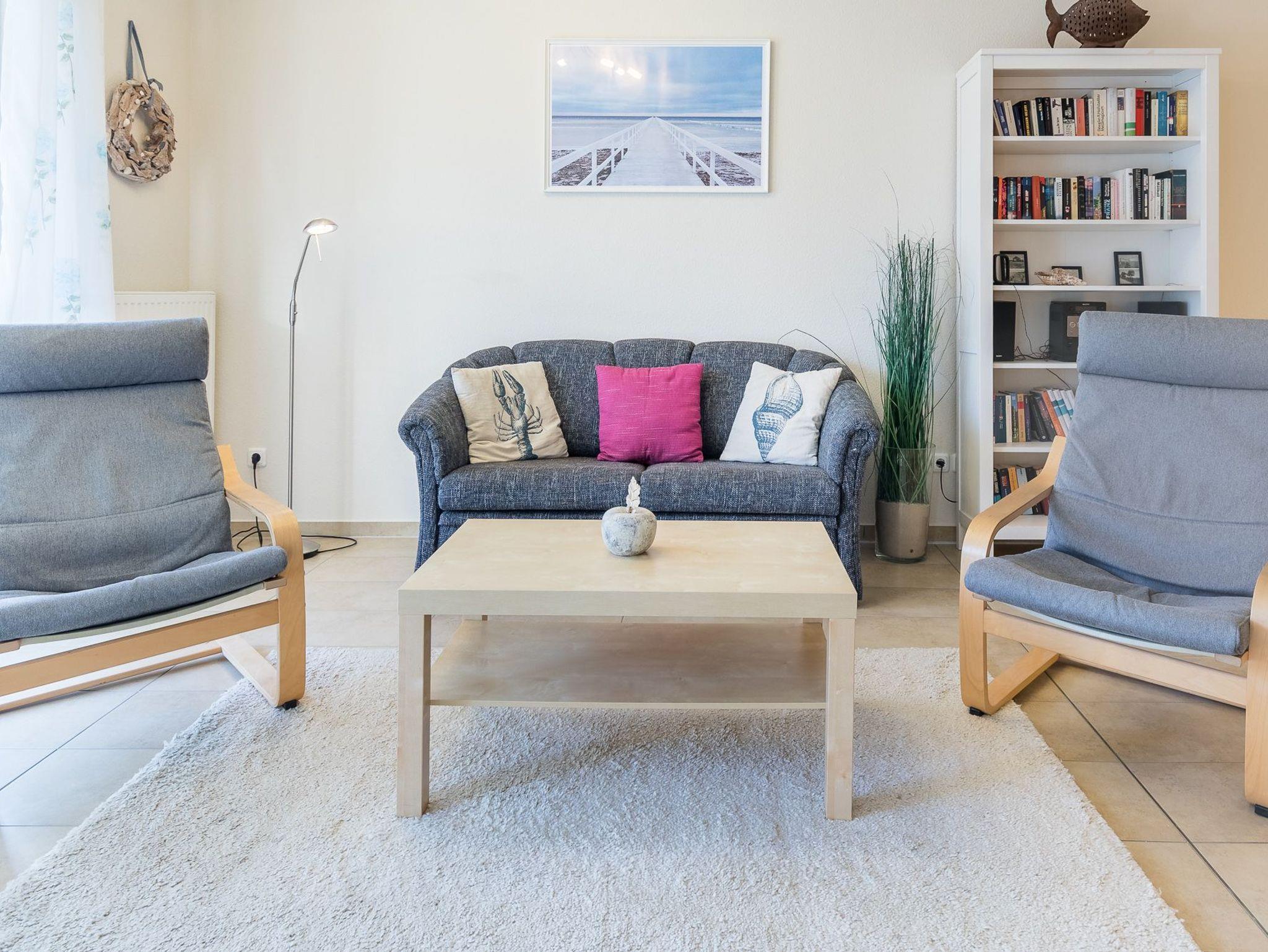 Das besteht aus einem Sofa mit Leselampe, zwei Sesseln, einem Couchtisch zum Füße hochlegen oder gemeinsamen Spielen, einer Stereoanlage mit Radio, CD Player und USB-Anschluss, einem Flatscreen-Fernseher und ? unverzichtbar im Urlaub! ? einem Bücherregal mit über 100 Büchern. Was immer Sie gern lesen, ob anspruchsvolle Literatur, Sachbücher, Krimi oder Kochbücher: Hier werden Sie fündig. Und wenn das Buch bis zum Urlaubsende nicht ausgelesen ist: kein Problem ? wenn Sie dafür ein anderes dalassen, dürfen Sie?s gern mitnehmen. Das Sofa ist ausziehbar und bietet Platz für zwei weitere Gäste (Liegemaße ausgezogen 130x200cm). Die beiden hohen Fenstertüren, durch die Sie auf den Balkon treten, lassen viel Licht und Seeluft herein: Bei entsprechendem Wetter ist die ganze Wohnung sonnendurchflutet.