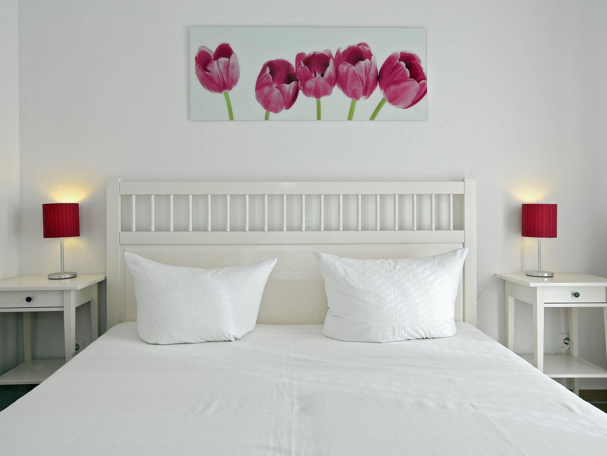Im Schlafzimmer mit dem breiten, bequemen Doppelbett (mit zwei Matratzen), welches nach Osten geht, können Sie müssen aber nicht! sich von der Morgensonne wecken lassen.