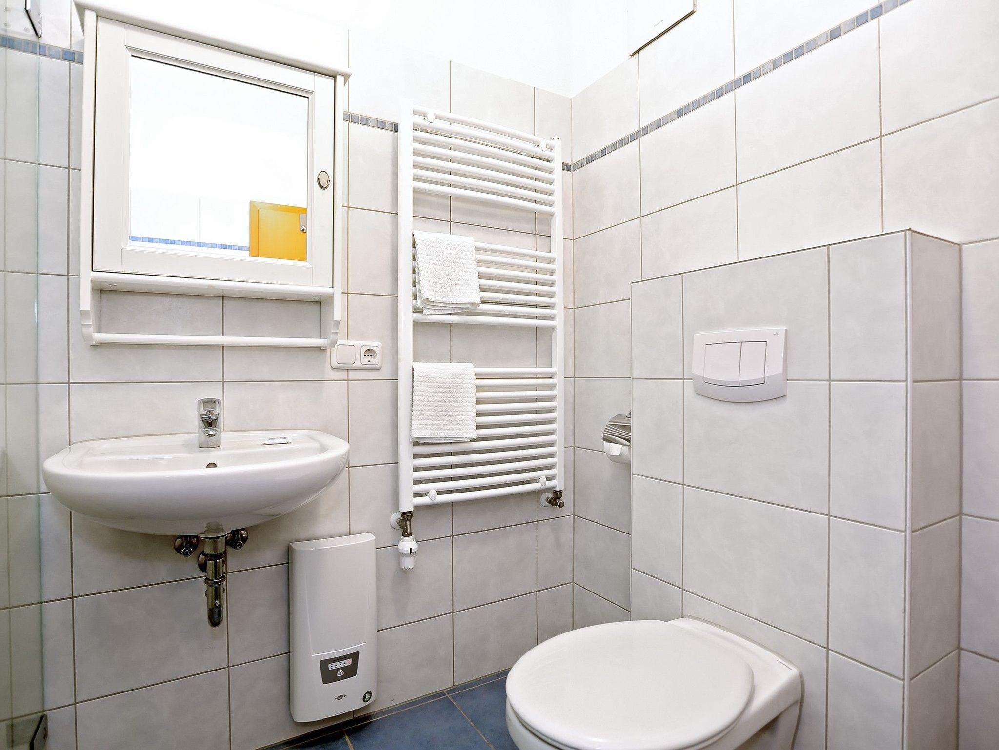 Das Badezimmer ist weiß und blau gefliest und hat neben Waschbecken, Badschrank und WC eine ebenerdige, angenehm geräumige Dusche und einen Handtuchheizkörper.