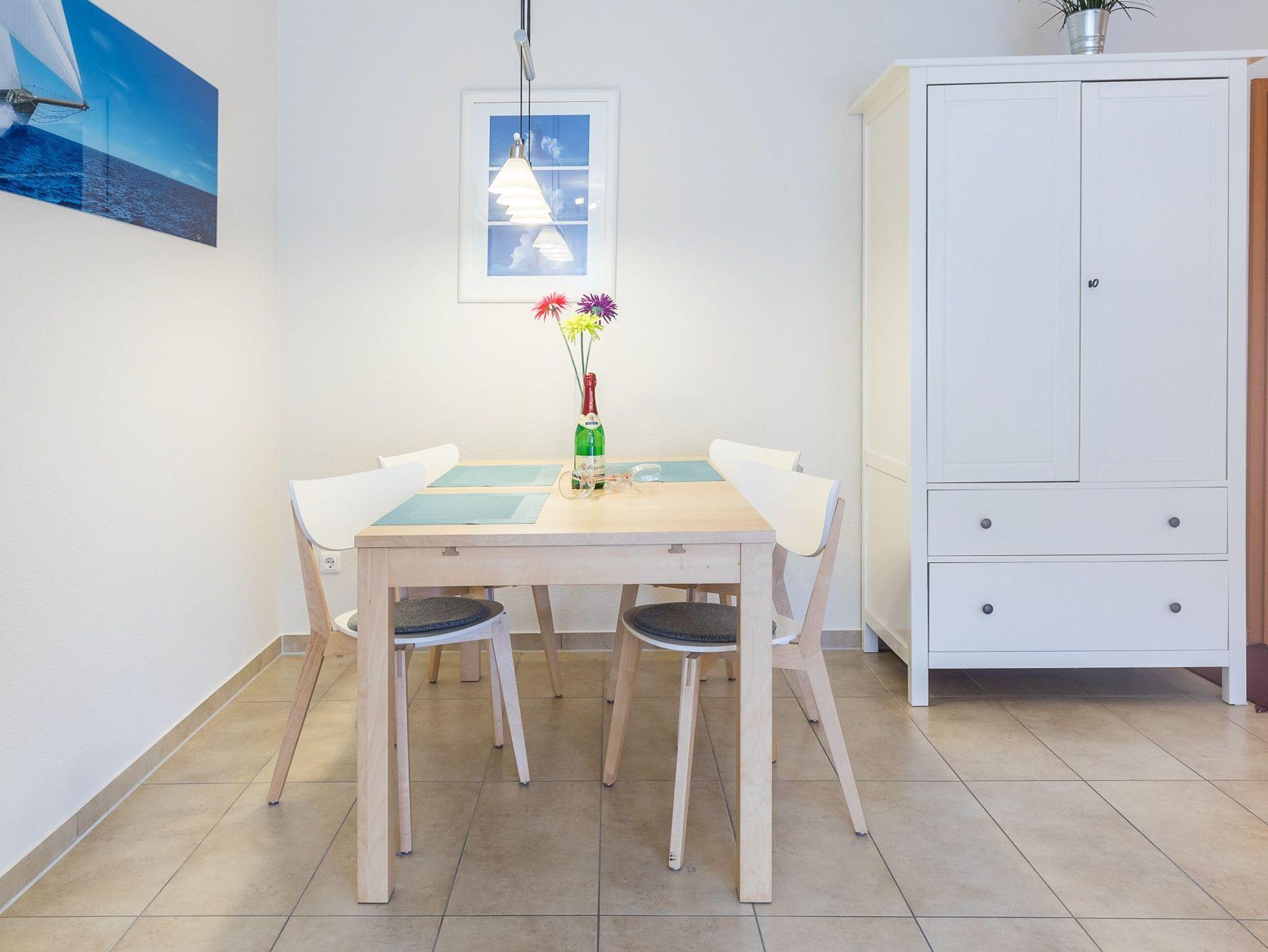 In der Küche haben Sie allen modernen Komfort: Geschirrspüler, Herd mit Cerankochfeld und Backofen, Kühlschrank, Mikrowelle, Kaffee- und Espressomaschine, Toaster; ferner ausreichend Geschirr, Gläser, Besteck, Töpfe und Pfanne und was Sie sonst brauchen. Kurz und kommunikationsfreundlich ist der Übergang von der Küche zum Essbereich Tisch und vier Stühle aus hellem Holz und daran anschließend zum eigentlichen Wohnzimmer: