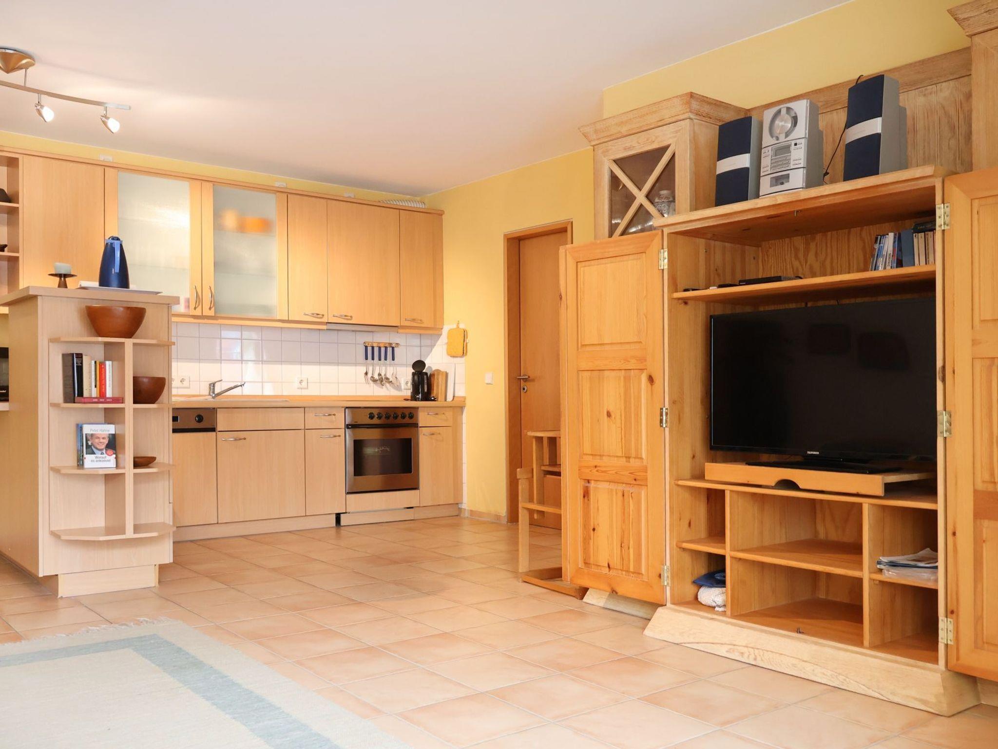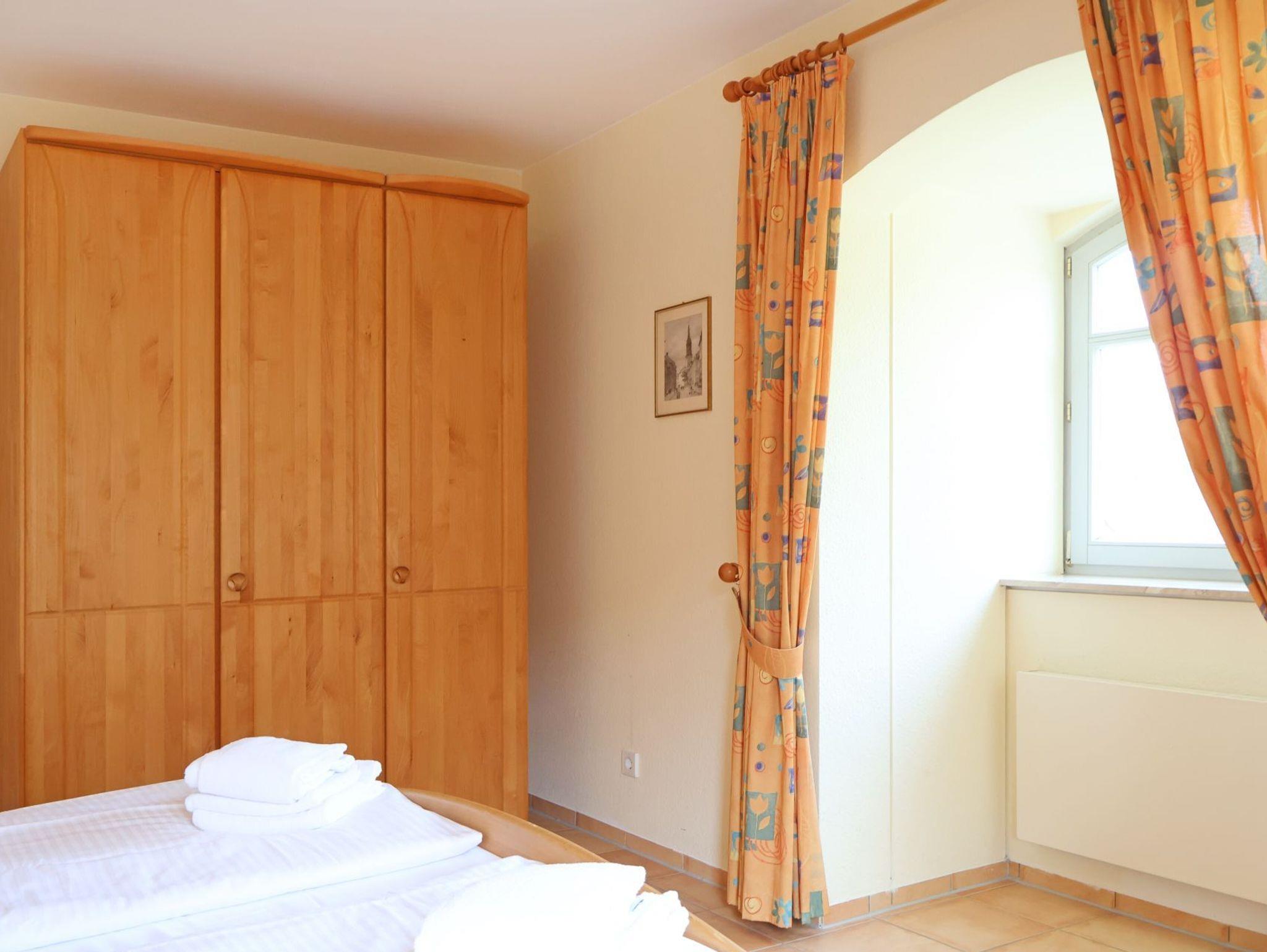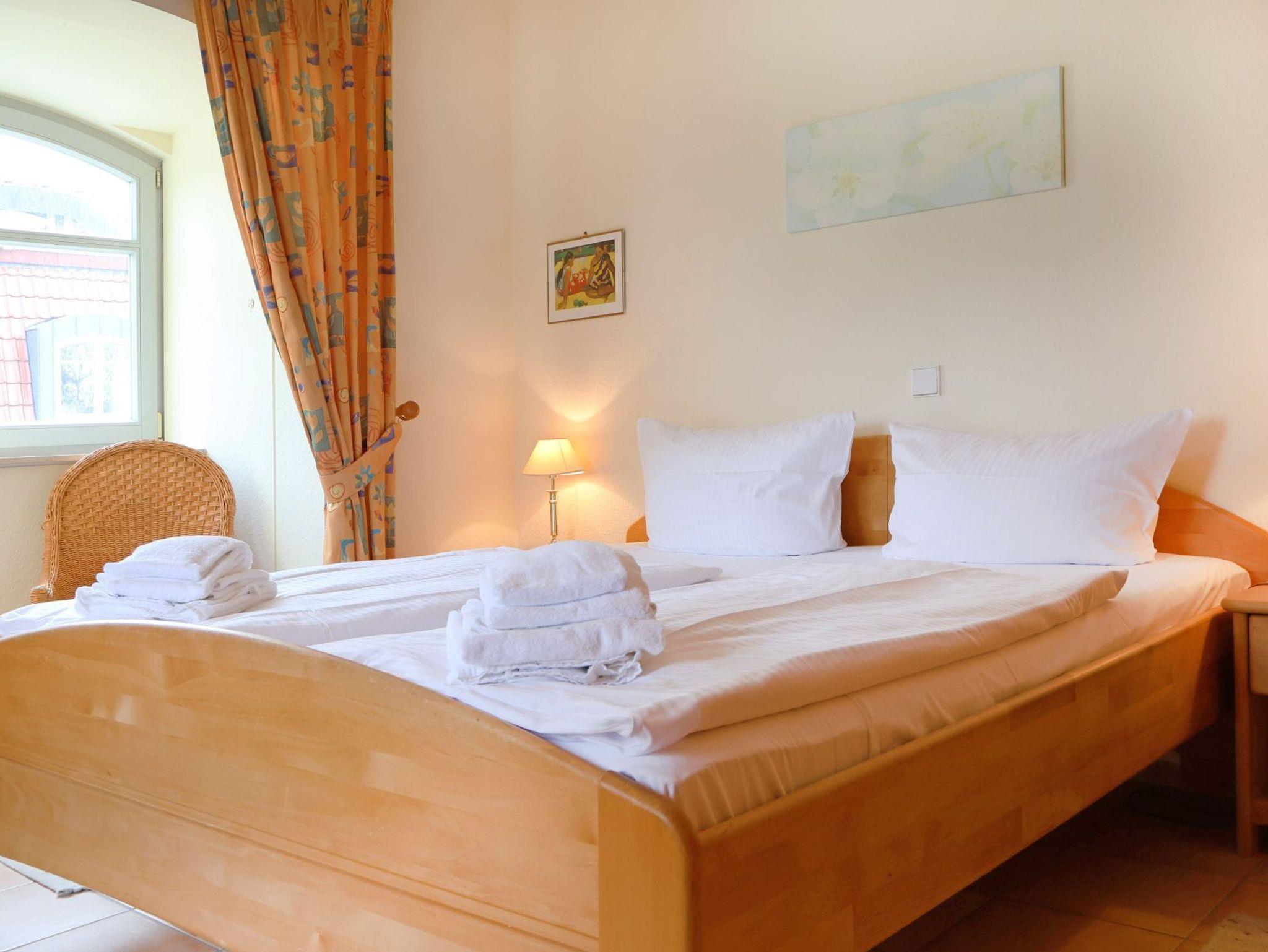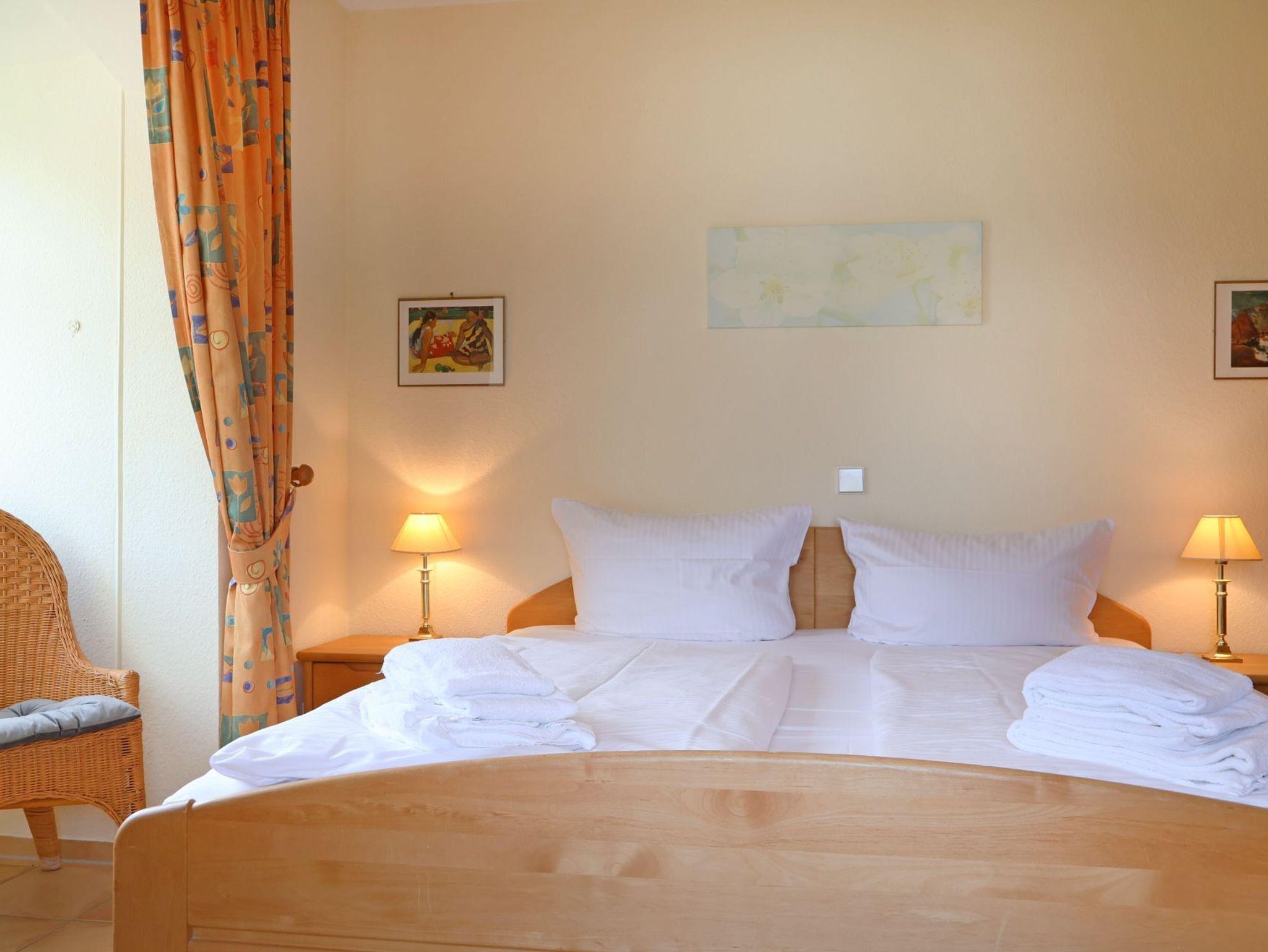 Für bis zu 2 Personen ist das im 1. Obergeschoss liegende mit 61m² Wohnfläche, sehr geräumige Komfort 2-Zimmer Appartement mit Balkon und Blick ins Grüne bestens ausgestattet. Es erwartet Sie ein heller Wohnbereich mit großen Fensterbögen sowie integrierter, vollständig ausgestatteter Küchenzeile ? wo Geschirrspüler, Kaffeemaschine (Senseo), Mikrowelle Ceranherd die Zubereitung von leckeren Urlaubsmahlzeiten unterstützen. Gemütliche Stunden verspricht die bequeme Couch und lädt zum Fernsehen (DVD), Lesen oder Musikhören ein. Ein separates Schlafzimmer bietet Entspannung mit Doppelbett, Sessel und geräumigem Kleiderschrank. In dem hell gefliesten Duschbad mit Fenster, können Sie eine Waschmaschine kostenfrei nutzen. Bei Anreise sind die Betten bereits bezogen und Handtücher liegen bereit. Gemeinschaftsabstellraum für Fahrräder.