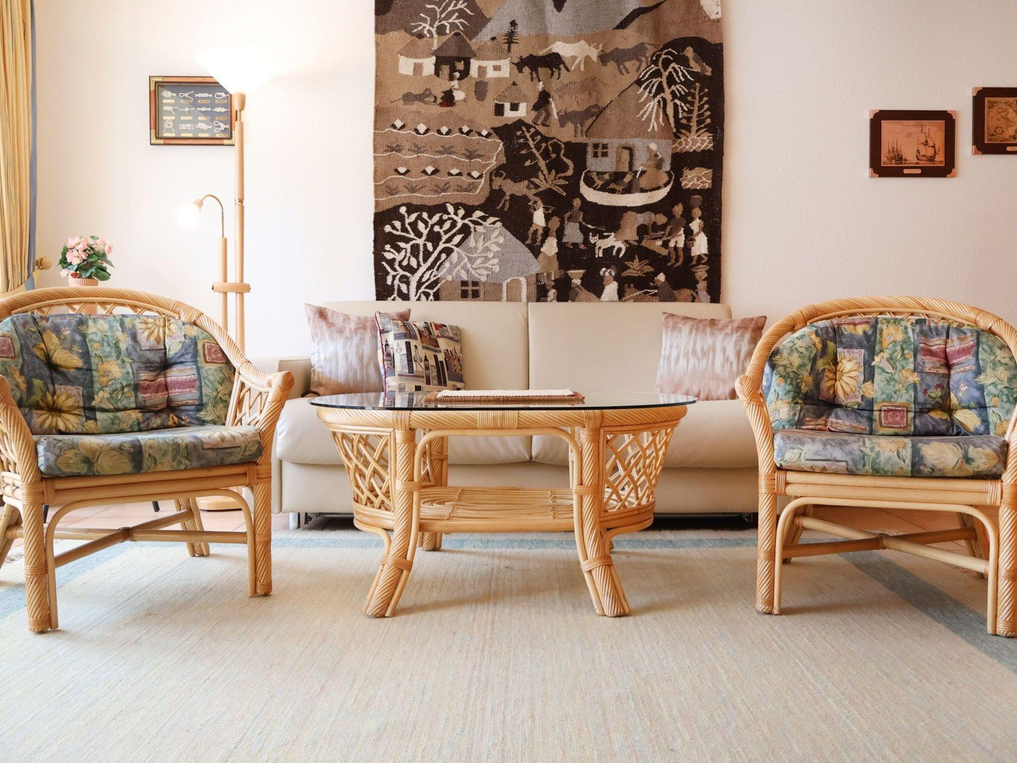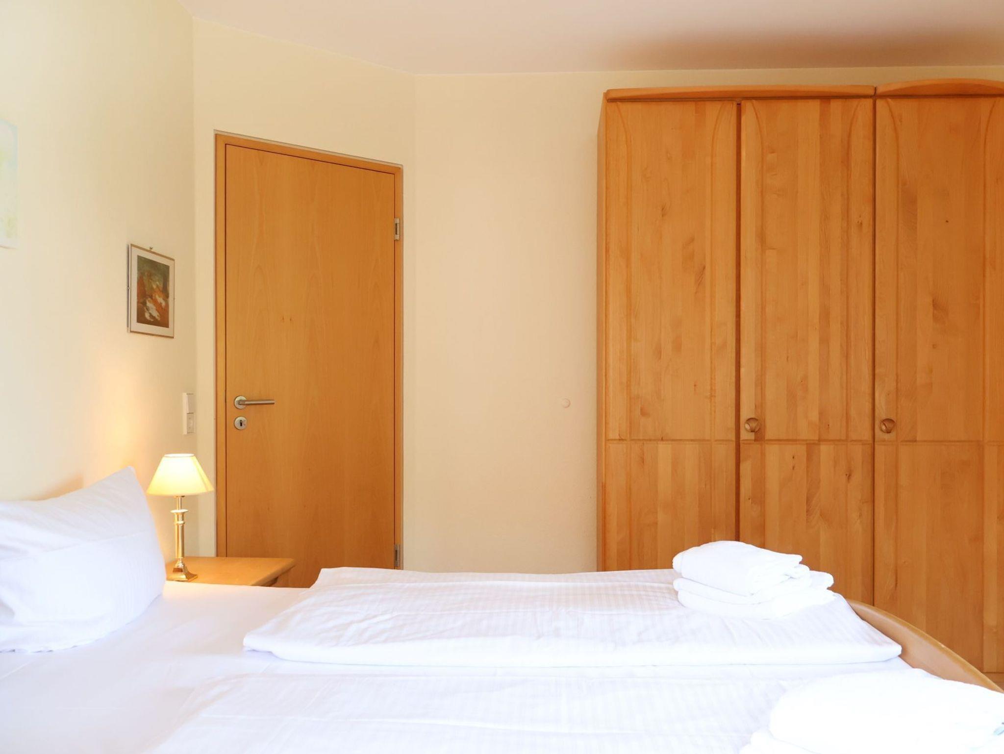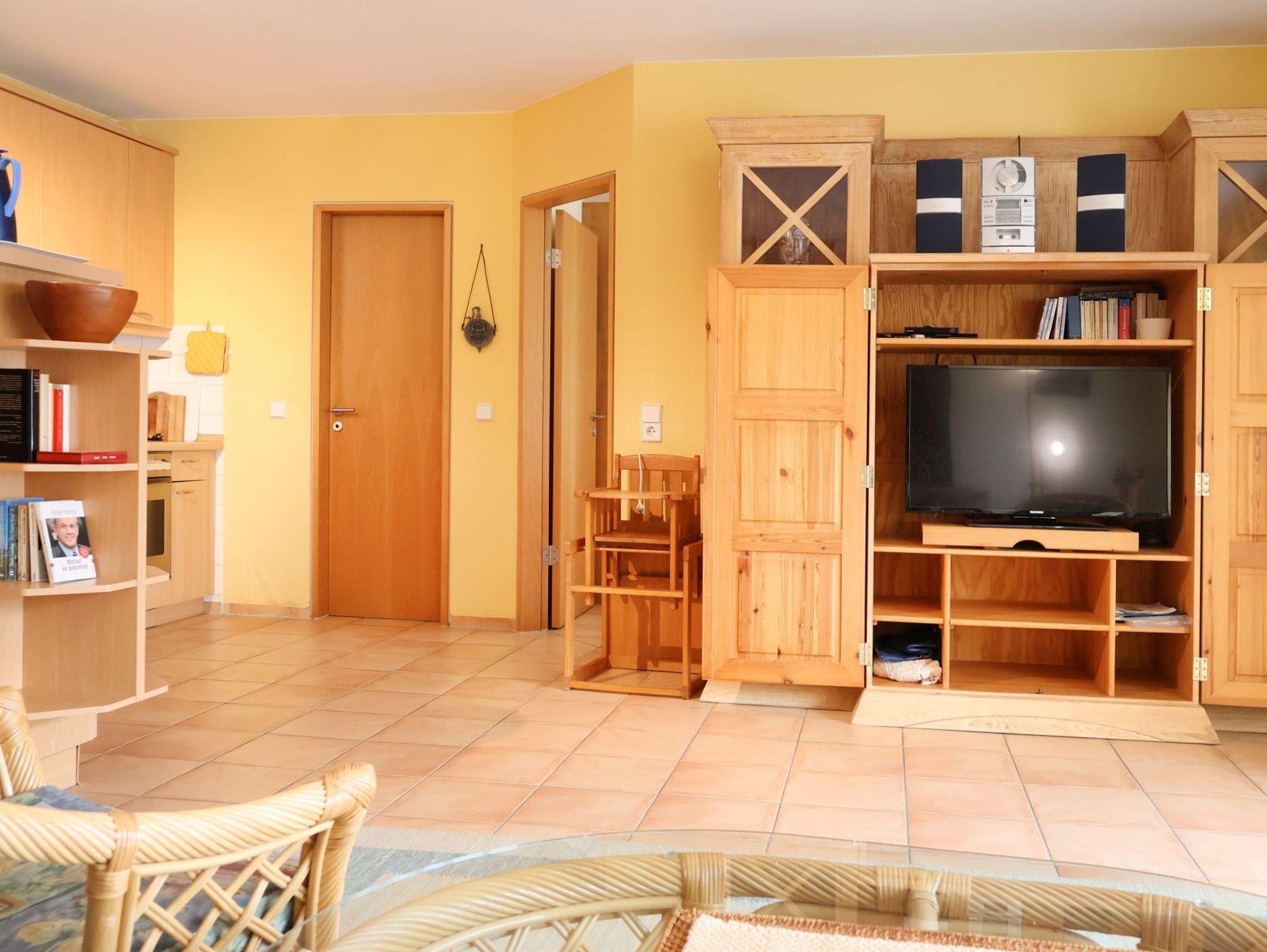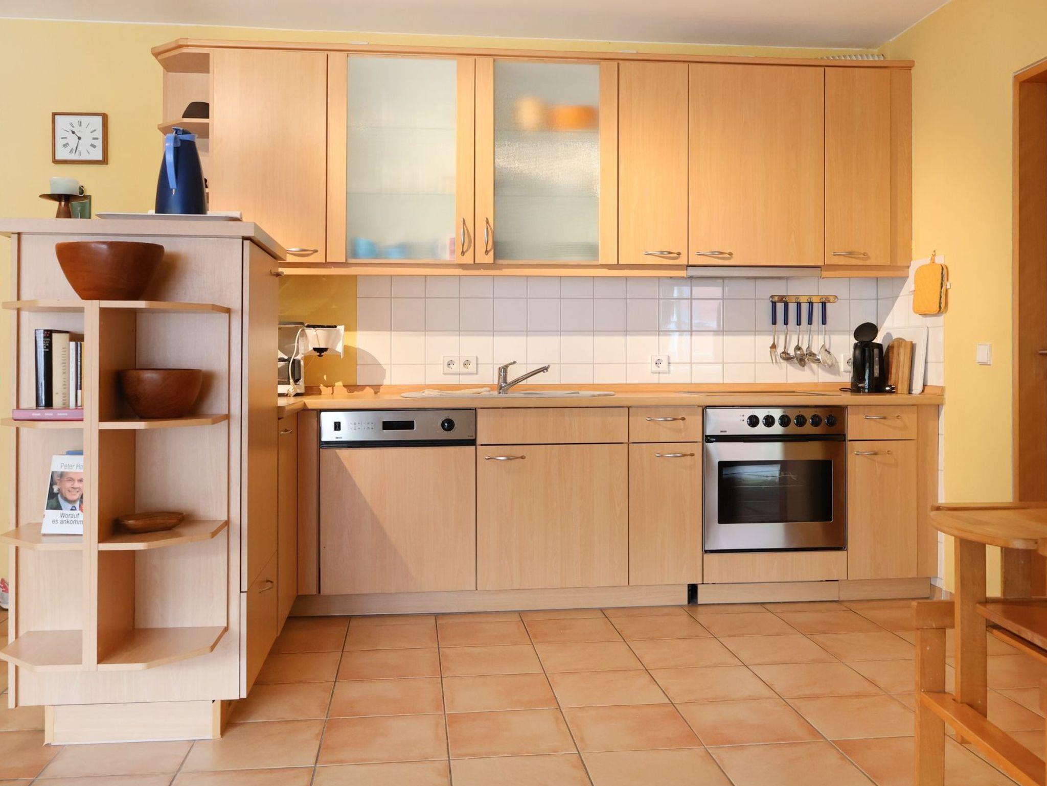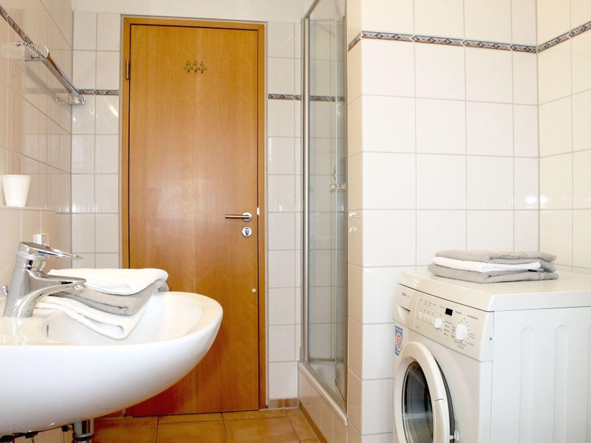 Für bis zu 2 Personen ist das im 1. Obergeschoss liegende mit 61m² Wohnfläche, sehr geräumige Komfort 2-Zimmer Appartement mit Balkon und Blick ins Grüne bestens ausgestattet. Es erwartet Sie ein heller Wohnbereich mit großen Fensterbögen sowie integrierter, vollständig ausgestatteter Küchenzeile ? wo Geschirrspüler, Kaffeemaschine (Senseo), Mikrowelle Ceranherd die Zubereitung von leckeren Urlaubsmahlzeiten unterstützen. Gemütliche Stunden verspricht die bequeme Couch und lädt zum Fernsehen (DVD), Lesen oder Musikhören ein. Ein separates Schlafzimmer bietet Entspannung mit Doppelbett, Sessel und geräumigem Kleiderschrank. In dem hell gefliesten Duschbad mit Fenster, können Sie eine Waschmaschine kostenfrei nutzen. Bei Anreise sind die Betten bereits bezogen und Handtücher liegen bereit. Gemeinschaftsabstellraum für Fahrräder.