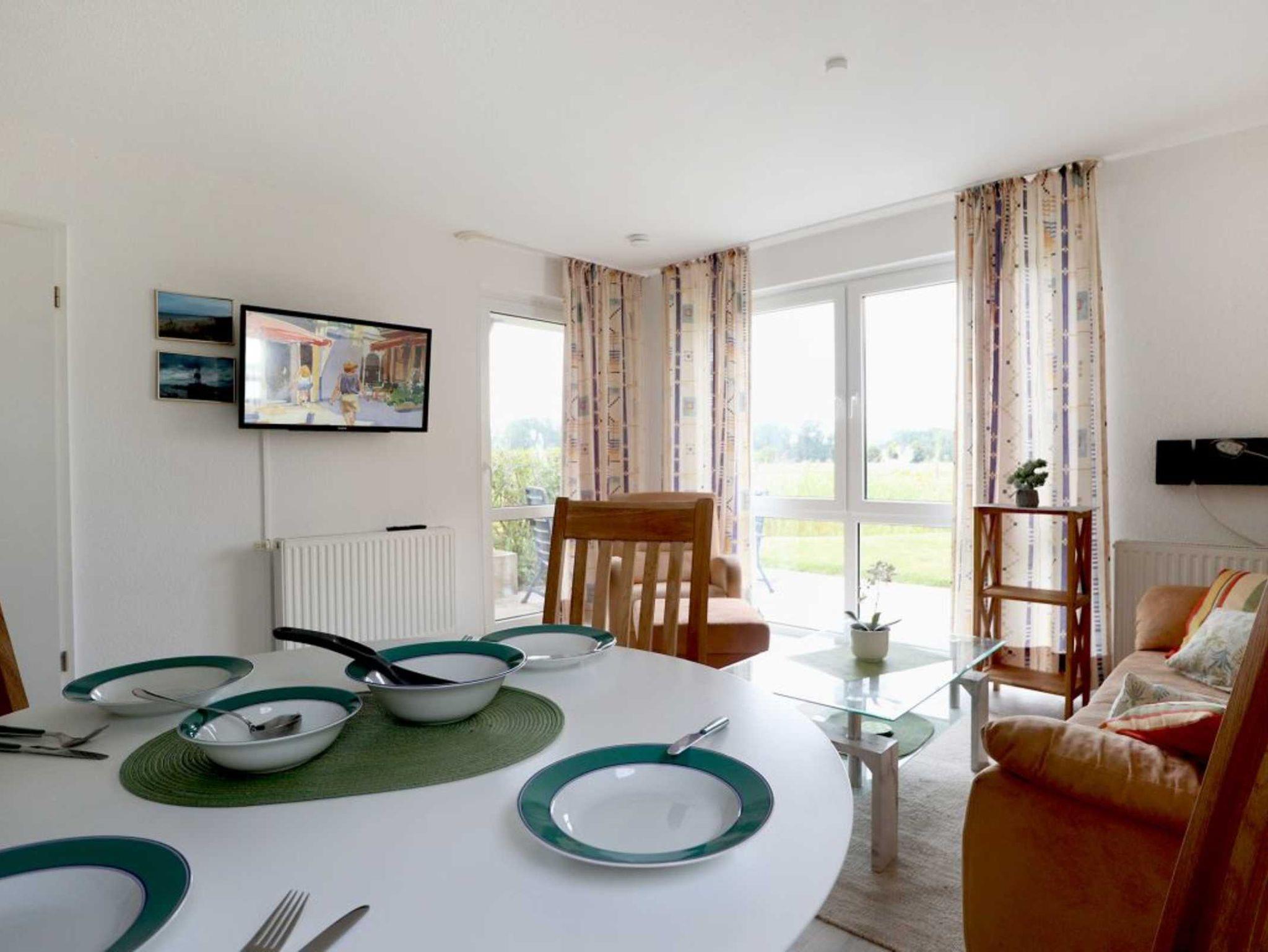 ?Godewind 14? ist ein attraktives 52qm Wohnfläche bietendes 3-Zimmer Erdgeschoss Apartment mit Süd-/West Terrasse und Blick auf umliegende Wiesen. Einkaufsmöglichkeiten sind fußläufig sehr gut erreichbar. Den Strand erreichen Sie in nur 180 Meter. Die behagliche Ferienwohnung Wohnung besitzt einen schönen Wohn-/Essbereich mit Sofa, Flachbild- Fernseher, DVD Player, Musikanlage, WLAN Nutzung, Esstisch. Die offene Küchenzeile ist in dem Wohnbereich integriert und ausgestattet mit Herd, Backofen, Dunstabzug, Mikrowelle, Geschirrspüler, Kaffeemaschine, Toaster u.v.m. Zwei separate Schlafzimmer 1x Doppelbett, Kleiderschrank, Fernseher und 1x Etagenbett ermöglichen entspannte Nächte. Hell gefliest ist das Duschbad in dem kostenfrei eine Waschmaschine bereit steht. Ihren PKW parken Sie ebenso kostenfrei auf dem zur Wohnung gehörenden Außenstellplatz. Ein vorhandener Abstellschuppen dient als Unterstellmöglichkeit für mitgebrachte Fahrräder. Es handelt sich um ein Nichtraucher Apartment indem Haustiere nicht gestattet sind.